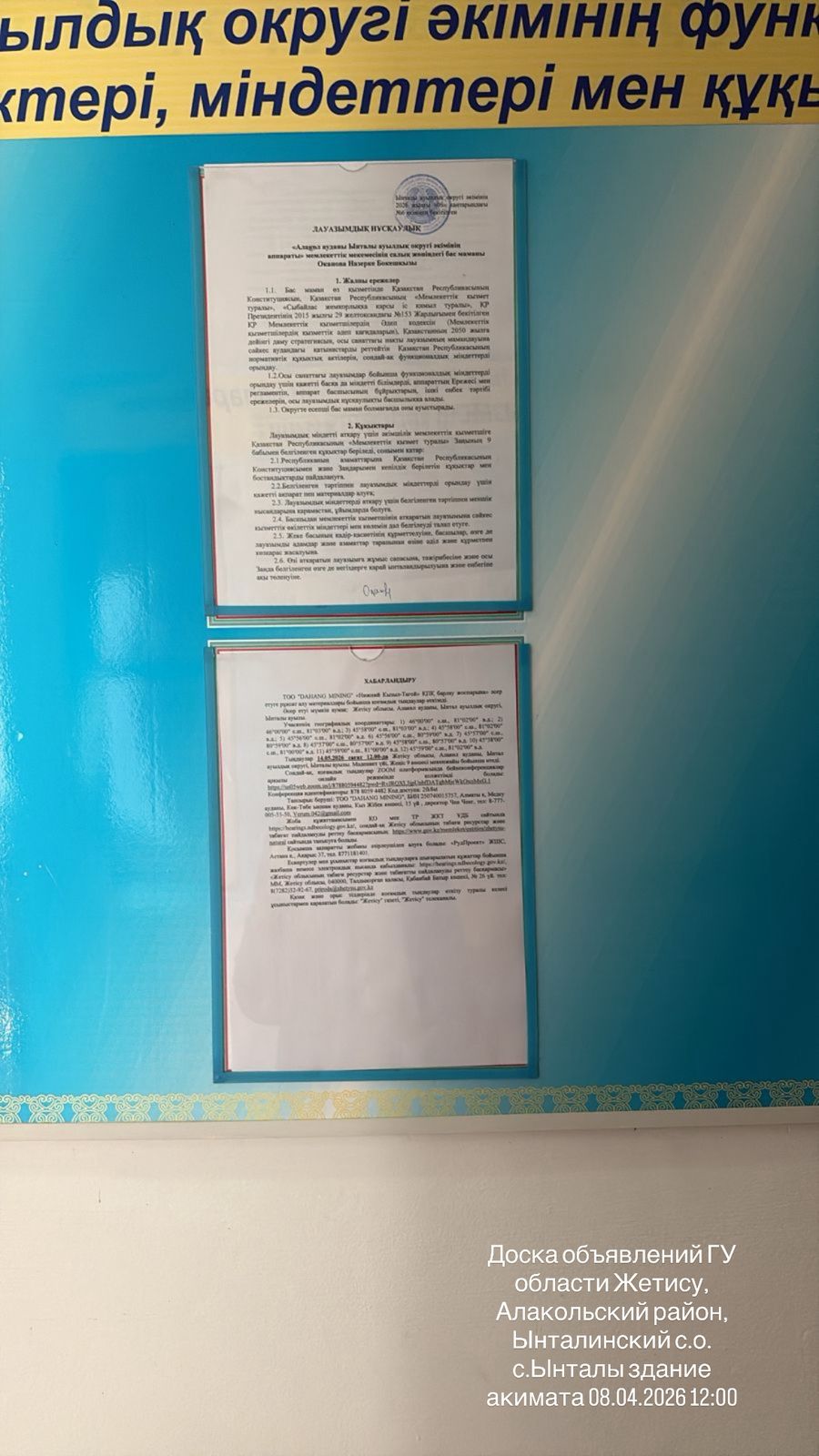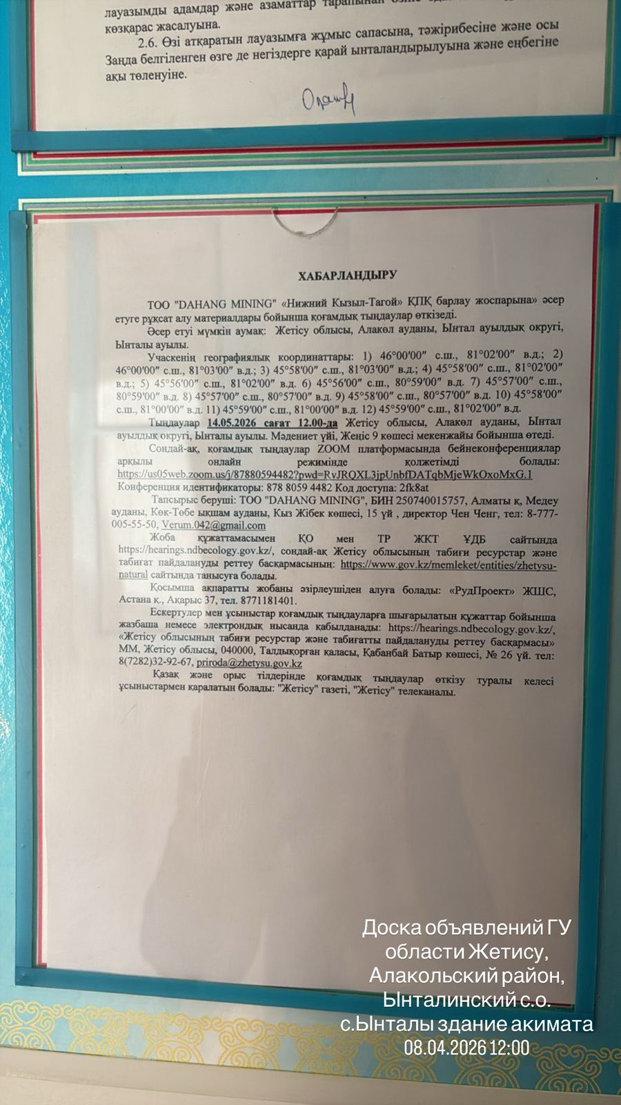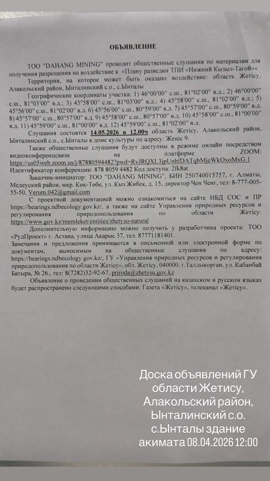 3. Общественные слушания организованны: Главный специалист УПР и ПР Жетысуйской области, priroda@zhetisu.gov.kz,