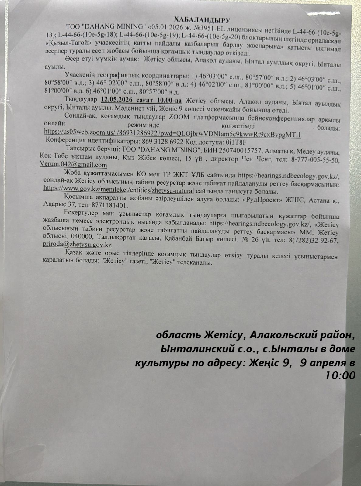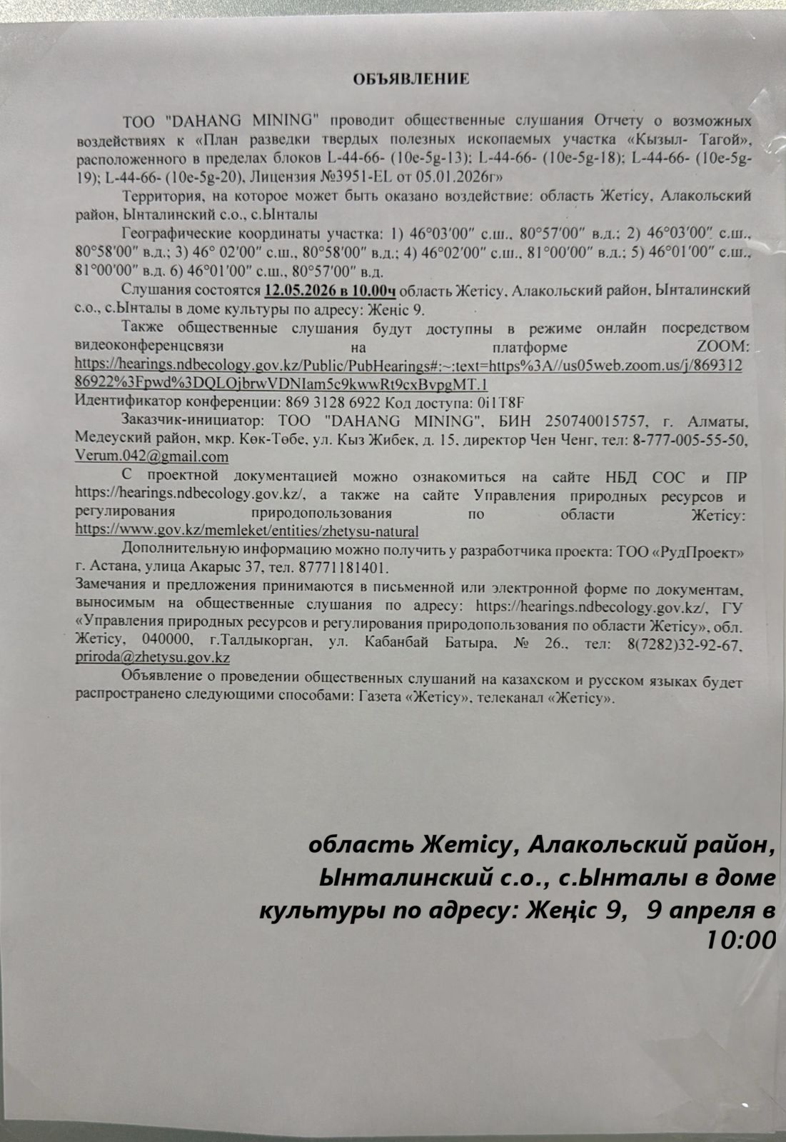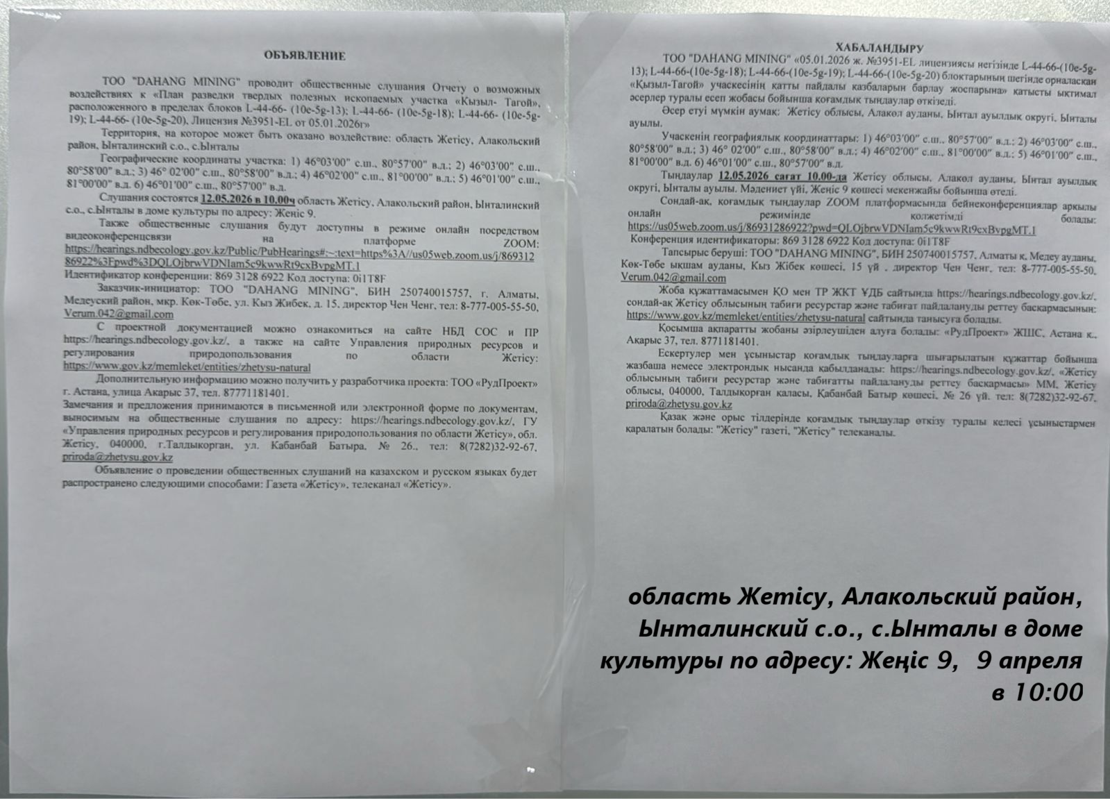 По проекту: Общественные слушания по Отчету о возможных воздействиях по проекту План разведки твердых полезных ископаемых участка «Кызыл- Тагой», расположенного в пределах блоков L-44-66- (10e-5g-13); L-44-66- (10e-5g-18); L-44-66- (10e-5g-19); L-44-66- (10e-5g-20), Лицензия №3951-EL от 05.01.2026г.