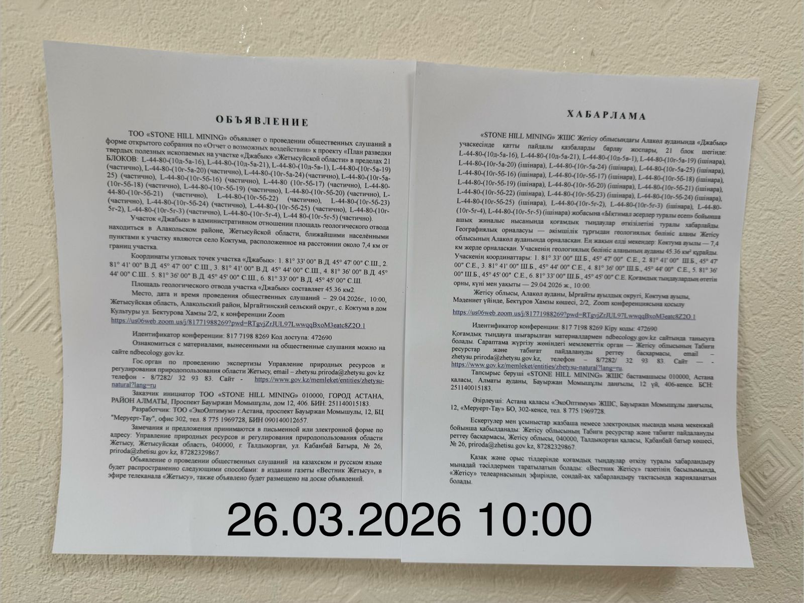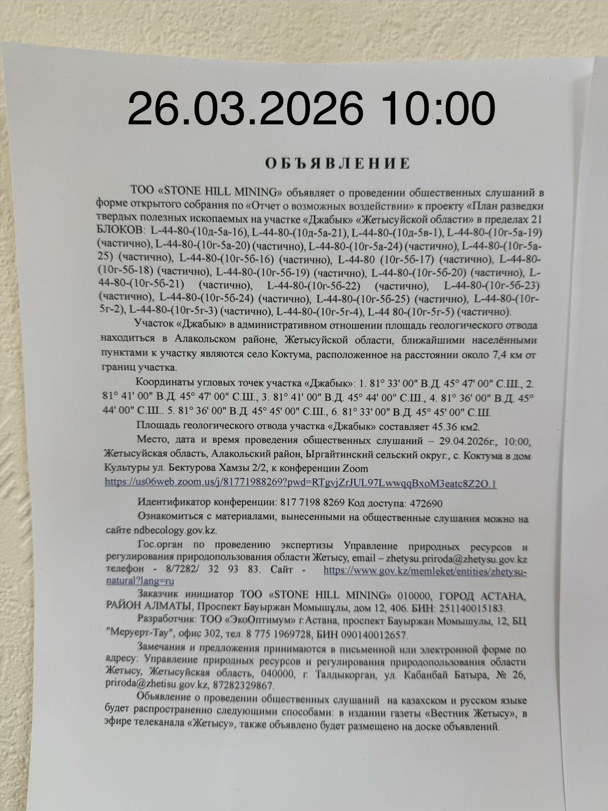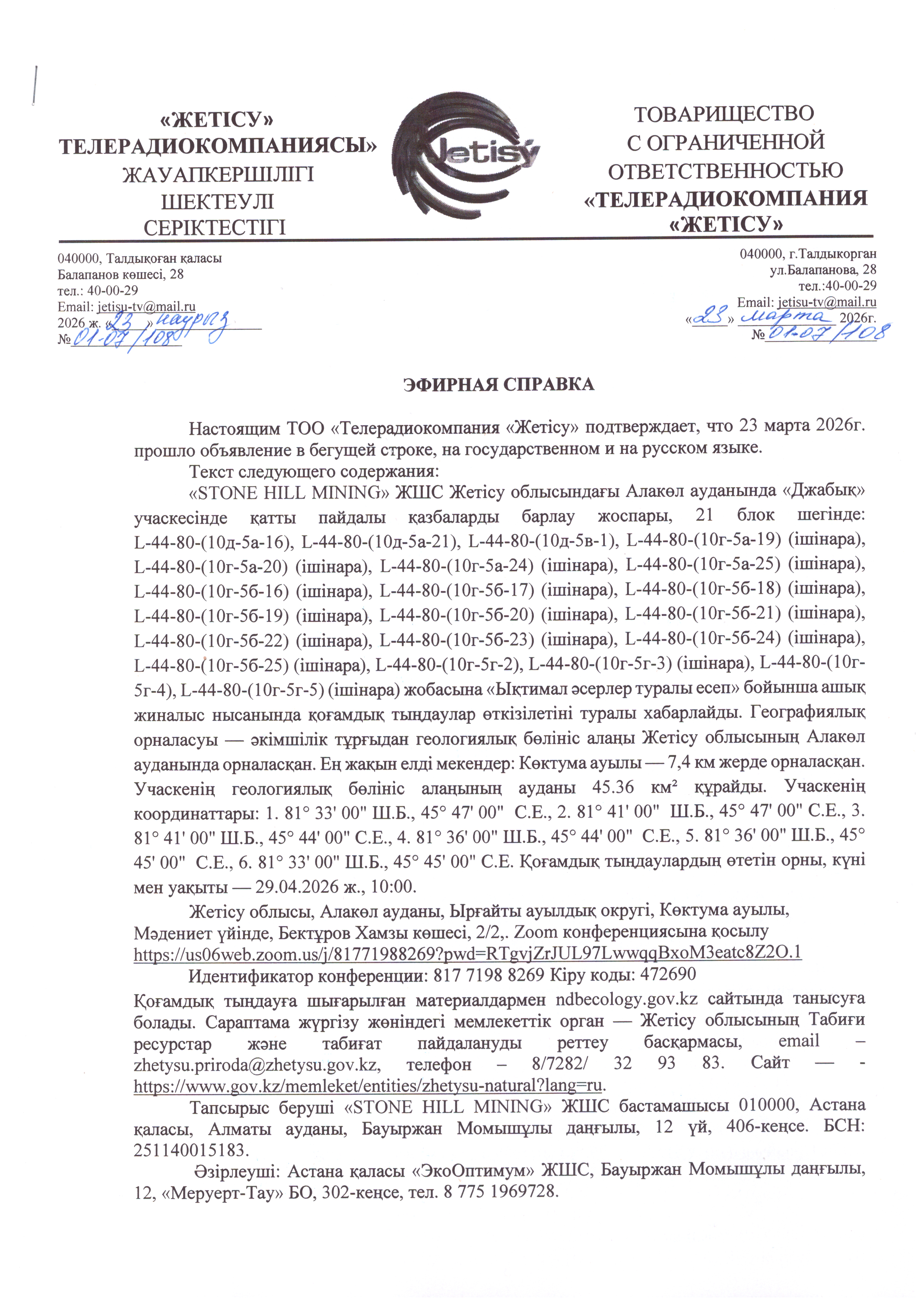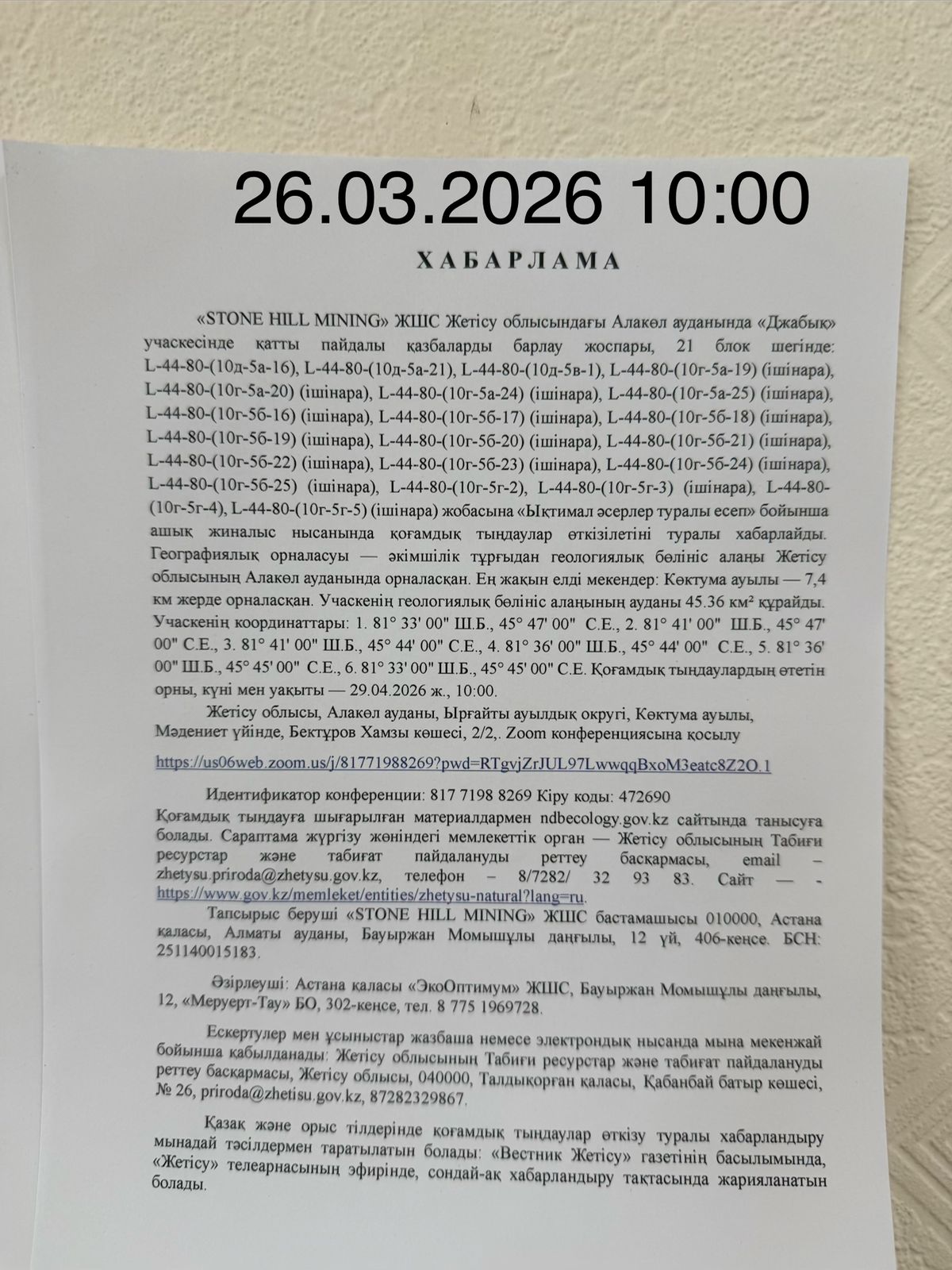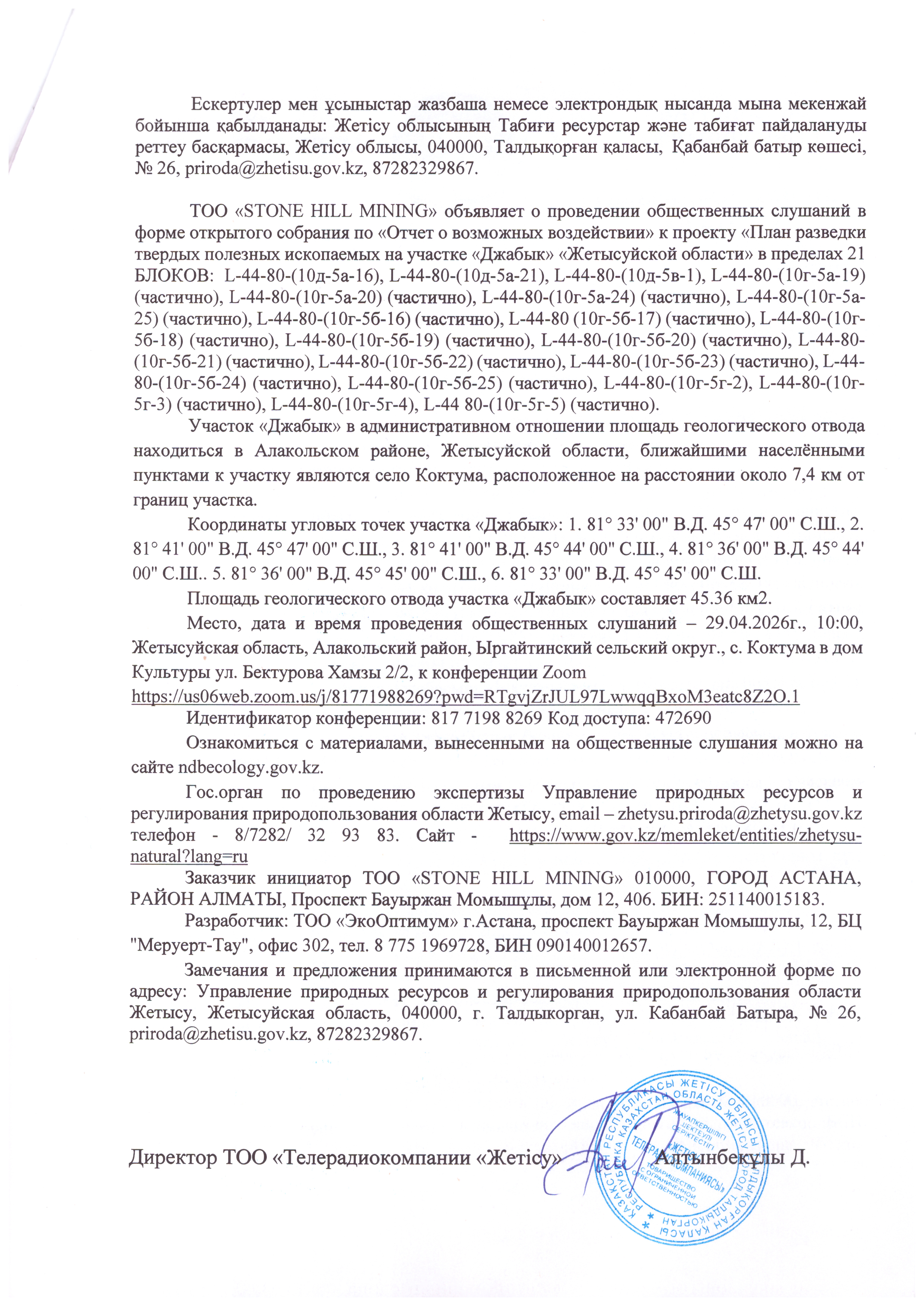 3. Общественные слушания организованны: Главный специалист УПР и ПР Жетысуйской области, priroda@zhetisu.gov.kz,