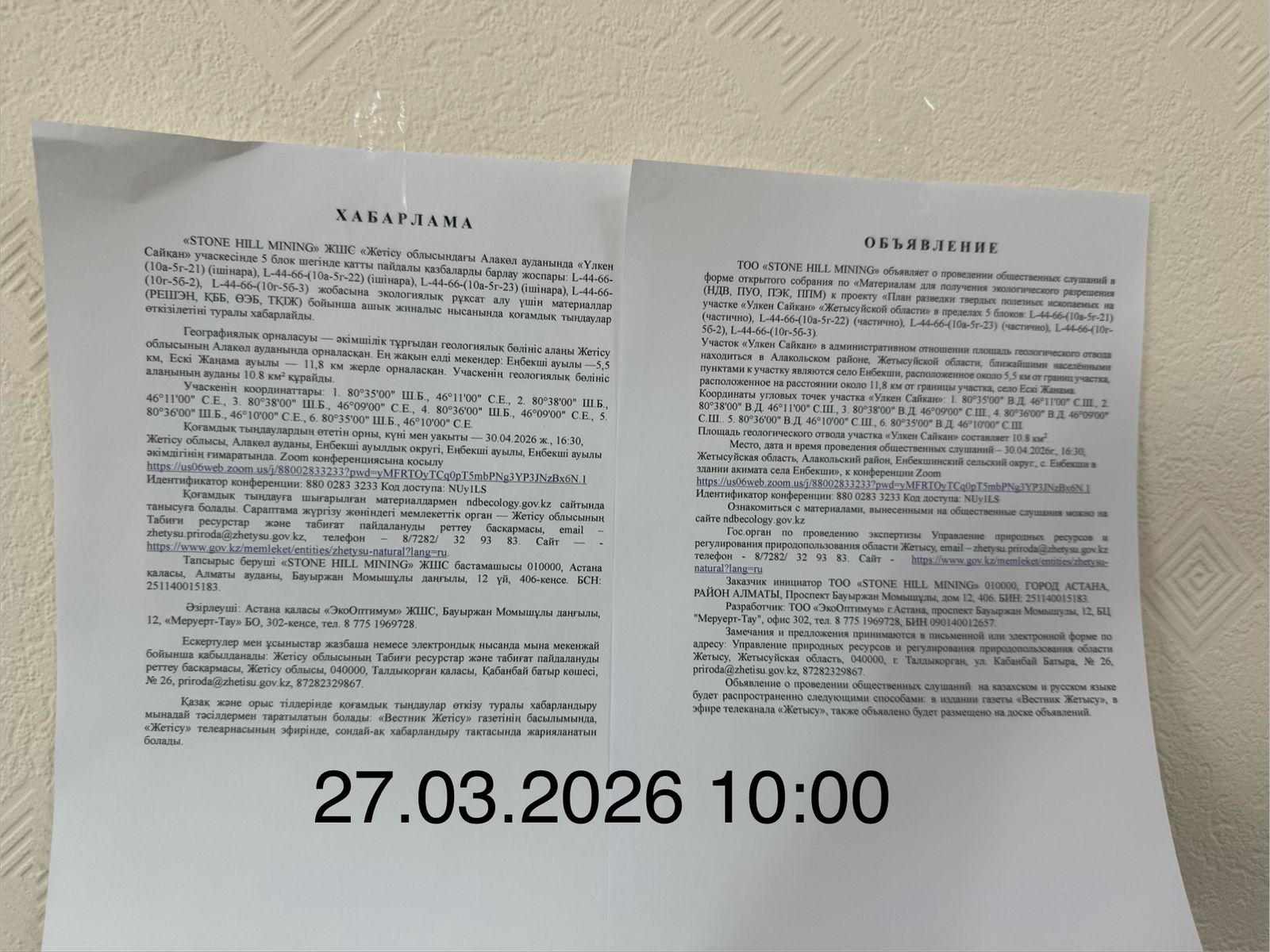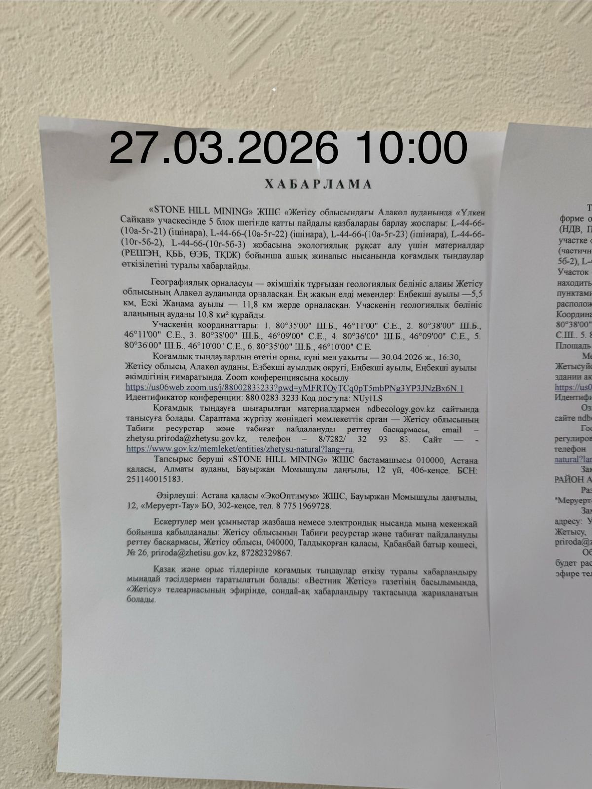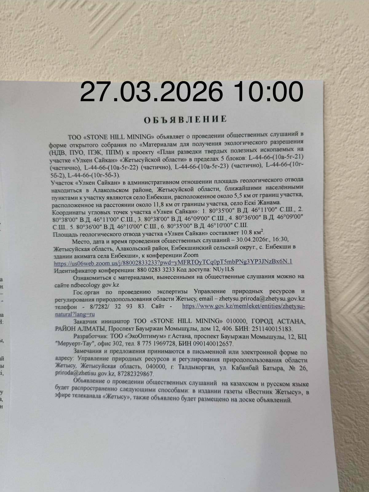 3. Общественные слушания организованны: Главный специалист УПР и ПР Жетысуйской области, priroda@zhetisu.gov.kz,