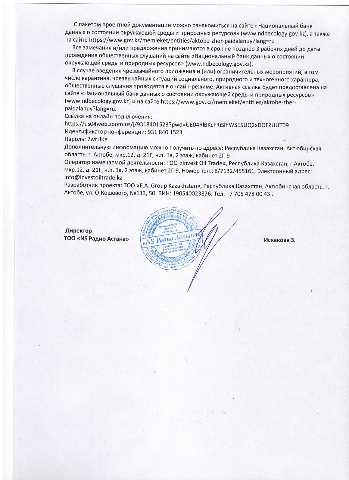 3. Общественные слушания организованны: Управление природных ресурсов и регулирования природопользования Актюбинской области, expert_oos@mail.ru,