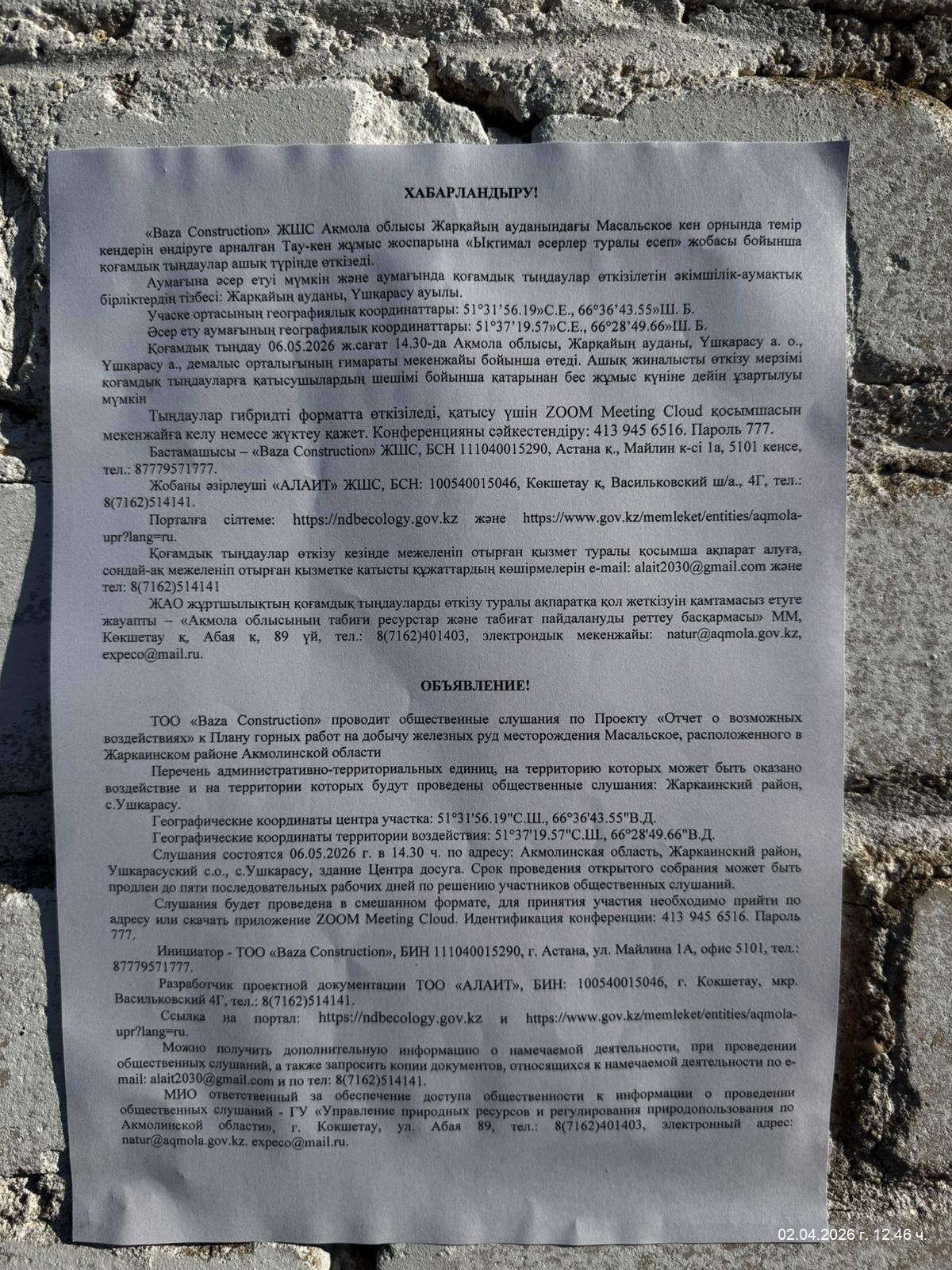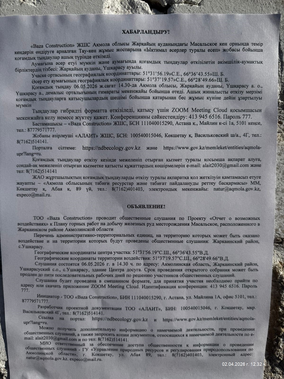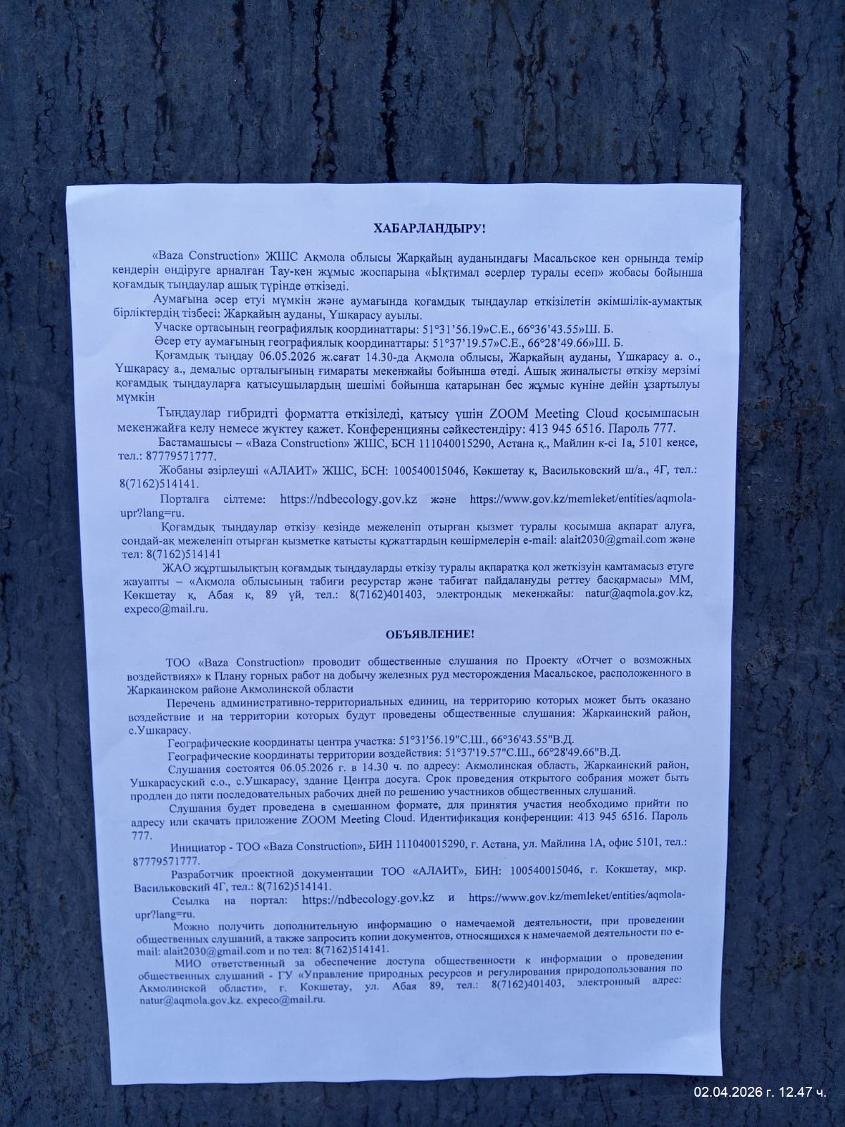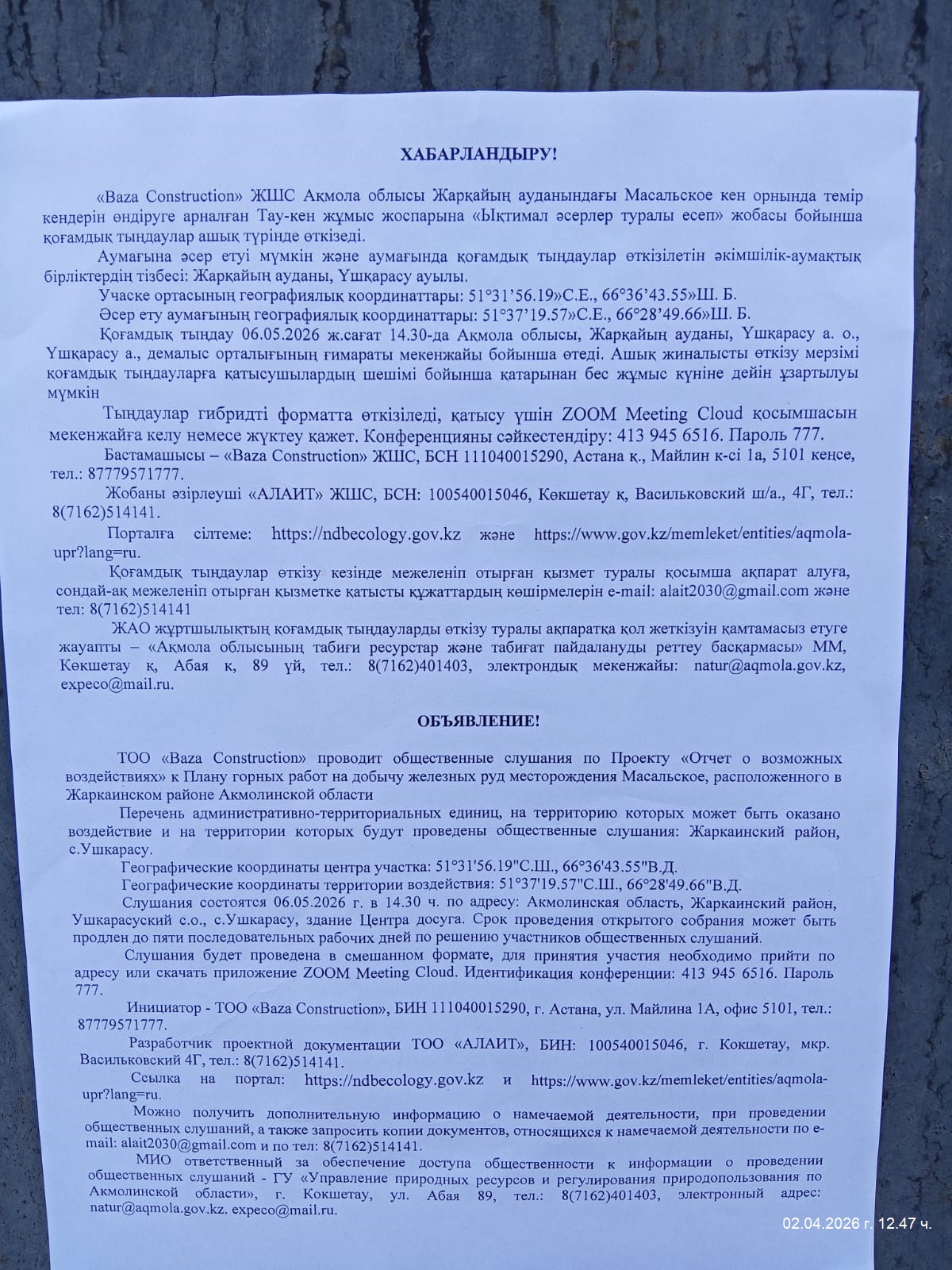 4. Повестка дня общественных слушаний: План горных работ на добычу железных руд месторождения Масальское, расположенного в Жаркаинском районе Акмолинской области (далее План горных работ) выполнен по заданию ТОО «Baza Construction». ТОО «Baza Construction» является победителем аукциона проведенного 29 января 2025 года по лоту № 402616 (месторождение Масальское). 28 февраля 2025 года за исх.№01-07-15/1174-И ТОО «Baza Construction» получено уведомление Министерства промышленности и строительства развития Республики Казахстан о необходимости согласования и проведения экспертиз плана горных работ и плана ликвидации в соответствии со статьями 216 и 217 Кодекса РК «О недрах и недропользовании». План горных работ предусматривает промышленную добычу желез-ных руд открытым способом с запасами, утвержденными Протоколом ГКЗ РК №1327-13-У от 02 сентября 2013 г.