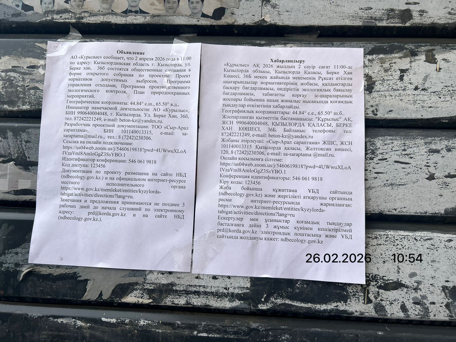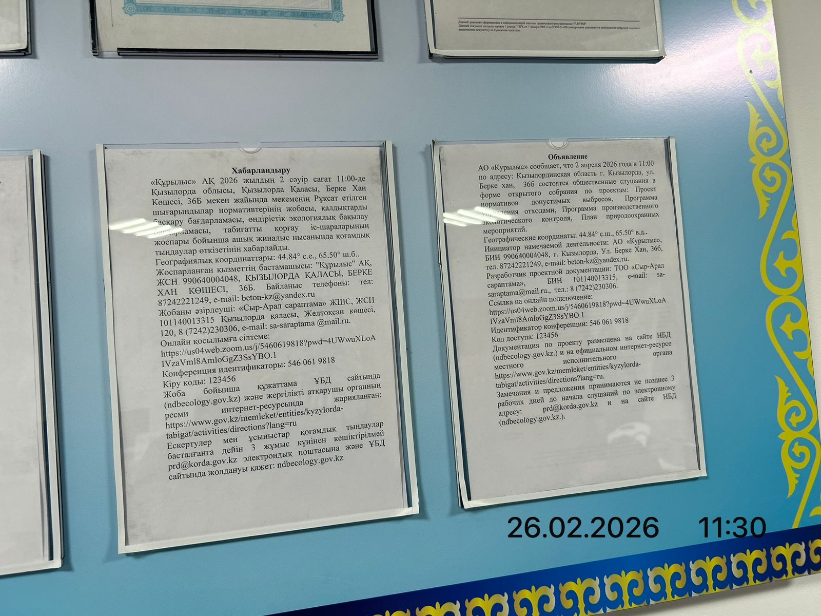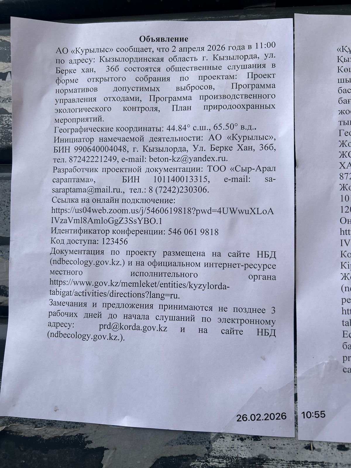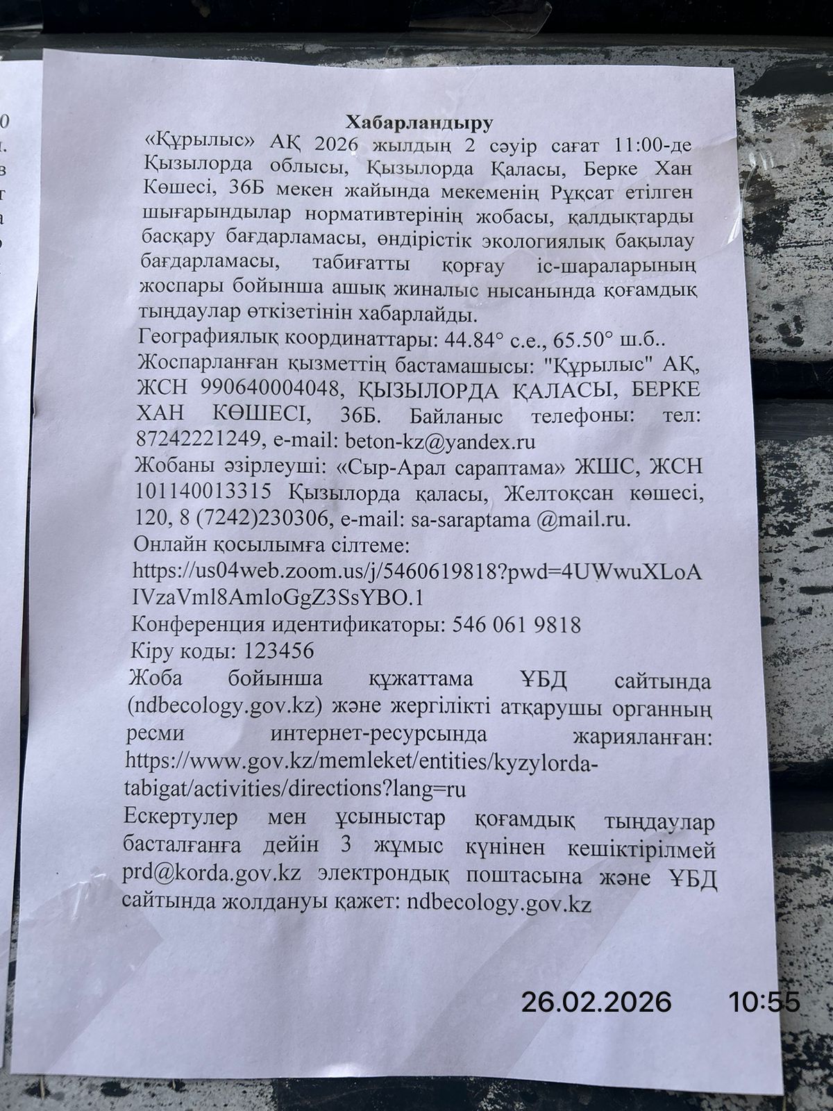 3. Общественные слушания организованны: Управление природных ресурсов и регулирования природопользования Кызылординской области, prd@korda.gov.kz 87242605362, 605369,