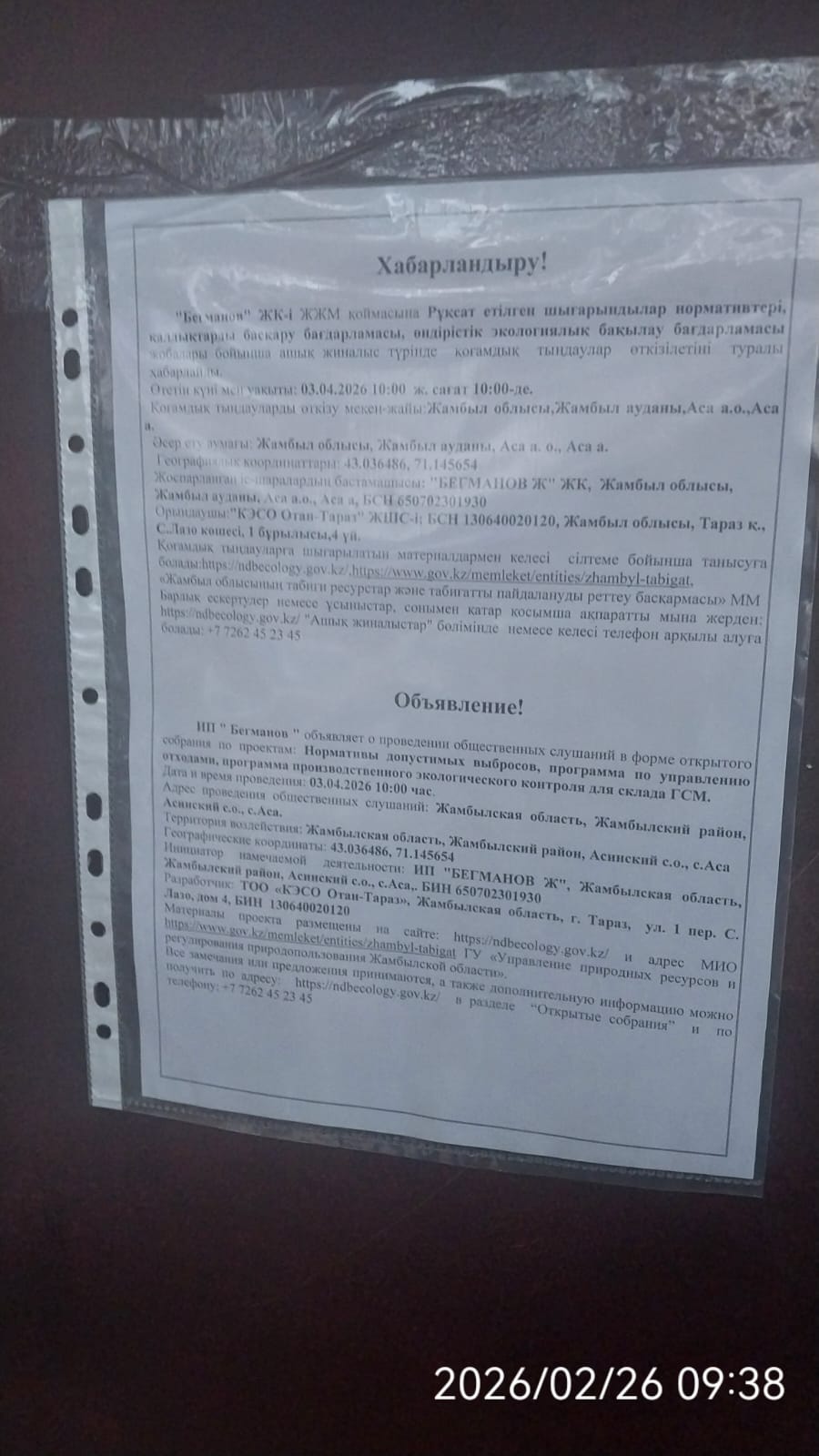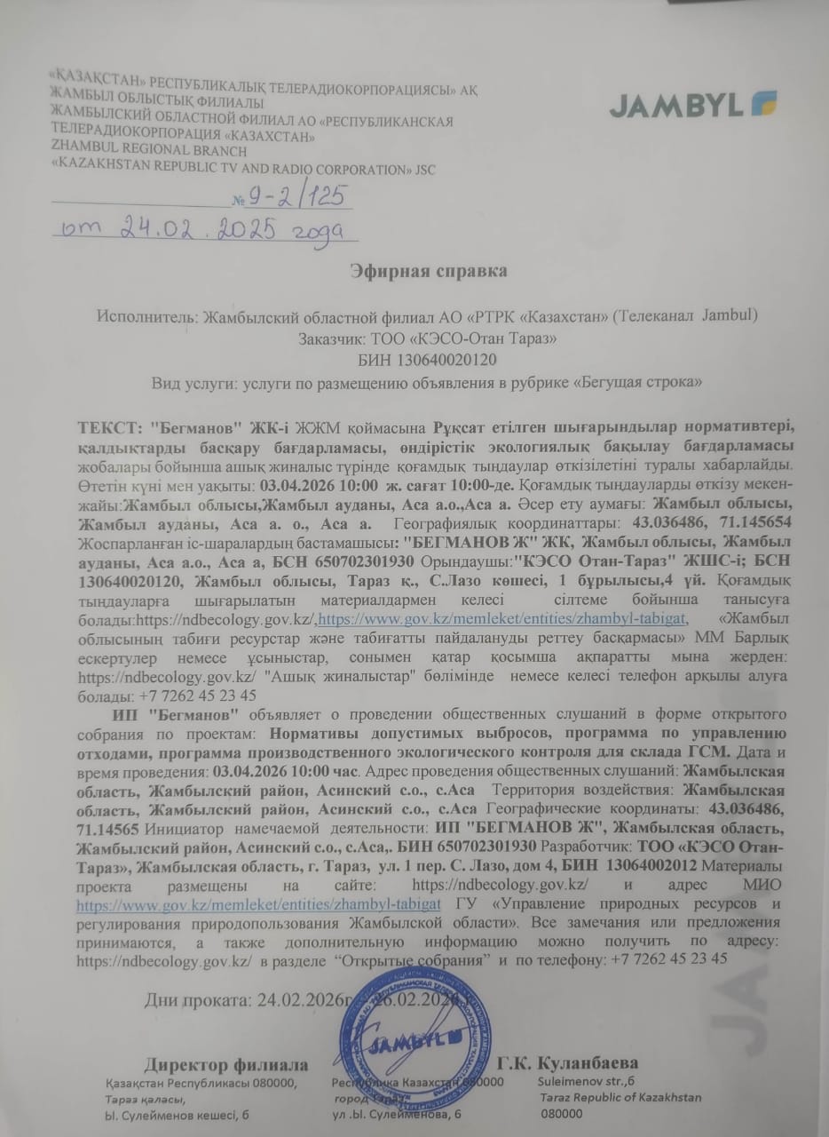 3. Общественные слушания организованны: Управление природных ресурсов и регулирования природопользования Жамбылской области, s.agabek@zhambyl.gov.kz,