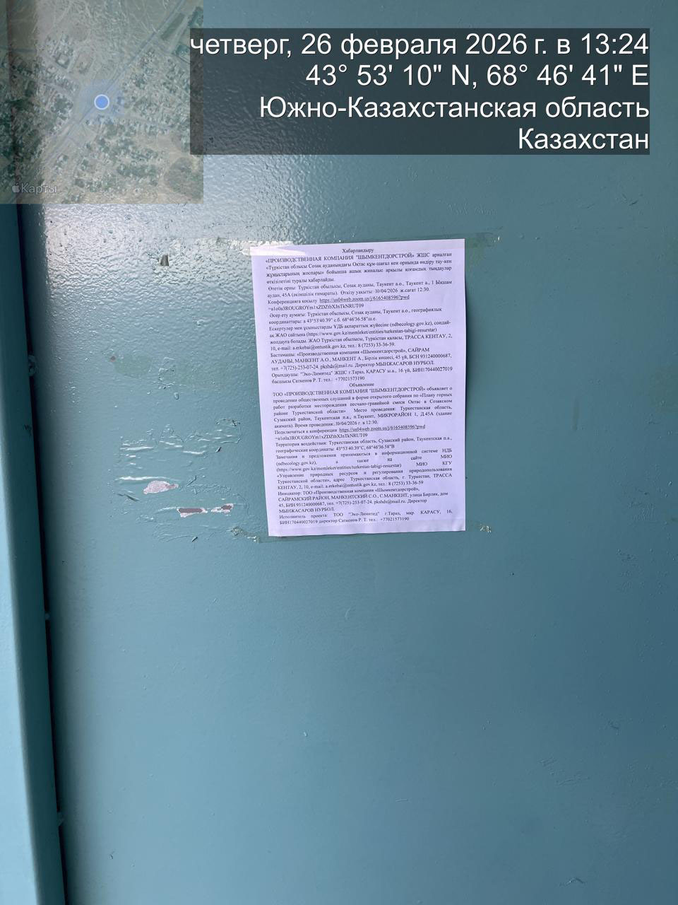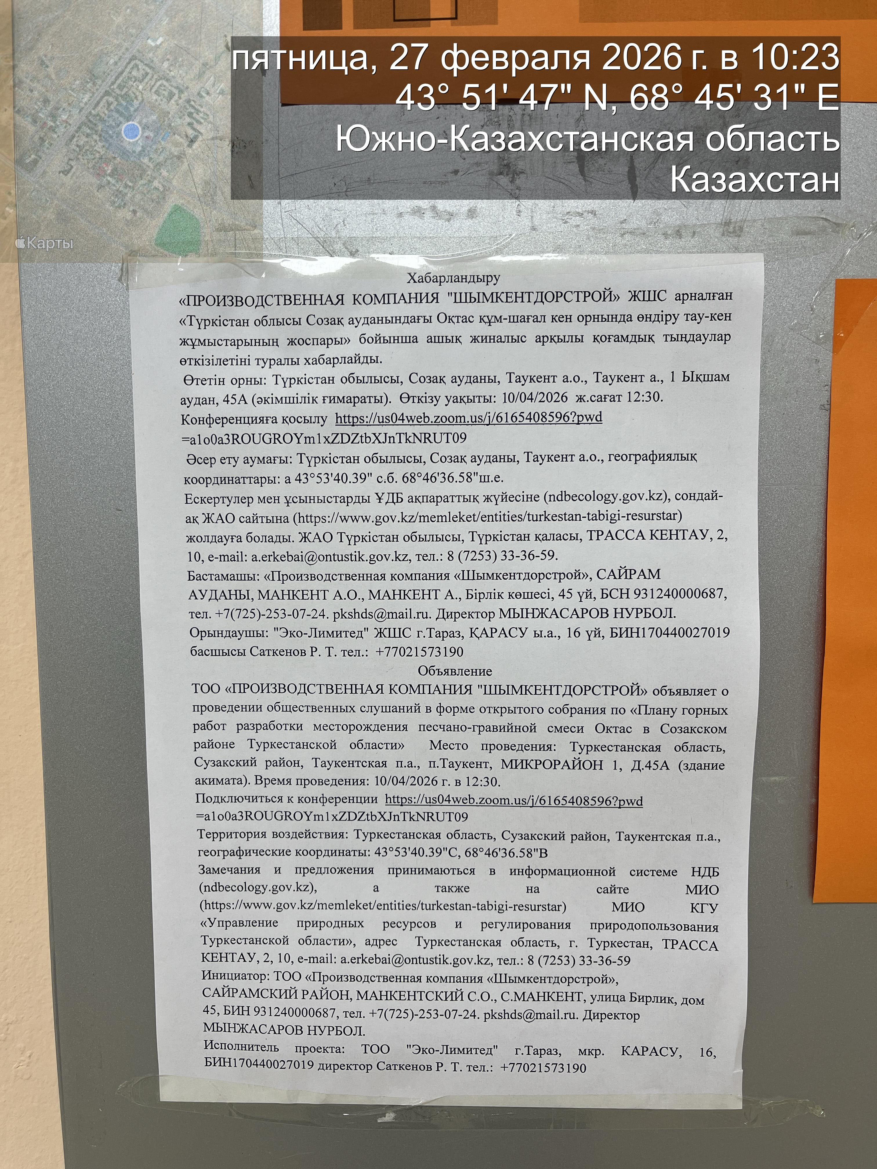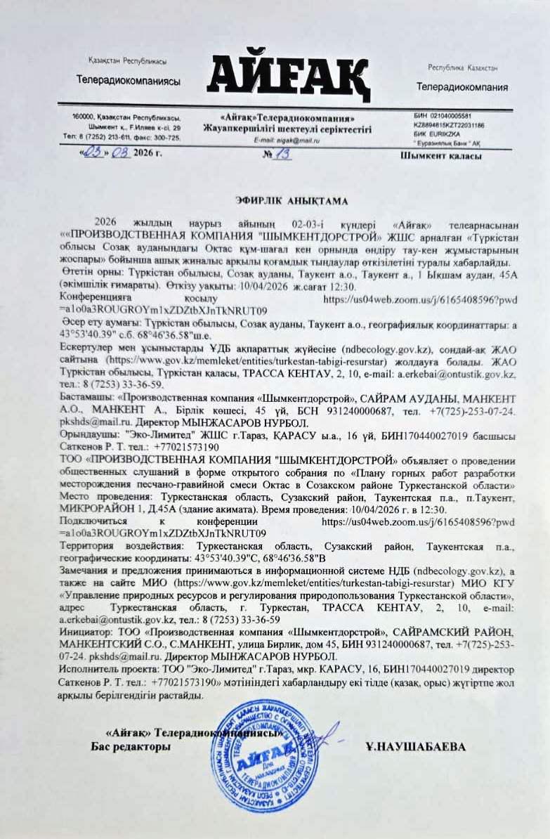 3. Общественные слушания организованны: Управление природных ресурсов и регулирования природопользования Туркестанской области, a.erkebai@ontustik.gov.kz,