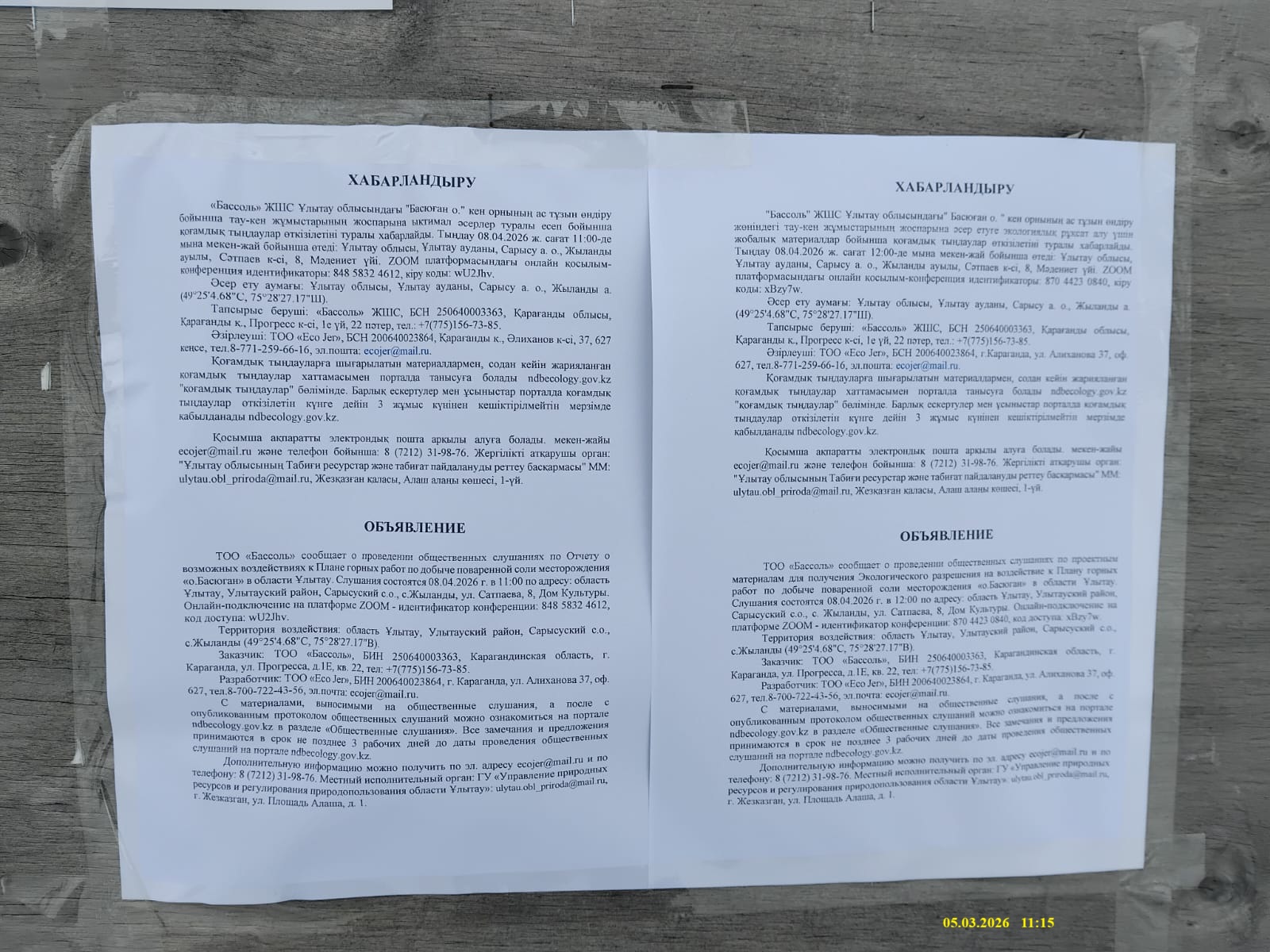 1.4. Описание для подключения к онлайн трансляции при прохождении общественного слушания: в соответствии с пп.4, п.11 прил. 3 Правил, информация о проведении общественных слушаний должна быть распространена на государственном и русском языках на досках объявлений местных исполнительных органов административно-территориальных единиц и в местах, специально предназначенных для размещения объявлений. В связи с чем необходимо дополнительно разместить печатные объявления на досках объявлений в акимате и в местах, специально предназначенных для размещения объявлений.