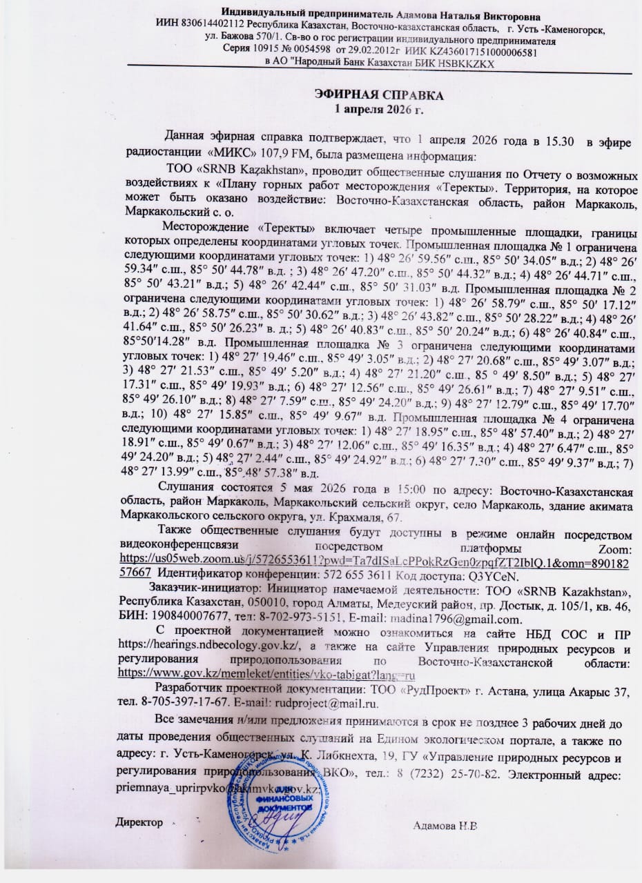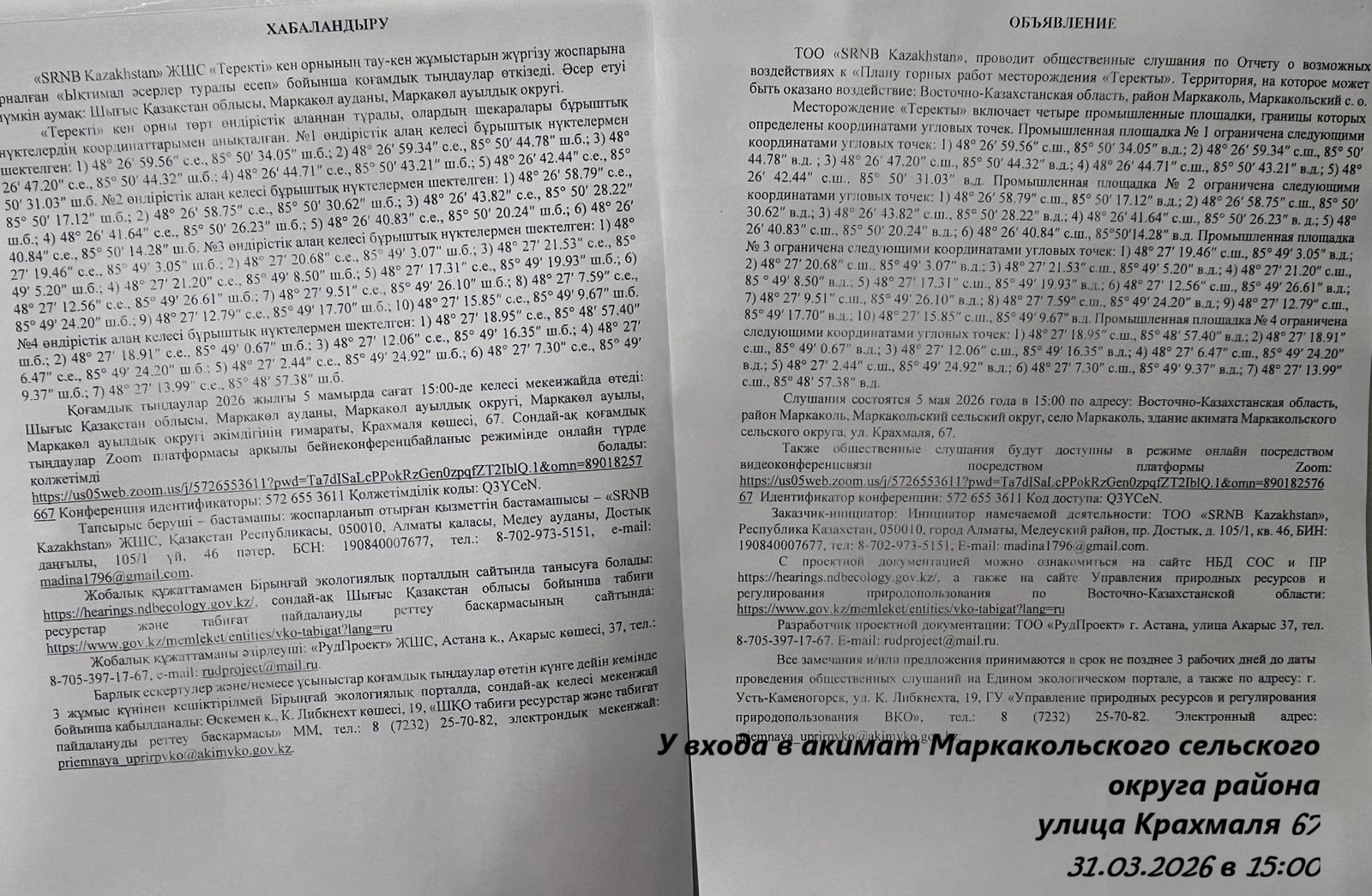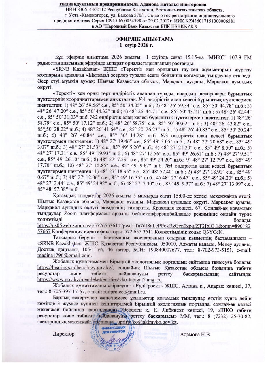 3. Общественные слушания организованны: Управление природных ресурсов и регулирования природопользования Восточно-Казахстанской области, g.zhunisbekova@akimvko.gov.kz,