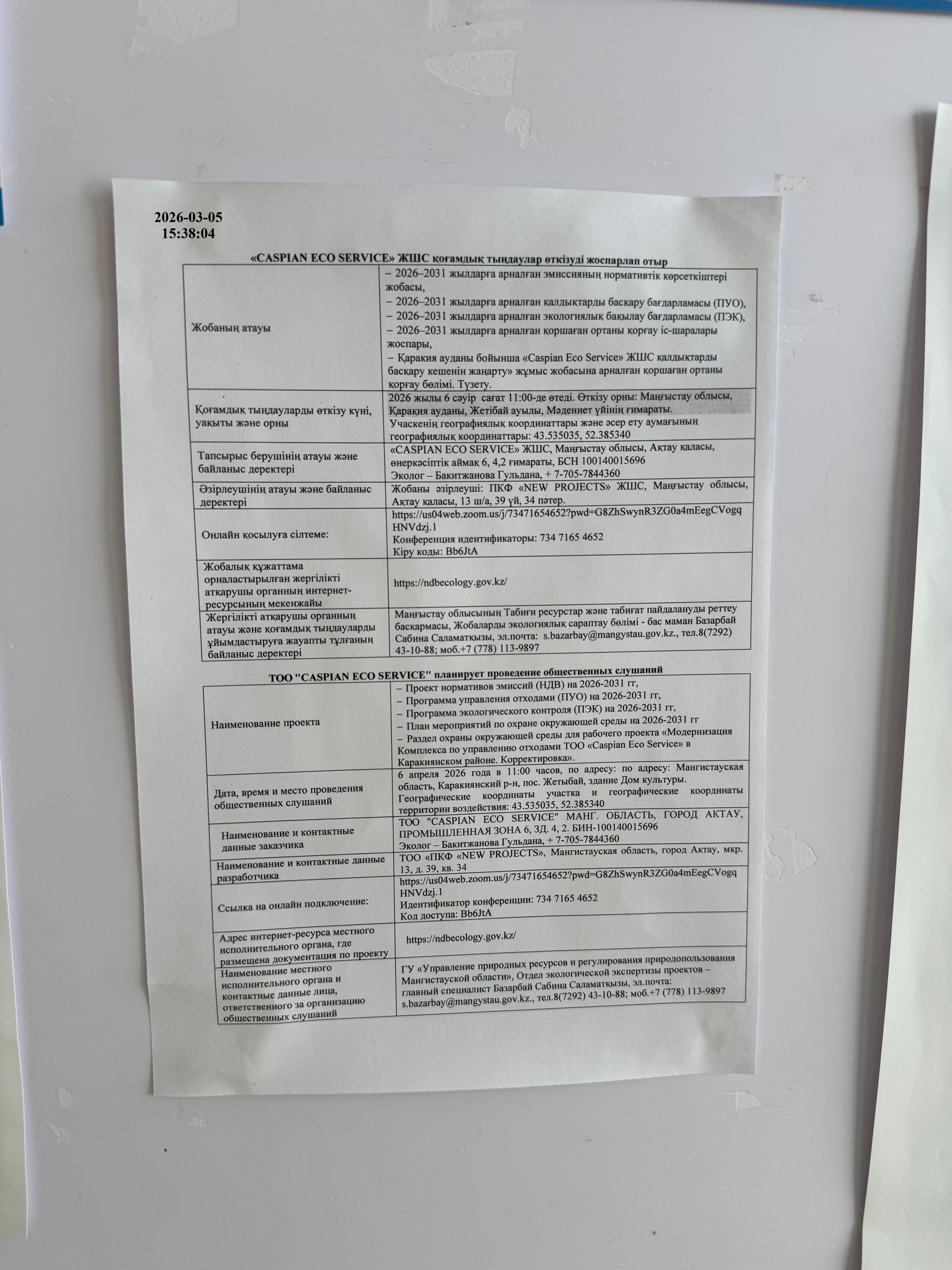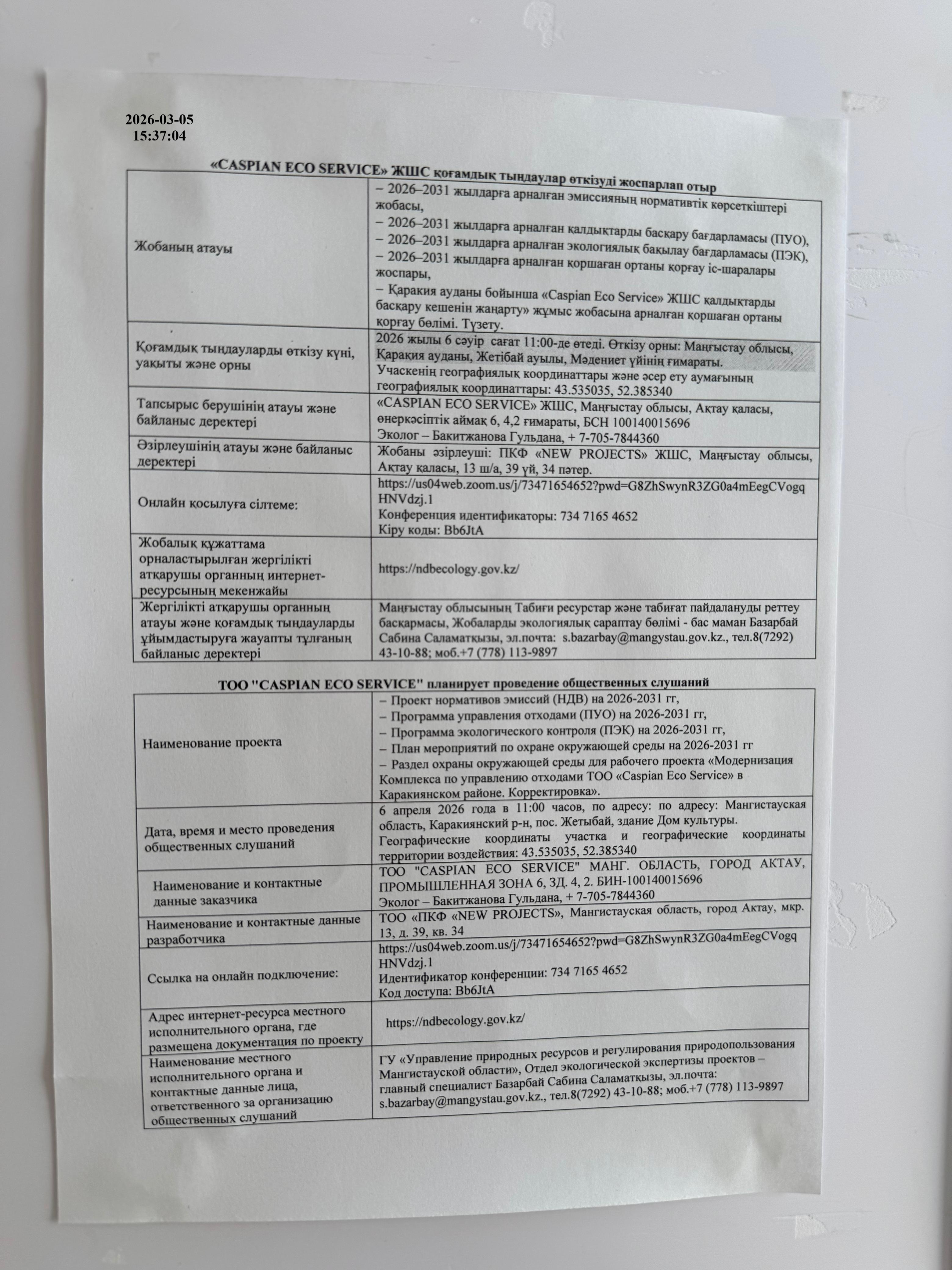 3. Общественные слушания организованны: Управление природных ресурсов и регулирования природопользования Мангистауской области, s.bazarbay@mangystau.gov.kz,
