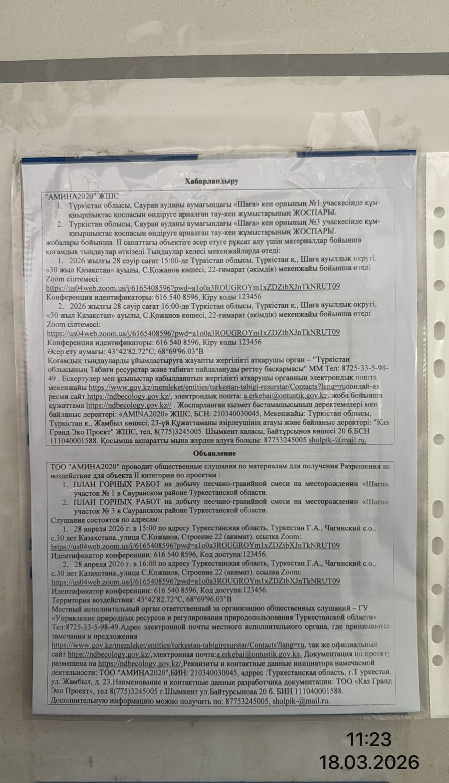 3. Общественные слушания организованны: Управление природных ресурсов и регулирования природопользования Туркестанской области, a.erkebai@ontustik.gov.kz,