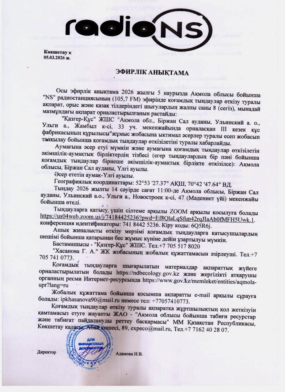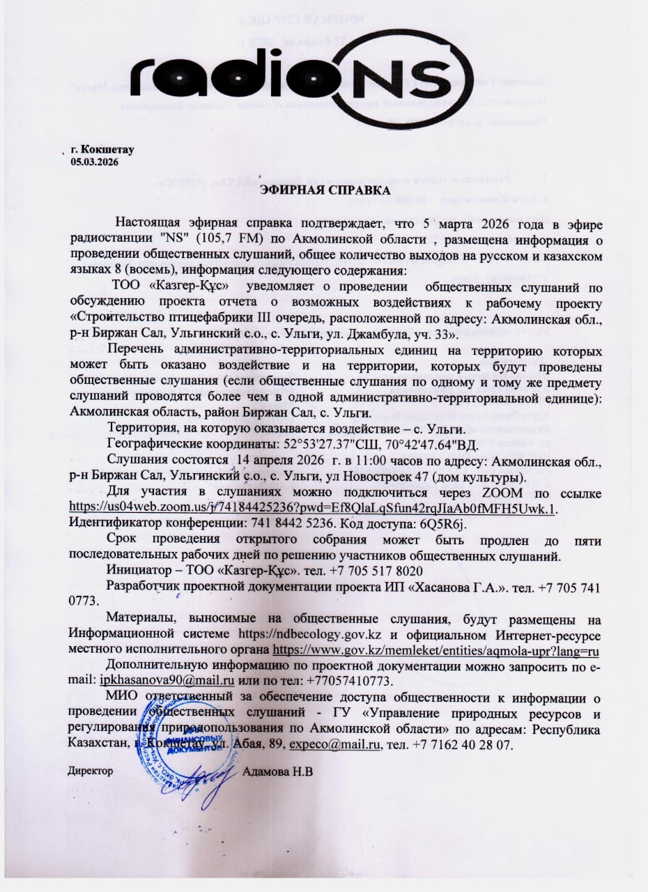 По проекту: ТОО «Казгер-Құс» уведомляет о проведении общественных слушаний по обсуждению проекта отчета о возможных воздействиях к рабочему проекту «Строительство птицефабрики III очередь, расположенной по адресу: Акмолинская обл., р-н Биржан Сал, Ульгинский с.о., с. Ульги, ул. Джамбула, уч. 33».