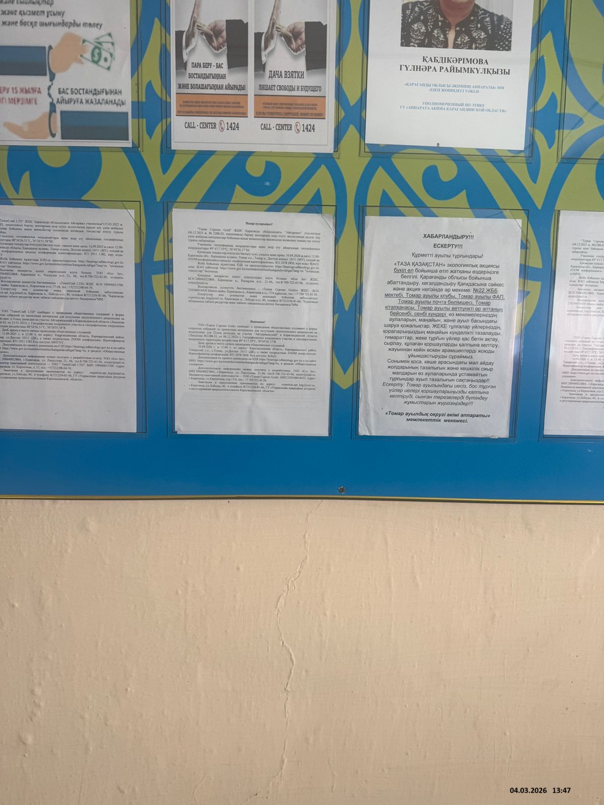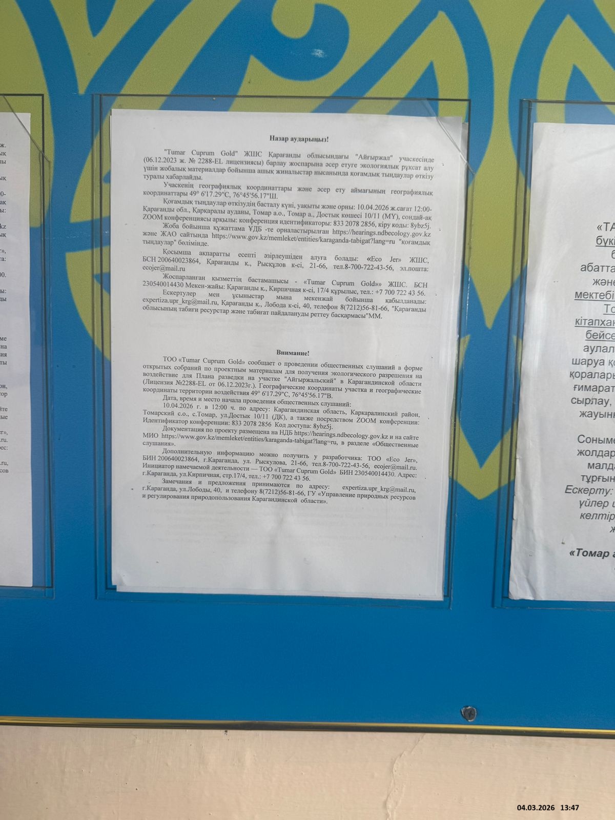 3. Общественные слушания организованны: Управление природных ресурсов и регулирования природопользования Карагандинской области, expertiza.upr_krg@mail.ru,
