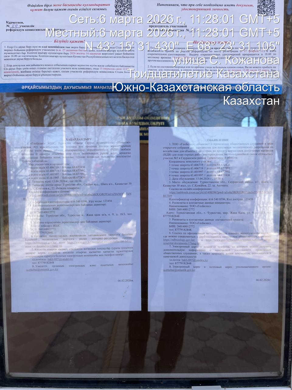3. Общественные слушания организованны: Управление природных ресурсов и регулирования природопользования Туркестанской области, a.erkebai@ontustik.gov.kz,