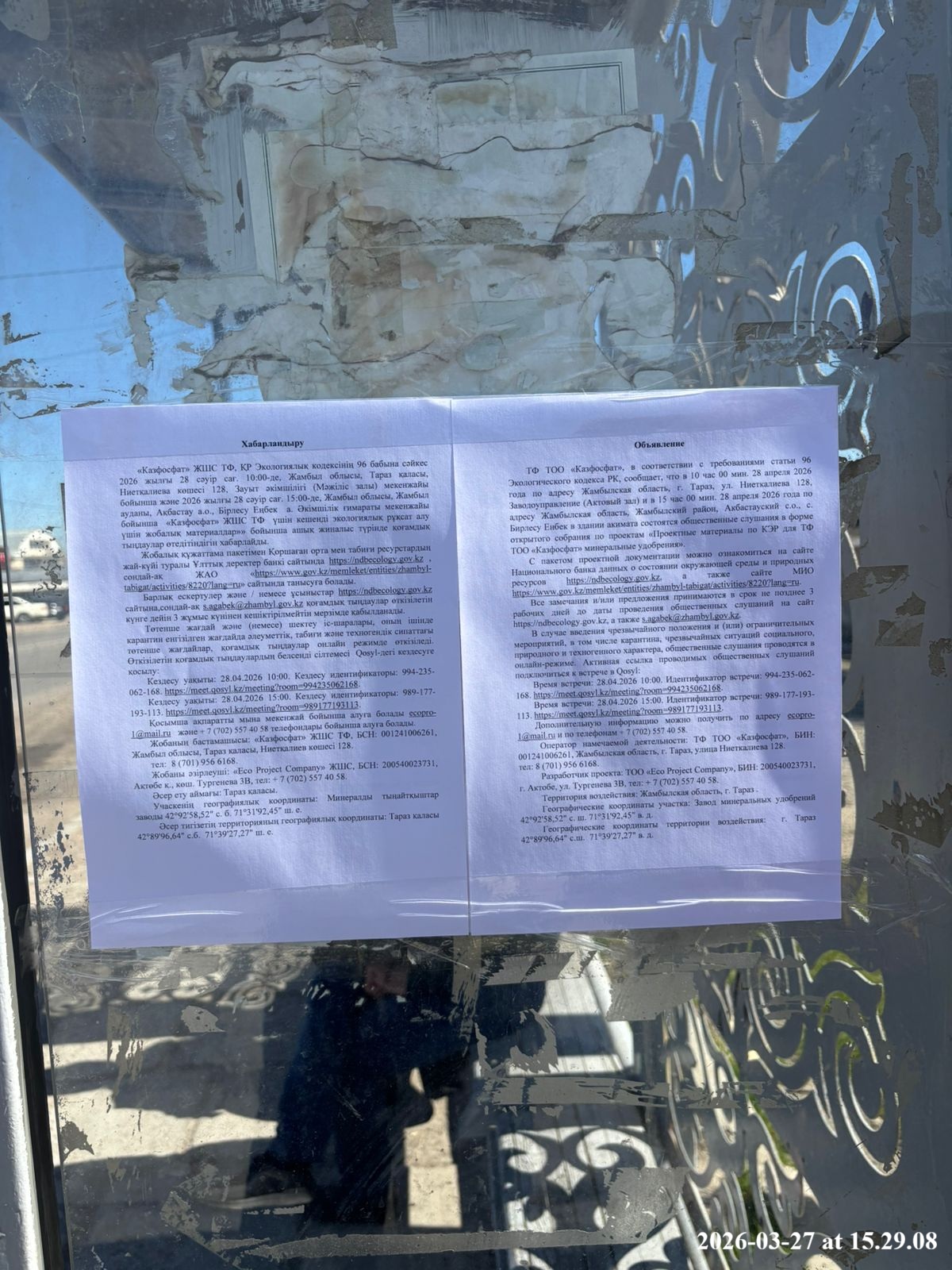 1.4. Описание для подключения к онлайн трансляции при прохождении общественного слушания: Приглашение на запланированную встречу в Qosyl Тема встречи: Товарищество с ограниченной ответственностью ""КАЗФОСФАТ"" Время встречи: 28.04.2026 10:00 Длительность встречи: 01 час. Идентификатор встречи: 994-235-062-168 Подключиться к встрече в Qosyl: https://meet.qosyl.kz/meeting?room=994235062168