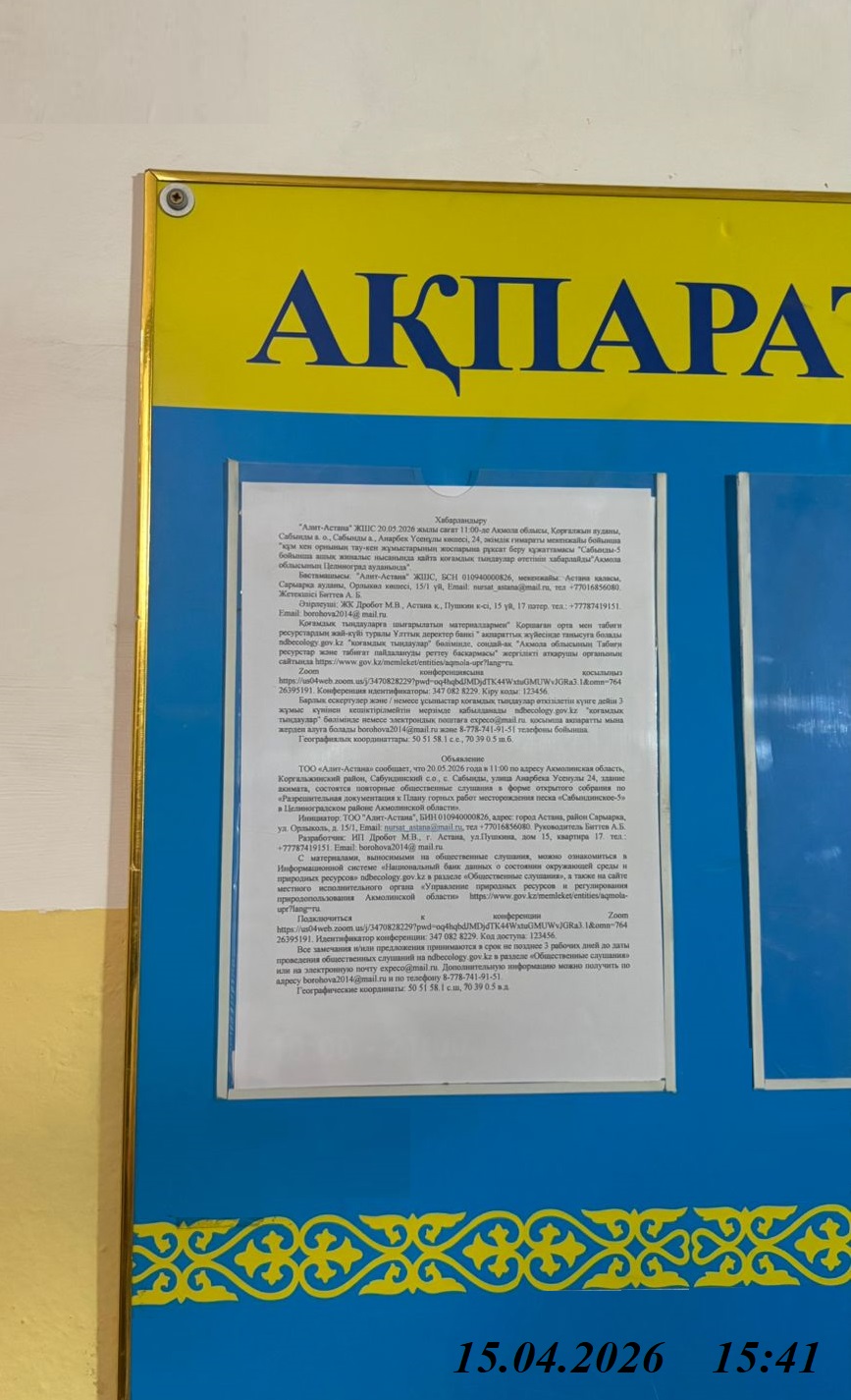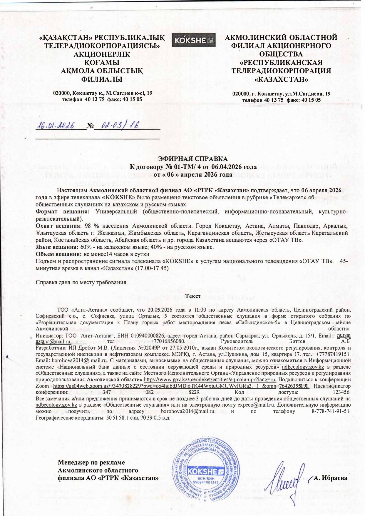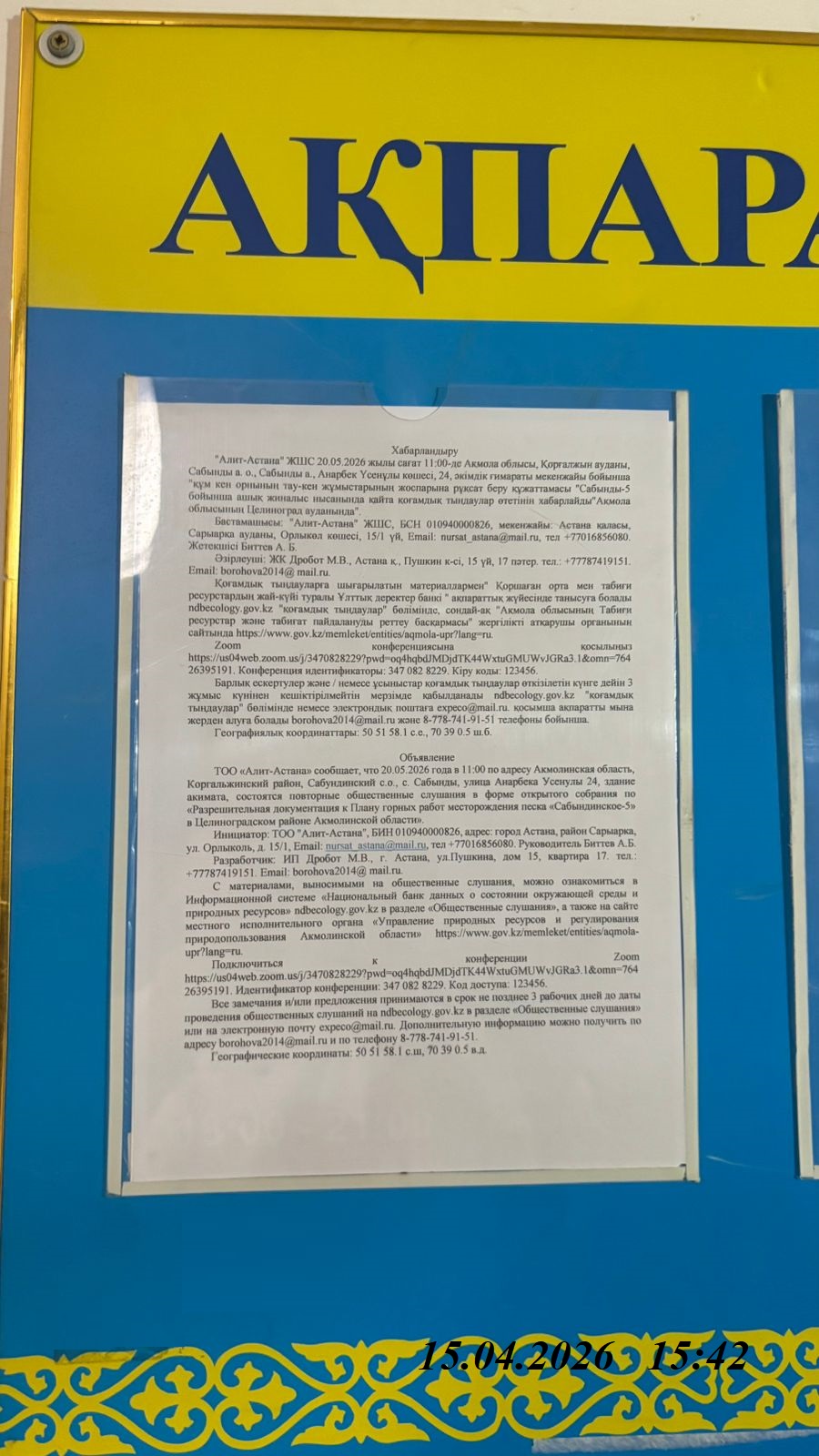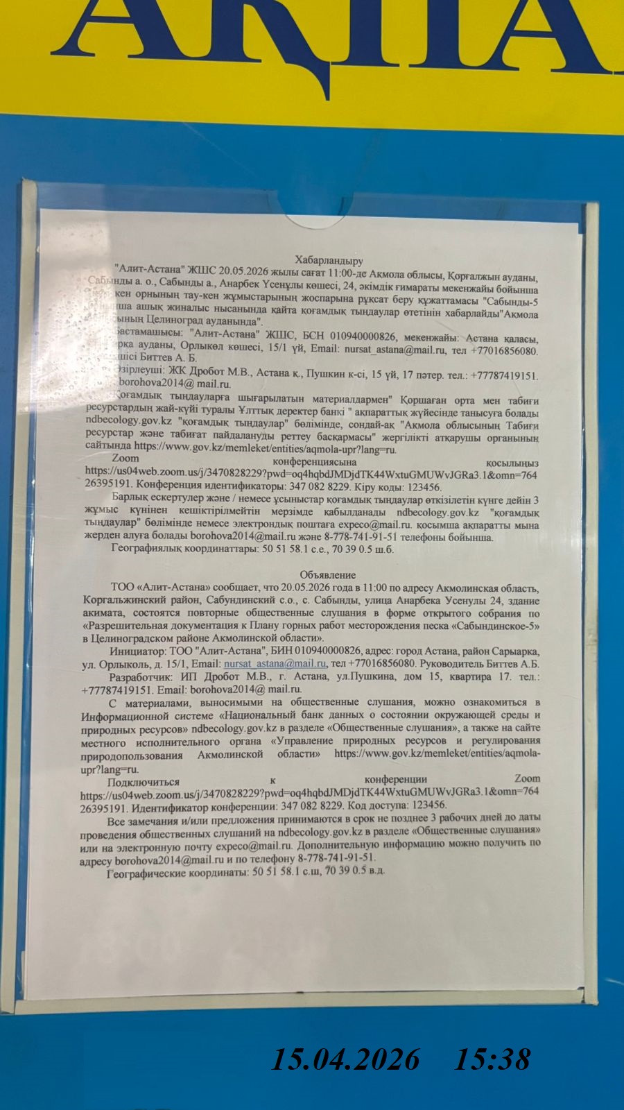 3. Общественные слушания организованны: Управление природных ресурсов и регулирования природопользования Акмолинской области, expeco@mail.ru,
