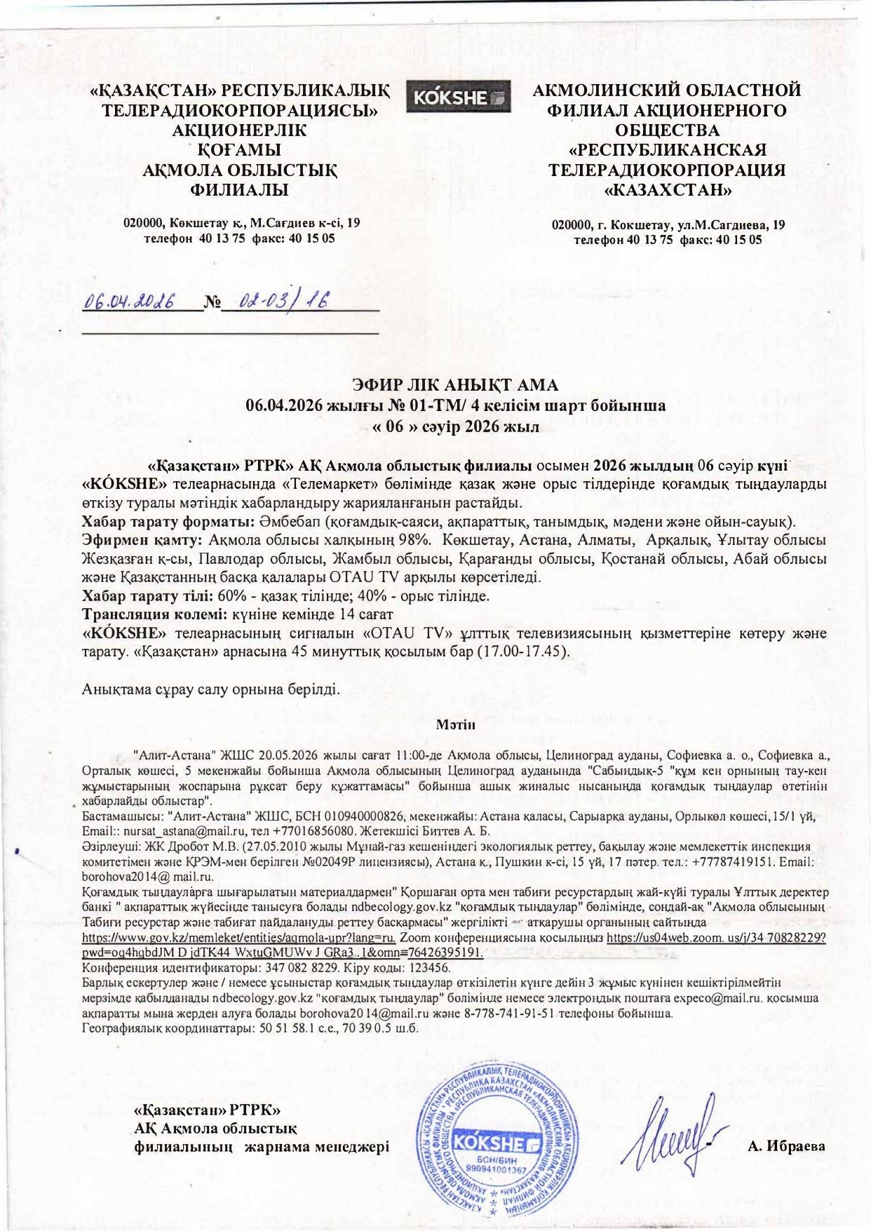 6.2. Наименование теле или радиоканала, где будет размещено объявление: Акмол филиал РТРК Казахстан