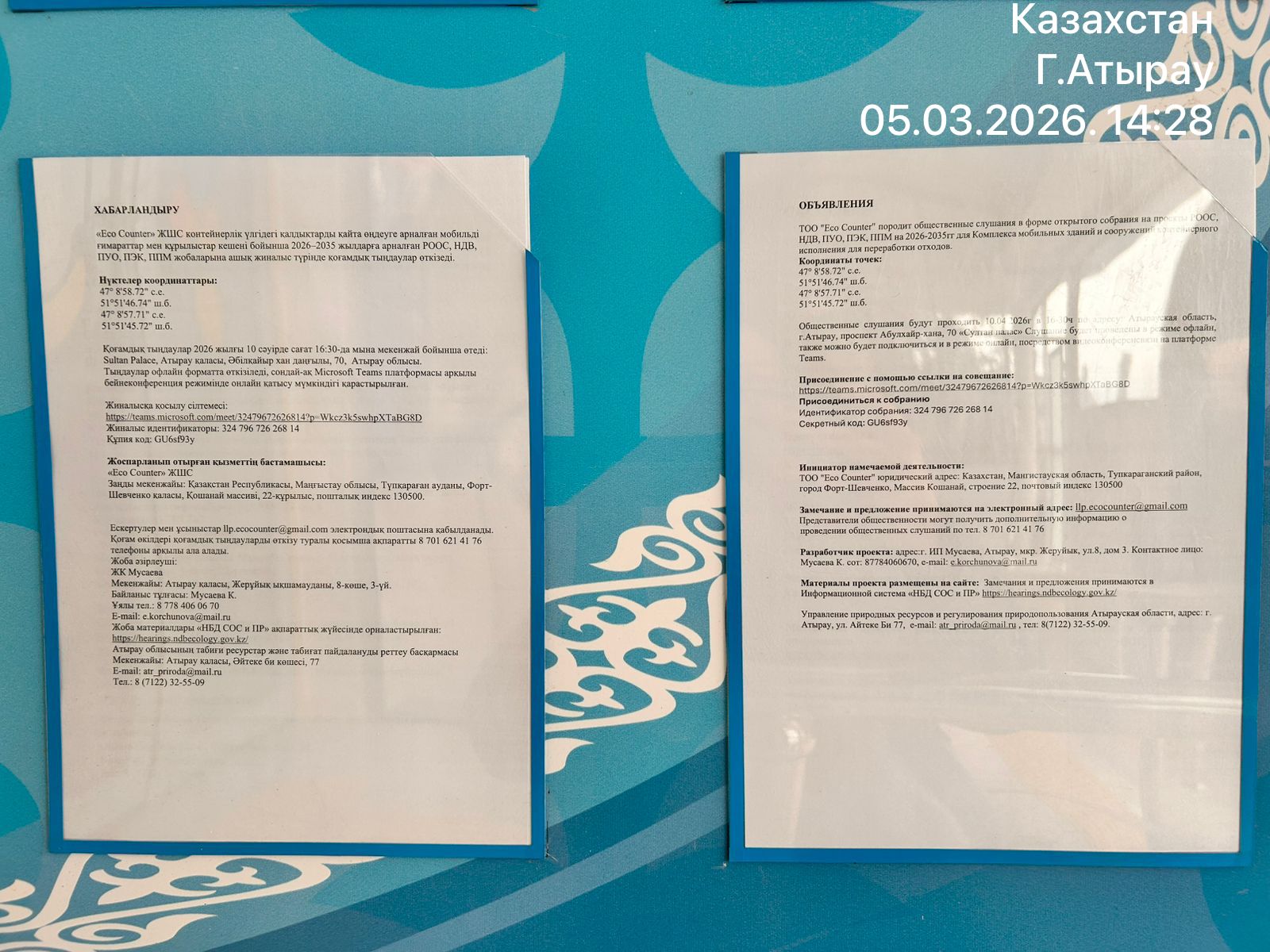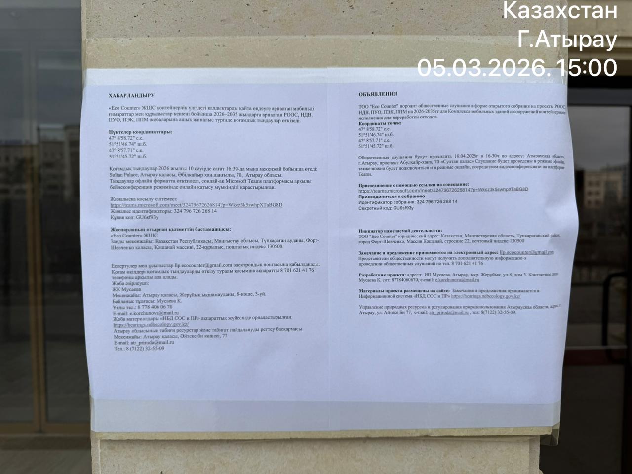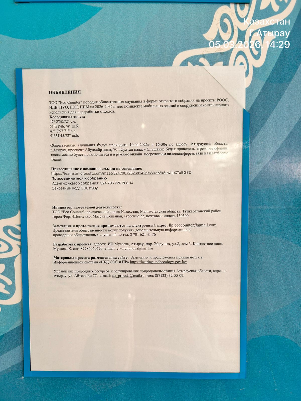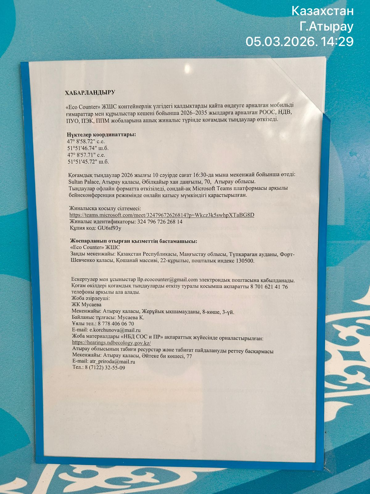 3. Общественные слушания организованны: Управление природных ресурсов и регулирования природопользования Атырауской области, atr.priroda@atyrau.gov.kz,