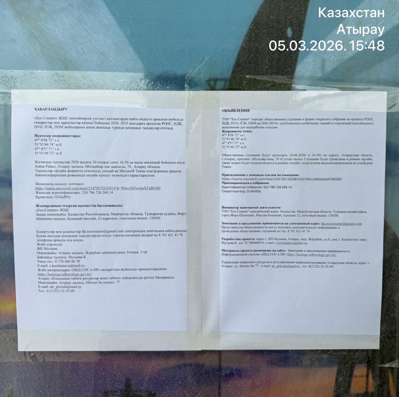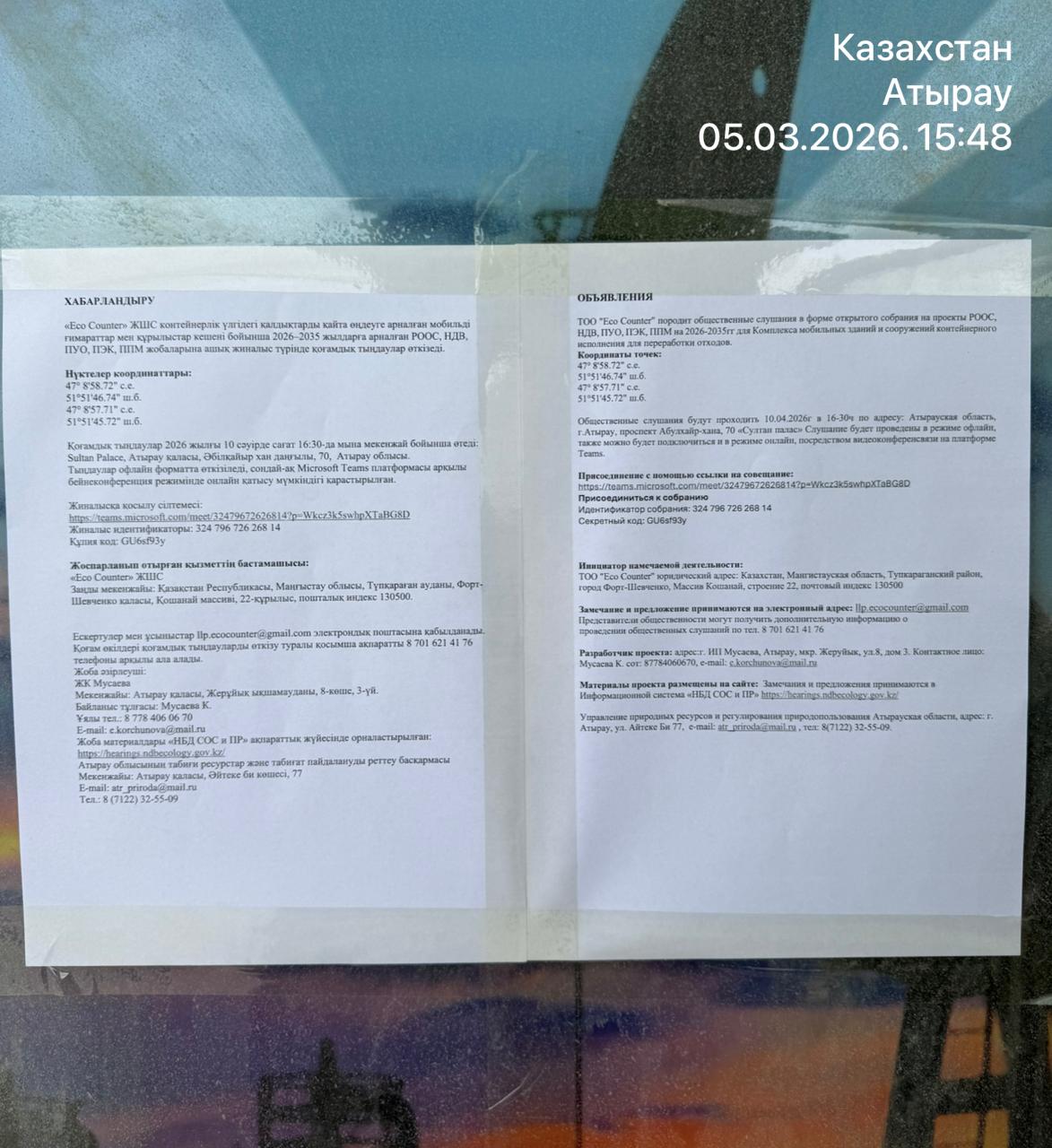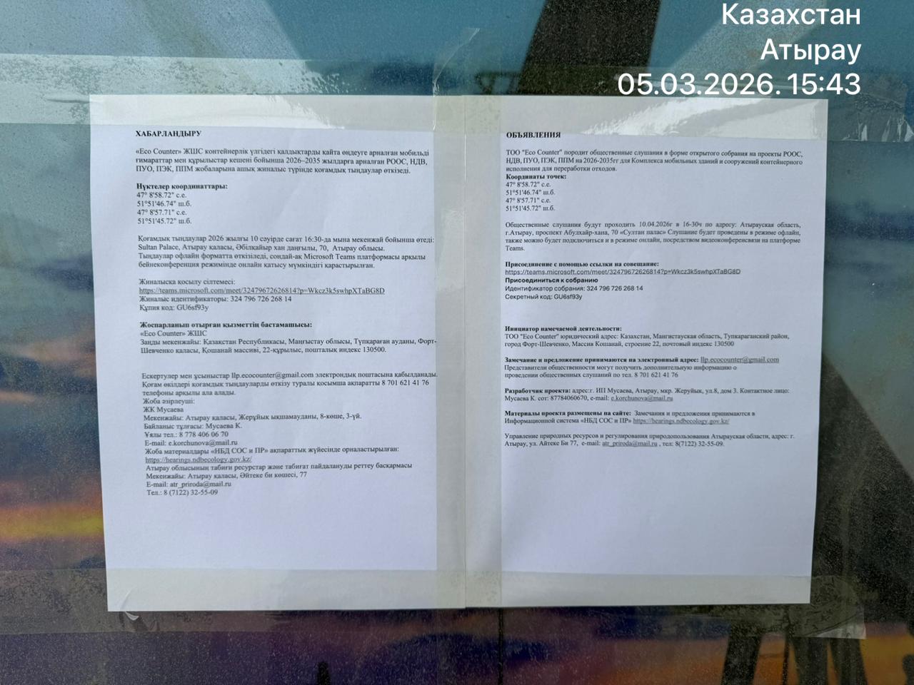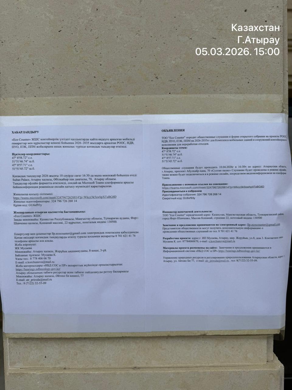 3. Общественные слушания организованны: Управление природных ресурсов и регулирования природопользования Атырауской области, atr.priroda@atyrau.gov.kz,