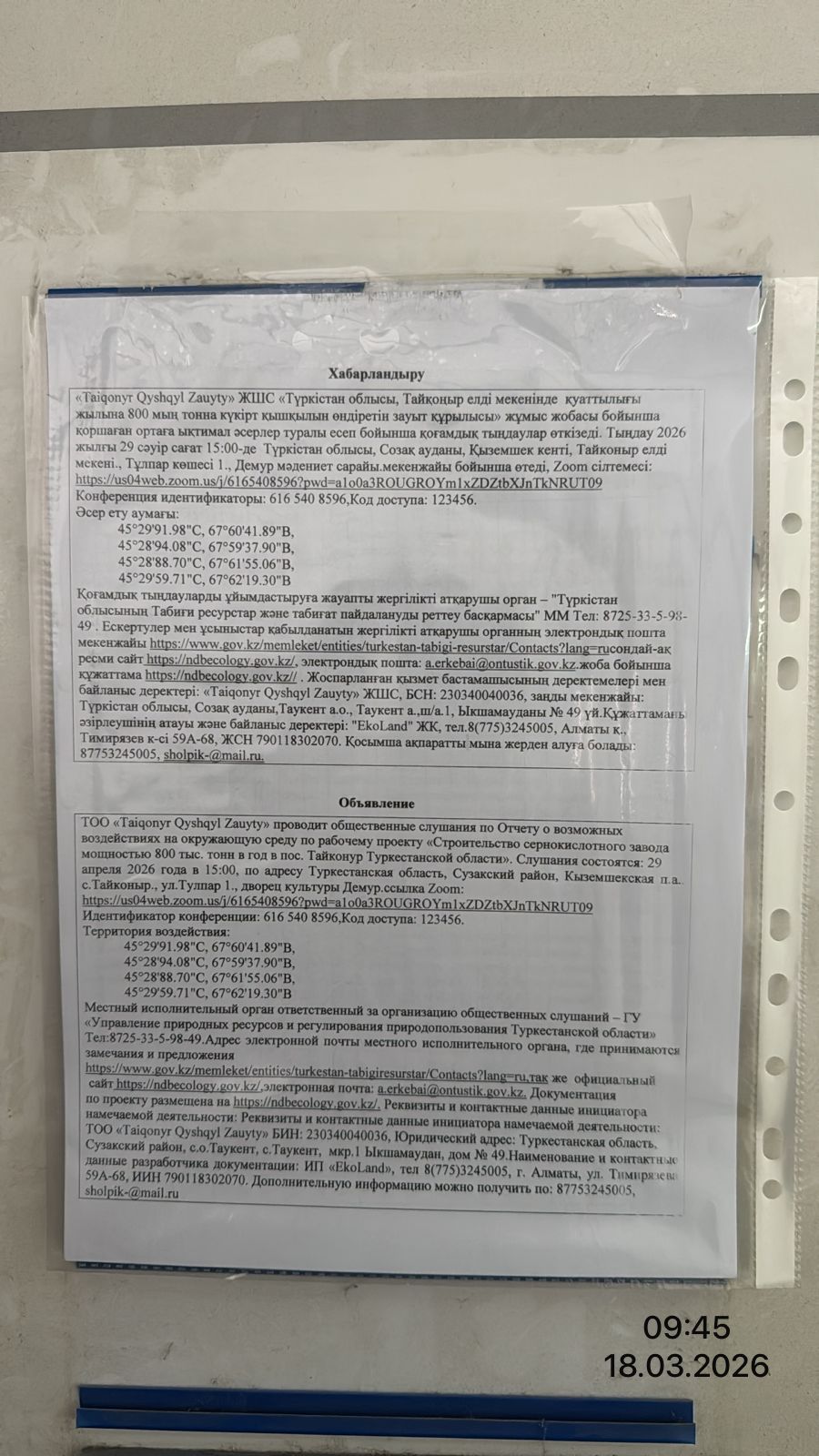 3. Общественные слушания организованны: Управление природных ресурсов и регулирования природопользования Туркестанской области, a.erkebai@ontustik.gov.kz,