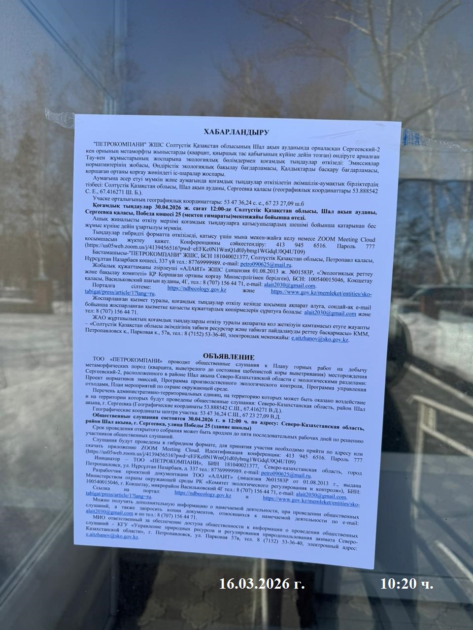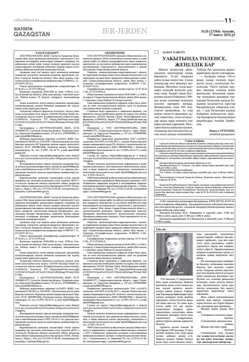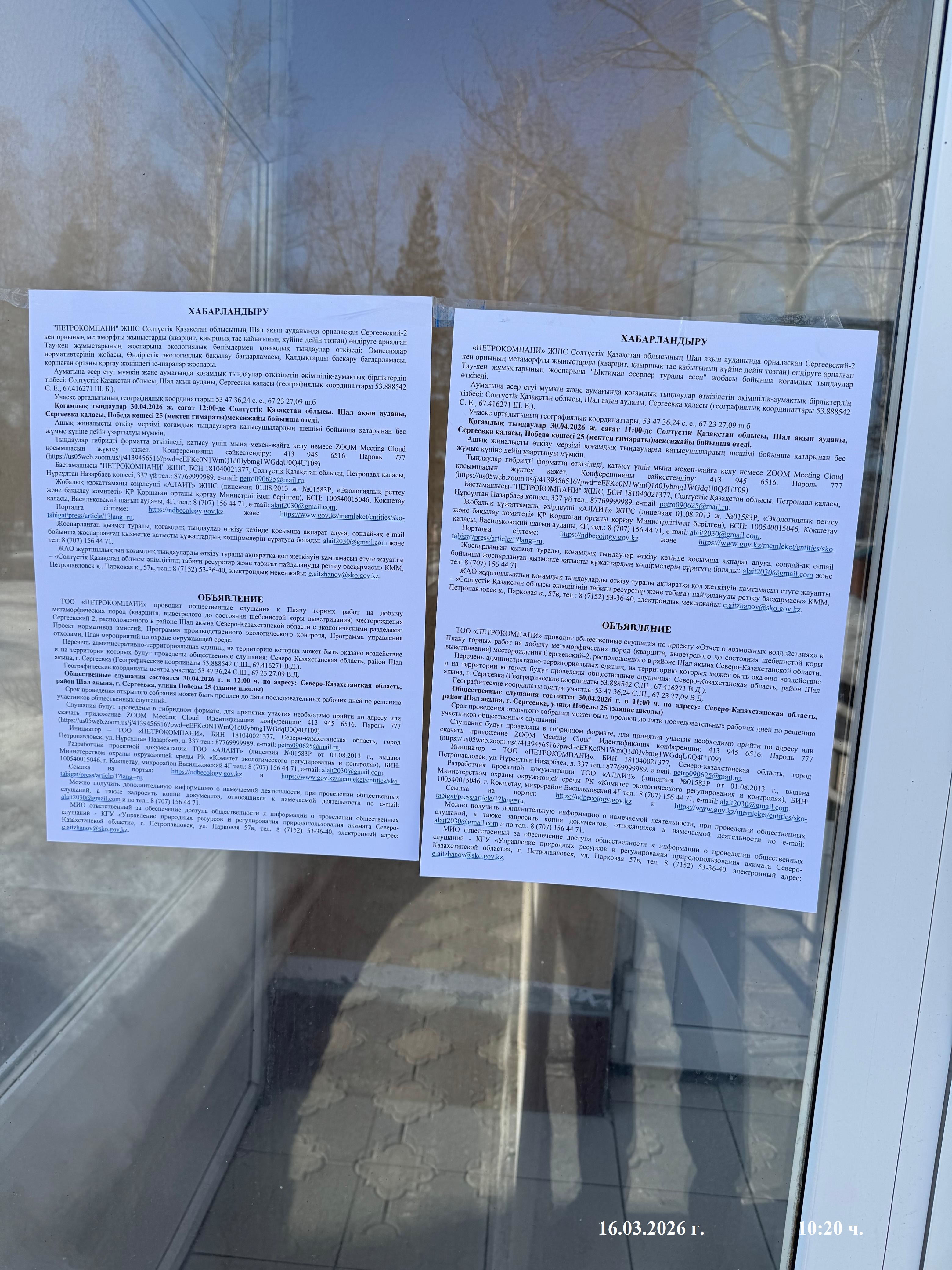 3. Общественные слушания организованны: Управление природных ресурсов и регулирования природопользования Северо-Казахстанской области, e.aitzhanov@sko.gov.kz,