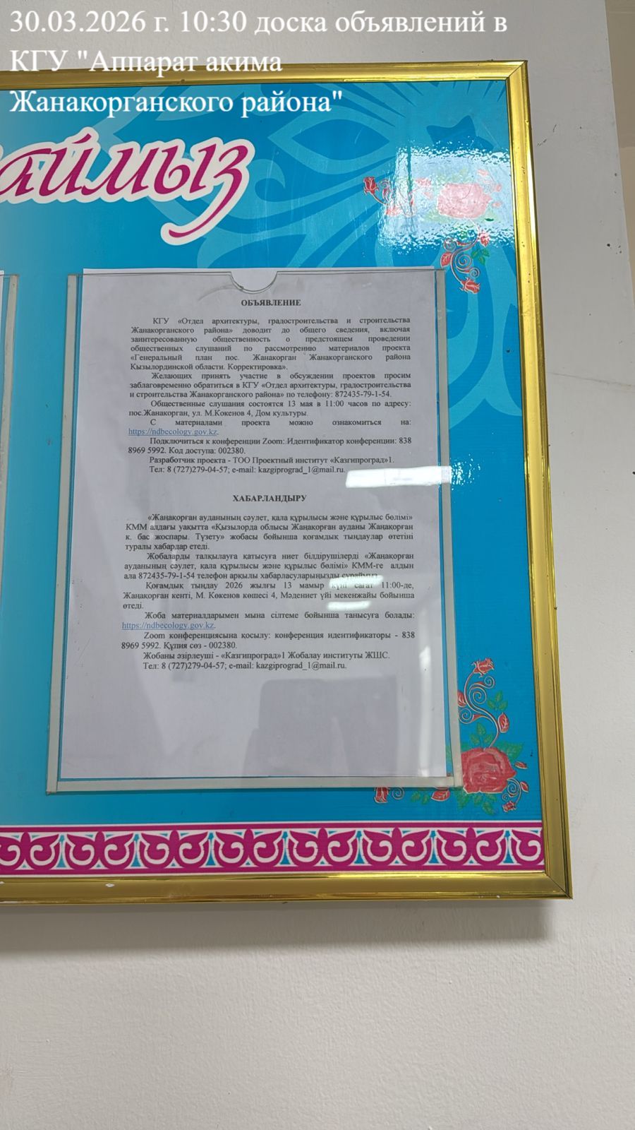 3. Общественные слушания организованны: Управление природных ресурсов и регулирования природопользования Кызылординской области, prd@korda.gov.kz 87242605362, 605369,