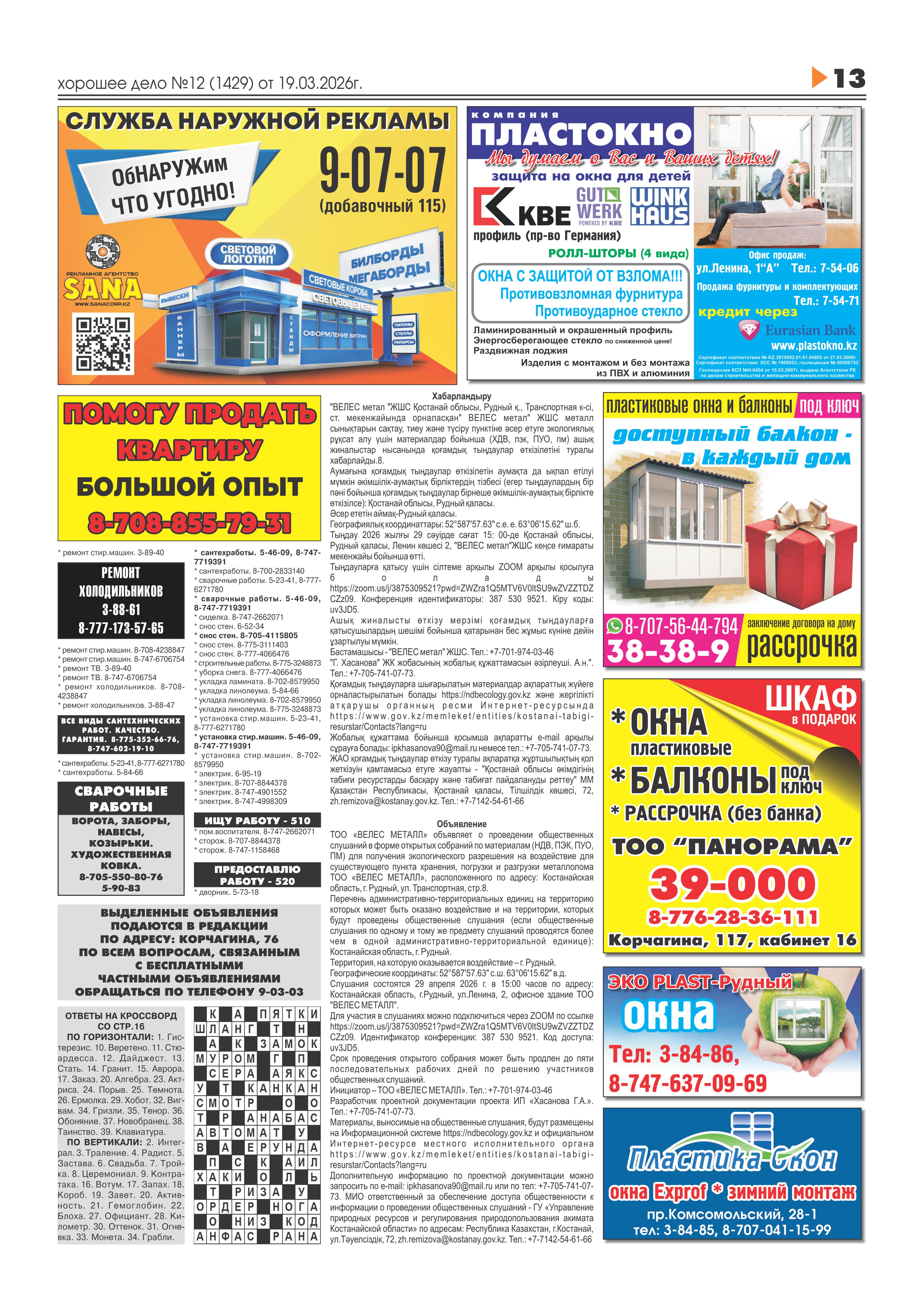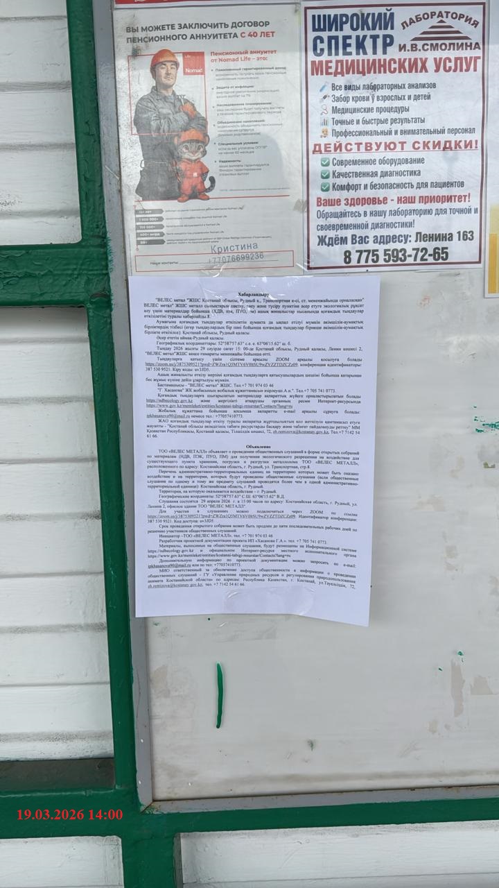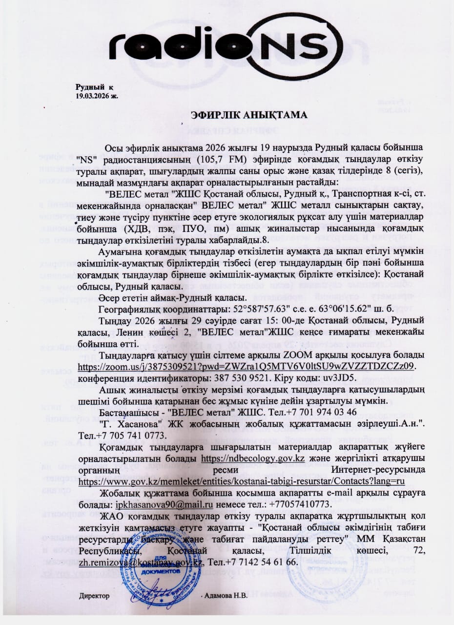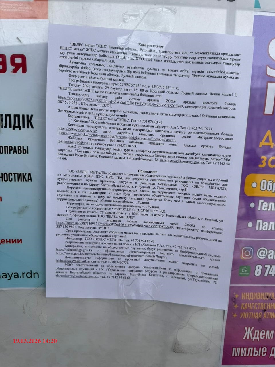 3. Общественные слушания организованны: Управление природных ресурсов и регулирования природопользования Костанайской области, zh.remizova@kostanay.gov.kz, 87142 546166,