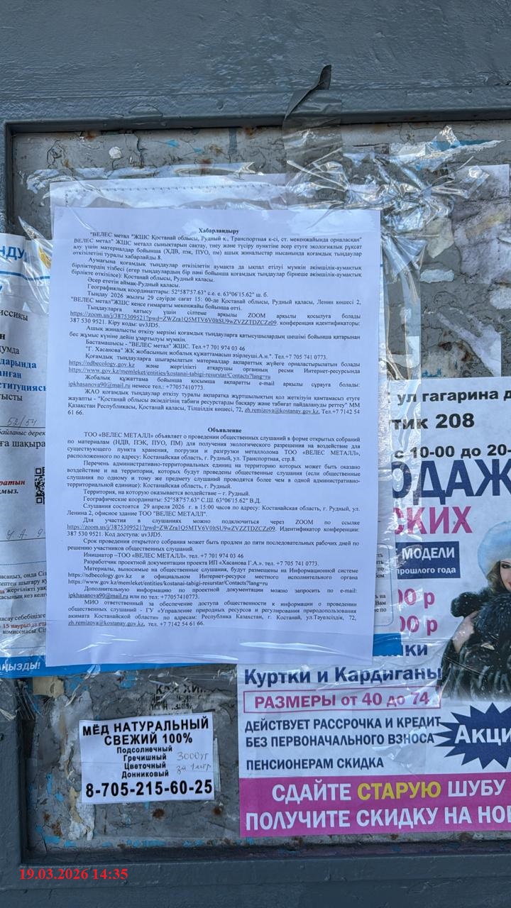4. Повестка дня общественных слушаний: Фактический адрес объекта – Костанайская область, г. Рудный, ул. Транспортная, строение 8. Основной вид деятельности – прием, хранение и отгрузка лома черных металлов. Объект является существующим и принят в аренду (договор безвозмездного пользова-ния №4 от 04.09.2025 года). Данный участок, существующий. Объект находится на территории промышленной зо-ны г. Рудный, земельный участок не попадает в санитарно-защитные зоны санитарно-неблагополучного по сибирской язве пункта и почвенных очагов сибирской язвы. Объект хранения, погрузки и отпуска металлического лома находится на одной терри-тории промышленной базы (договор прилагается). Годовой оборот металлолома на предприятии составляет 6000 тонн. Закуп лома и отходов черных и цветных металлов осуществляется на предприятиях РК для последующей сортировки и поставки на переработку на соответствующие перерабаты-вающие предприятия. Подразделение организовано на территории земельного участка промбазы, располо-женной на территории площадью 3000 кв.м. Помещение подключено к электроснабжению, резервные и альтернативные источники запрещены к использованию. Сбор/заготовка • Основным источником поступления на склад Лома и отходов черных и цветных ме-таллов является приобретение на тендерных площадках Республики Казахстан. • Лом и отходы черных и цветных металлов необходимо грузить в транспортные сред-ства и доставлять на предприятия и организации, осуществляющие прием и переработку лома черных и цветных металлов. Лом и отходы черных и цветных металлов сортируются в зависимости от вида, типа, состава, по габаритам, очищенный и не очищенный, после отгружается на предприятия осуществляющие прием лома и отходов черных и цветных металлов. Лом черных металлов. Лом и отходы черных металлов, в случае их поступления, не обрабатываются, не режется, сортируется по виду и отгружаются на перерабатывающие предприятия. Реализация. Реализация лома и отходов черных и цветных металлов осуществляется по заключенным договорам поставки потребителям Лома и перерабатывающим предприя-тиям. Отгружается автомобильным транспортом.