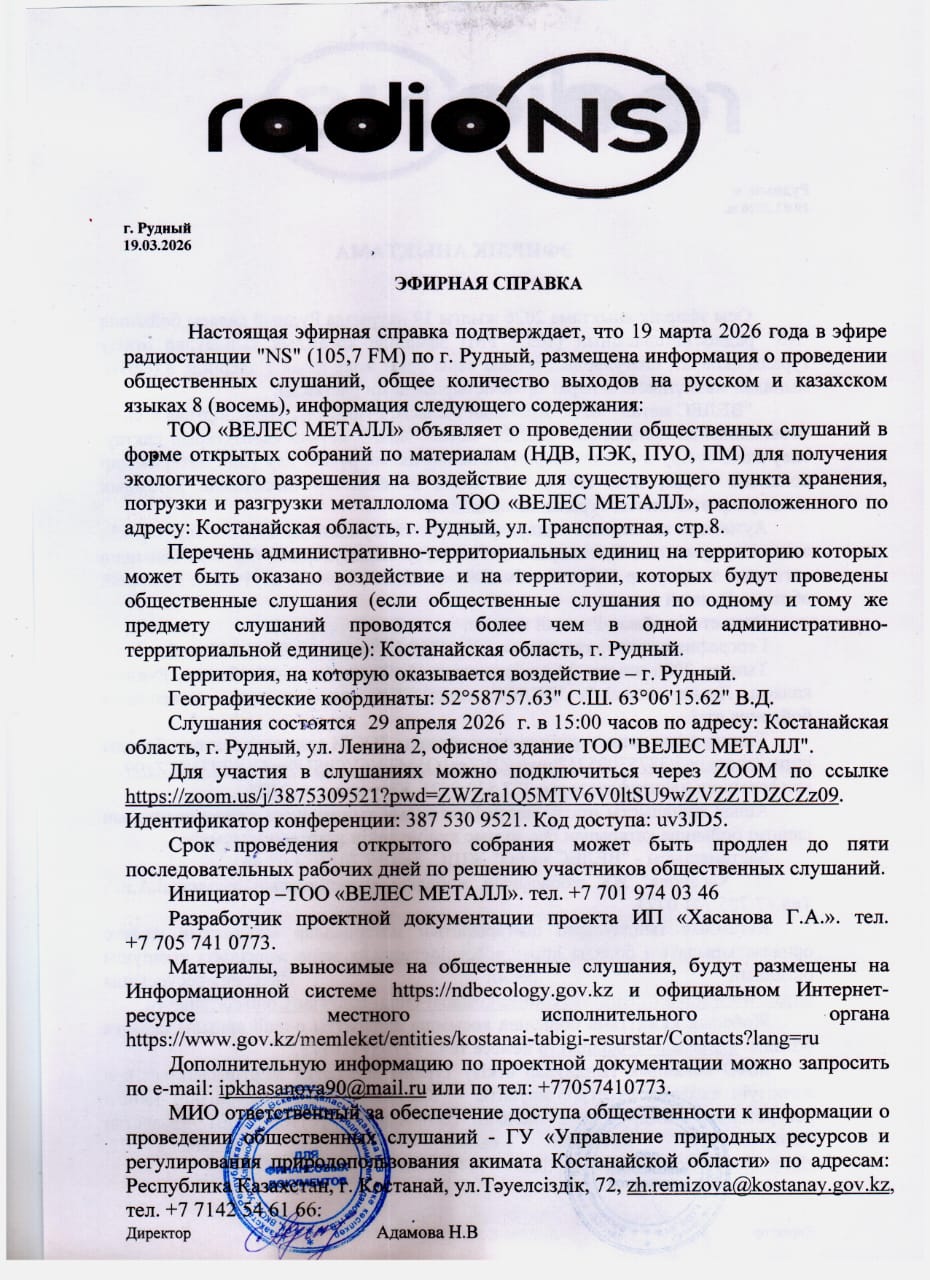 По проекту: Экологические материалы (НДВ, ПЭК, ПУО, ПМ) для получения экологического разрешения на воздействие для существующего пункта хранения, погрузки и разгрузки металлолома ТОО «ВЕЛЕС МЕТАЛЛ», расположенного по адресу: Костанайская область, г. Рудный, ул. Транспортная, стр.8
