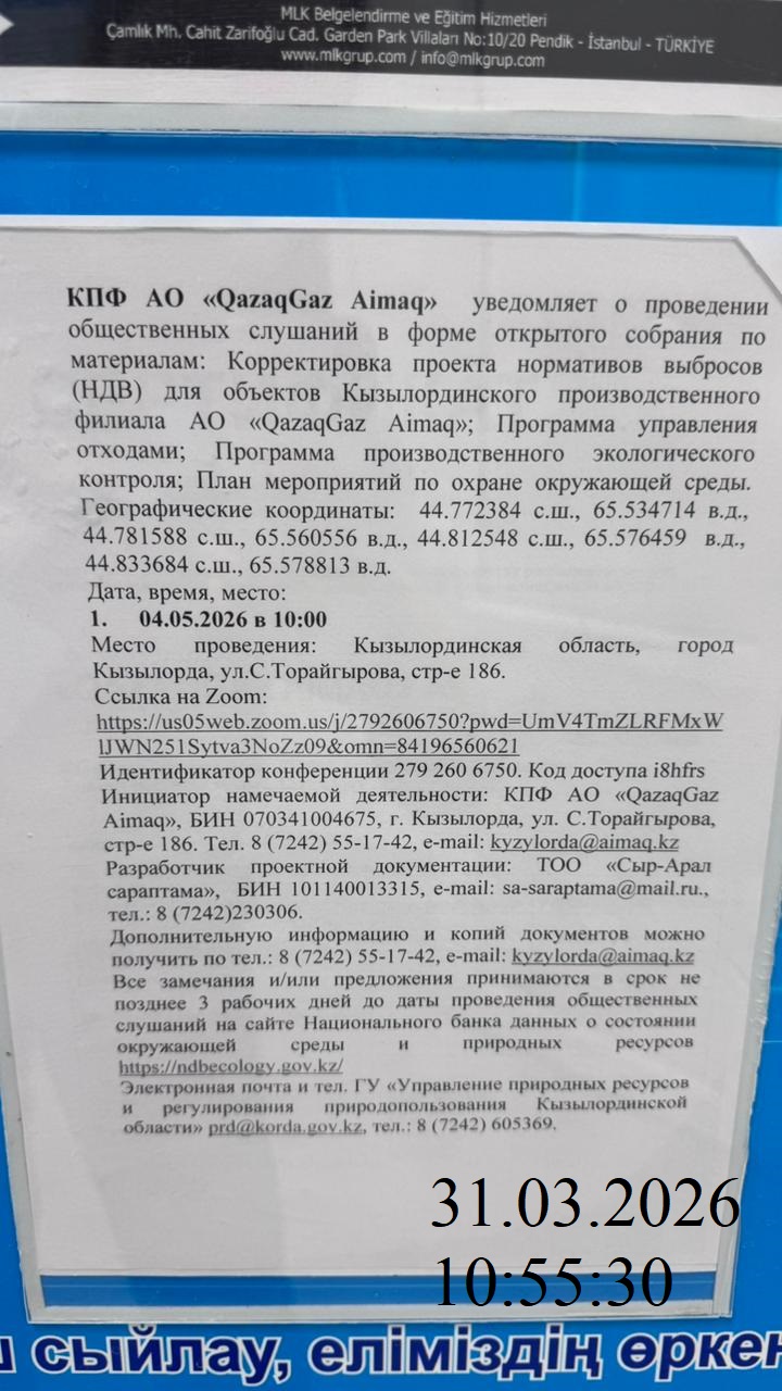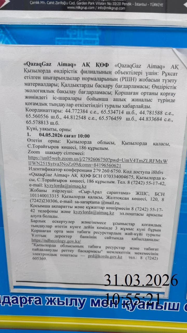 3. Общественные слушания организованны: Управление природных ресурсов и регулирования природопользования Кызылординской области, prd@korda.gov.kz 87242605362, 605369,
