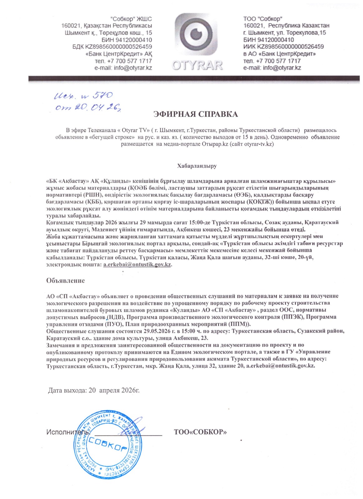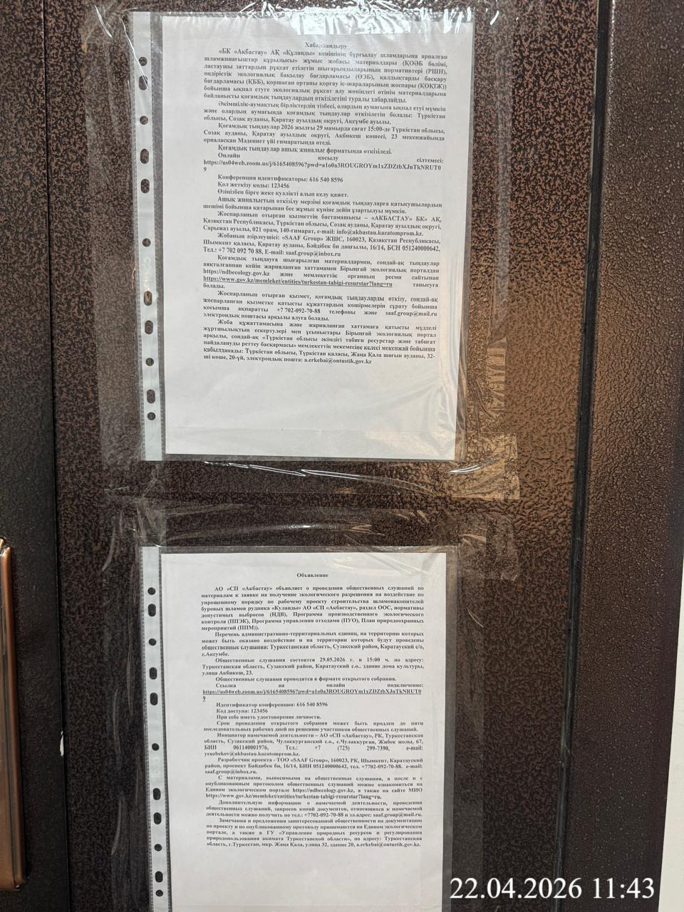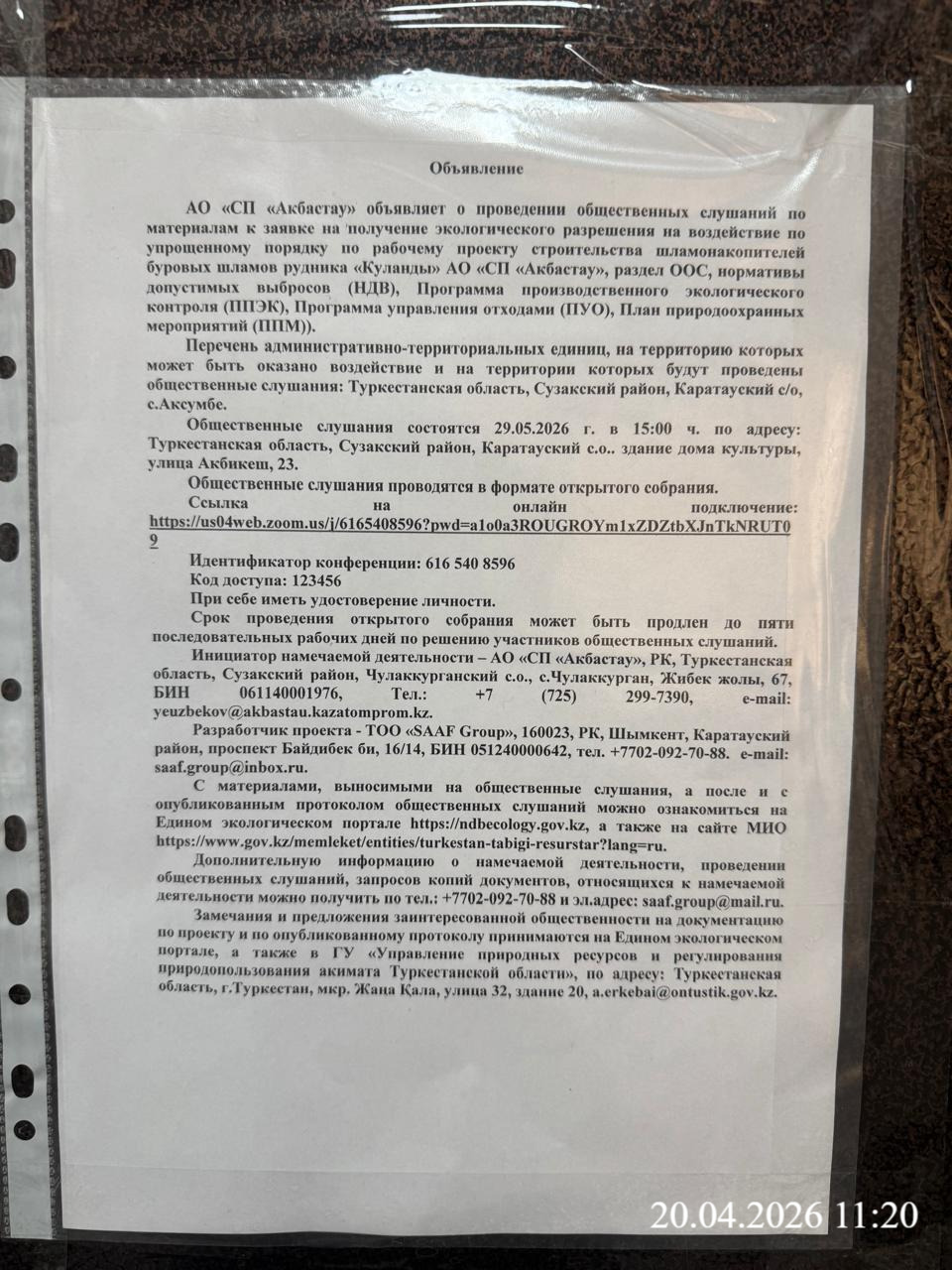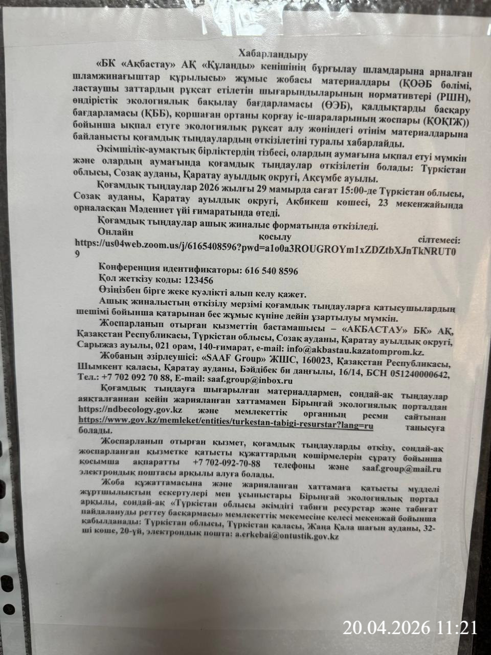 3. Общественные слушания организованны: Управление природных ресурсов и регулирования природопользования Туркестанской области, a.erkebai@ontustik.gov.kz,