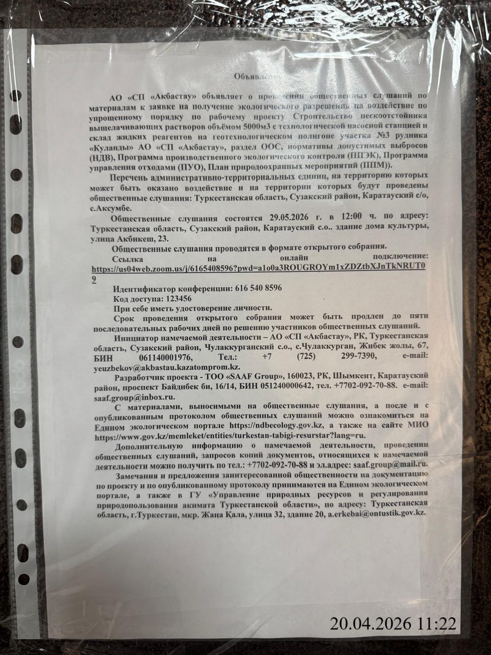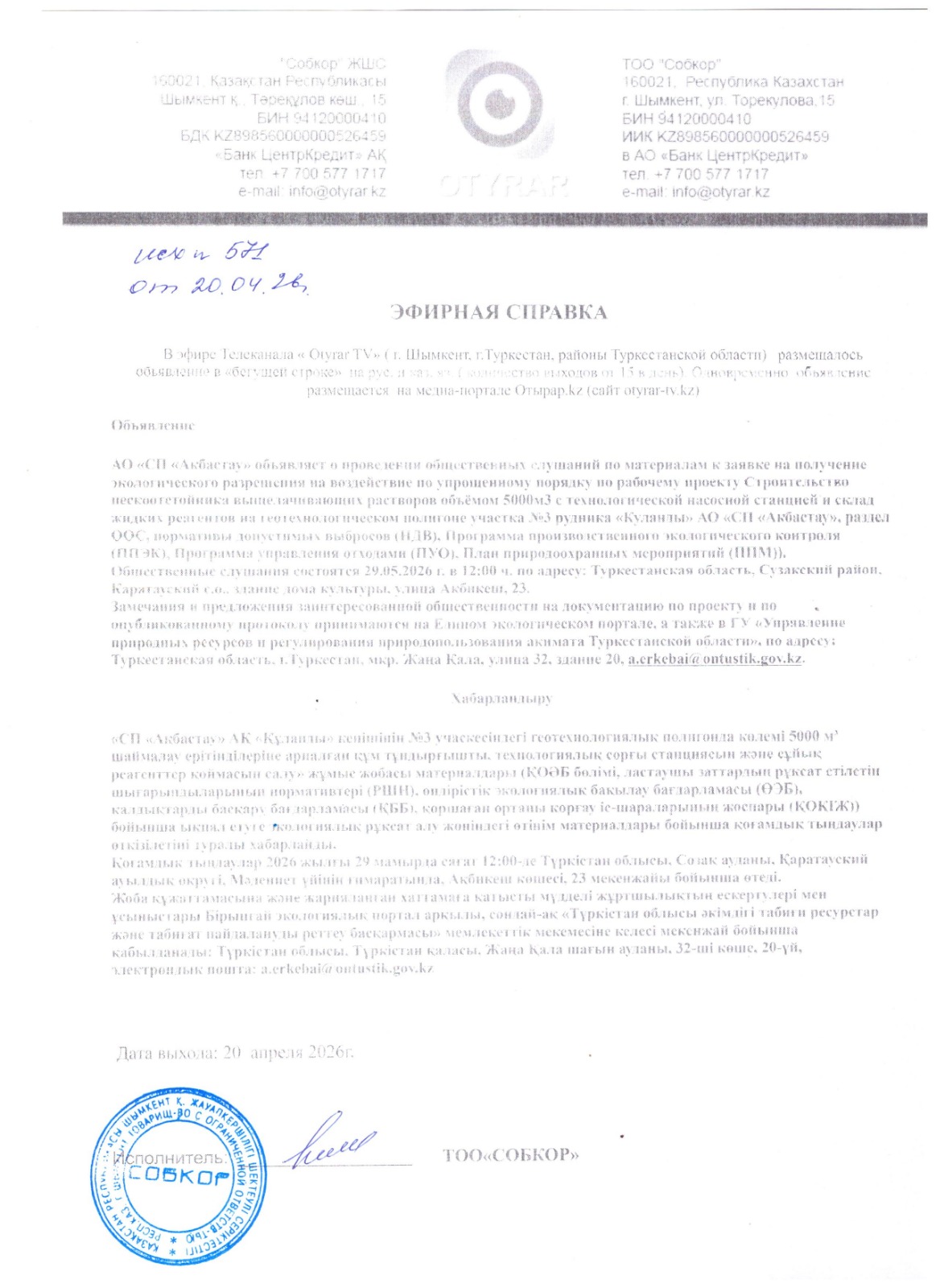 3. Общественные слушания организованны: Управление природных ресурсов и регулирования природопользования Туркестанской области, a.erkebai@ontustik.gov.kz,
