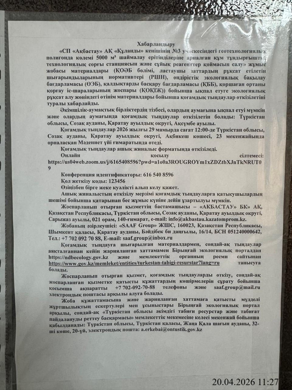 1.3. Контакты:mbadaev@akbastau.kazatomprom.kz; ndbecology.gov.kz;