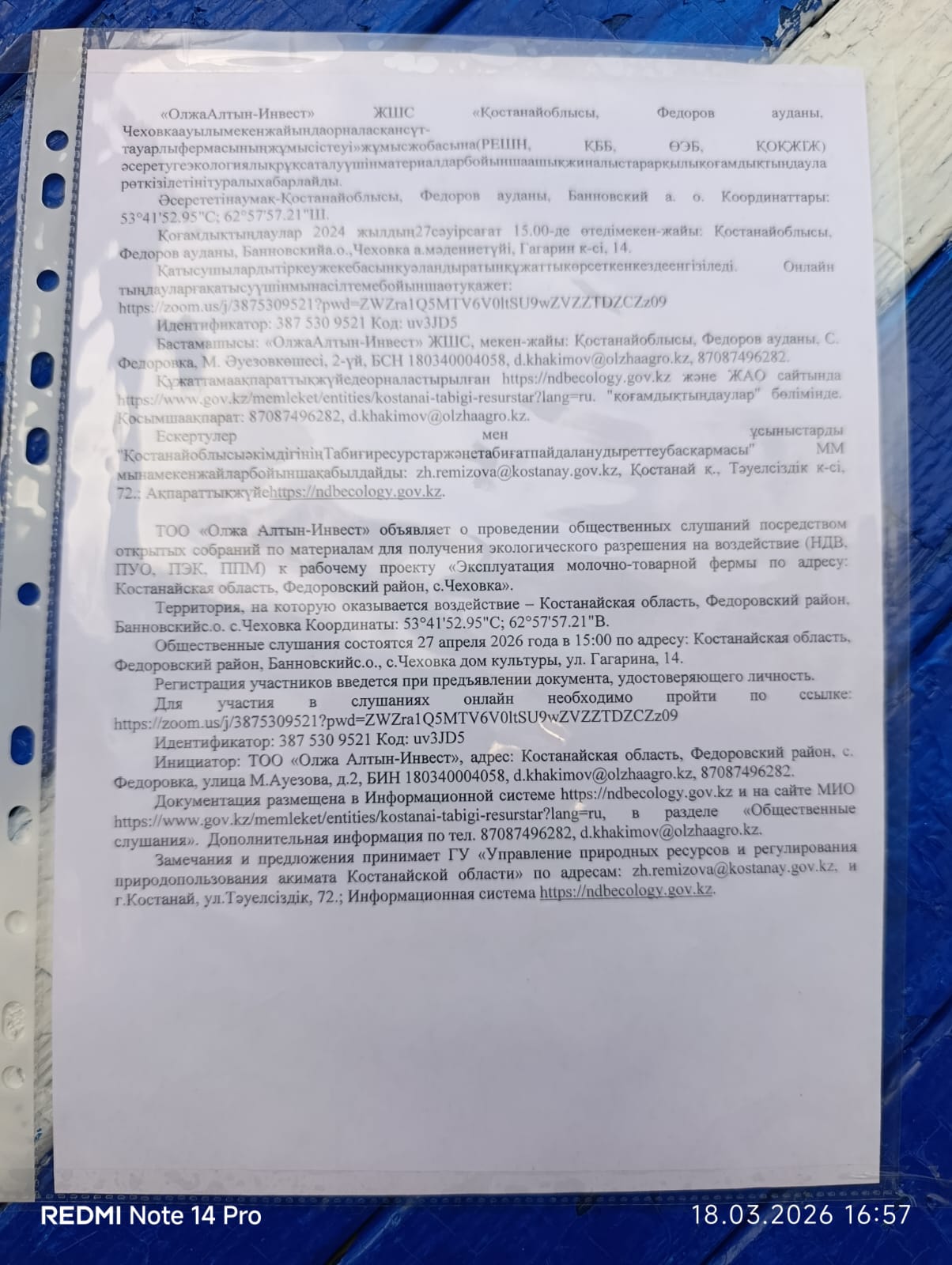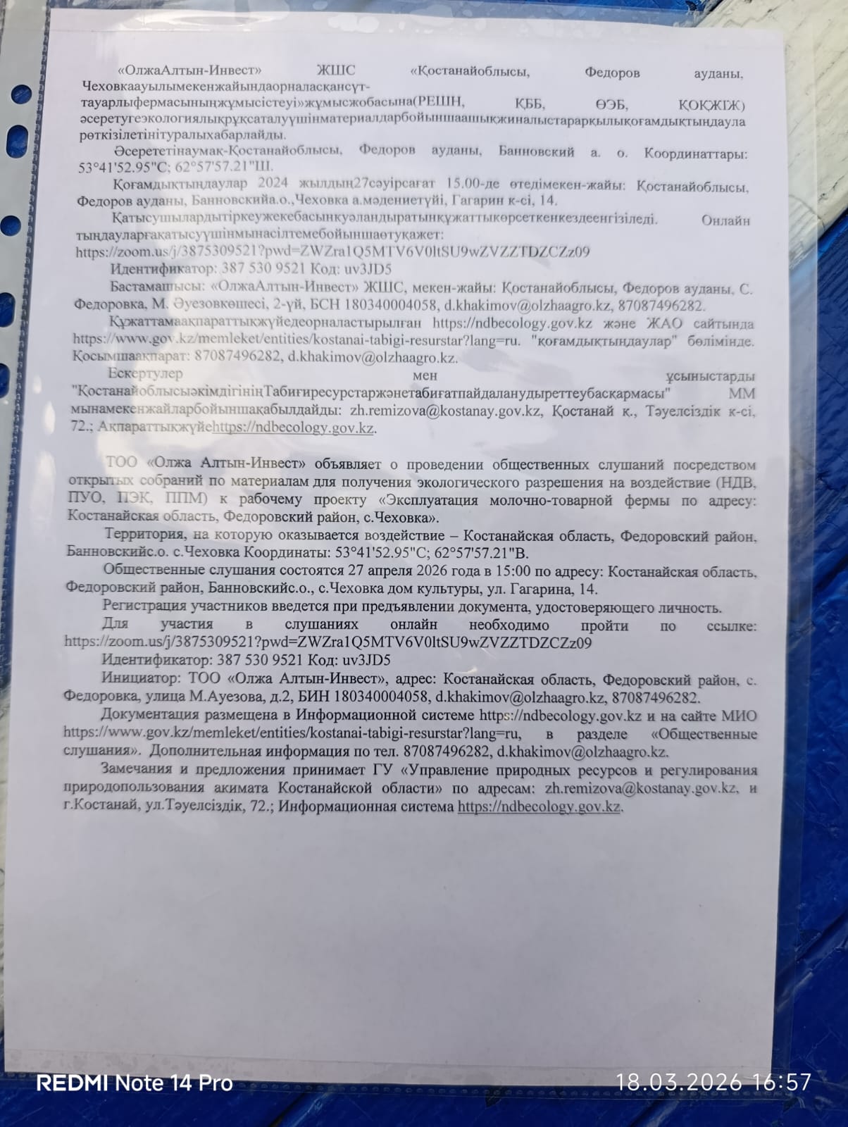 3. Общественные слушания организованны: Управление природных ресурсов и регулирования природопользования Костанайской области, zh.remizova@kostanay.gov.kz, 87142 546166,