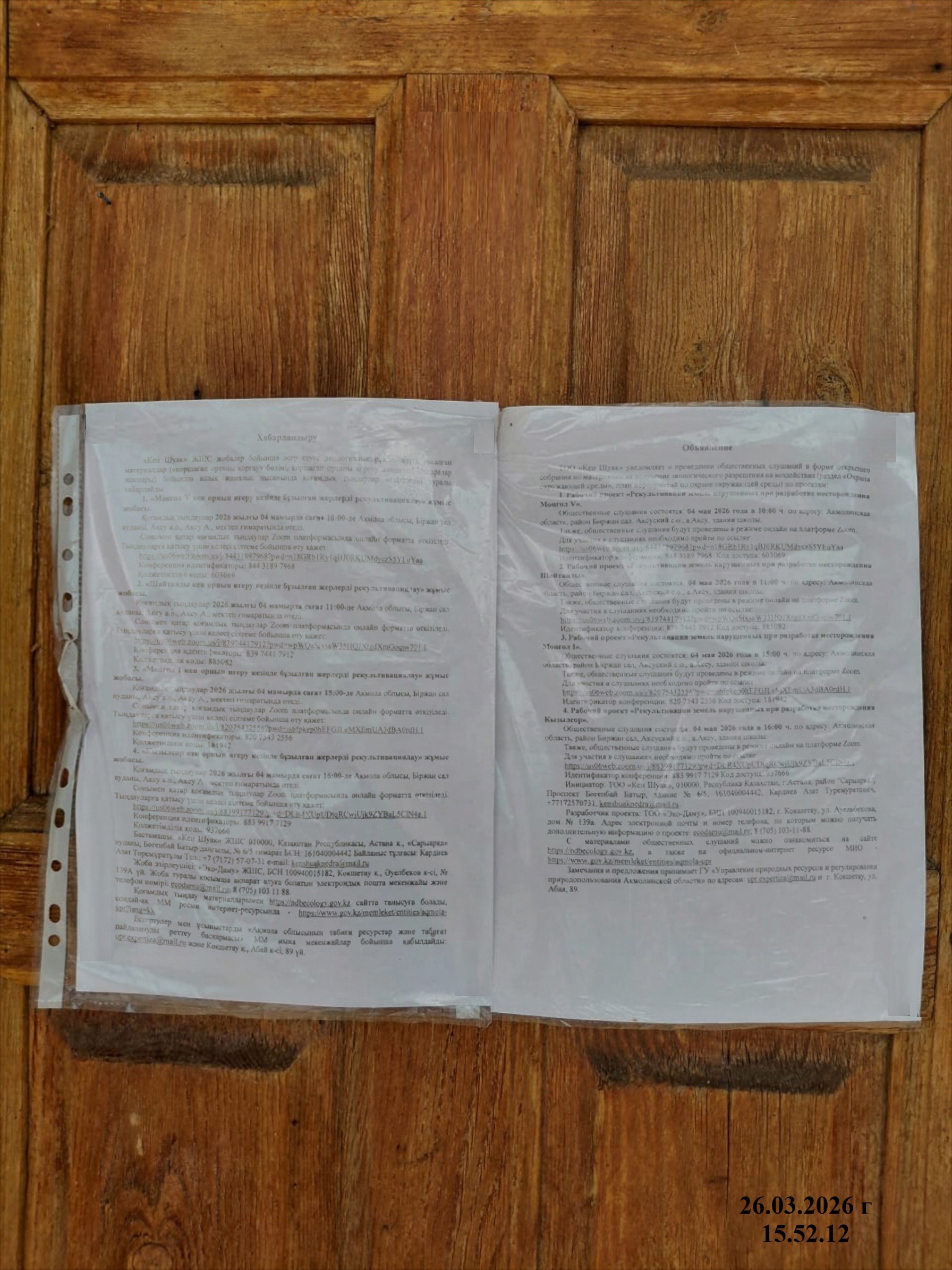 3. Общественные слушания организованны: Управление природных ресурсов и регулирования природопользования Акмолинской области, expeco@mail.ru,