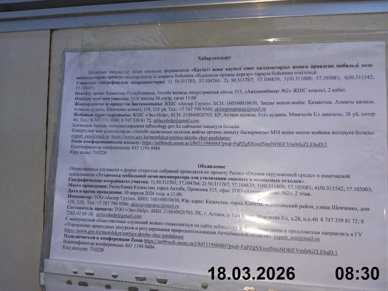 4. Повестка дня общественных слушаний: «Установка печи-инсинератора «Есо-Help-120» предназначена для сжигания горючих отходов, отходов птицефабрик, промасленной ветоши, корпусов компьютерной и оргтехники, отработанных масел, отработанных фильтров, нефтесодержащих отходов, медицинских отходов (класса А, Б, В) в т.ч. просроченных препаратов и лекарственных средств, бумажных документов, биоорганических отходы, промышленных, химических, текстильных, пищевых отходов, с целью превращения их в стерильную золу (пепел), которая допускается к захоронению на полигоне ТБО. Установку предполагается разместить на производственной базе ТОО «Аклер Групп» (согласно договору аренды земельного участка №12/01 от 24.12.2025 г. с ТОО «Автокомбинат №2» которая расположена в городе Актобе, Промзона 315. Согласно государственному акту на землю №0250997 от 01.04.2020 г. Кадастровый номер земельного участка: 02036139314. Координаты размещения инсинератора 50018'41,84''С, 57006'17,96''В Площадь участка составляет 2,5046 га. Объект расположен на расстоянии 890 м в юго-западном направлении от жилой застройки, и в юго-восточном направлении на расстоянии 1219 м. С северной стороны на расстоянии 68 м расположены ТОО «БетонПресс». С северо-востока на расстоянии 20 м Кровельный центр ТОО «Агран». С восточной стороны на расстоянии 20 м ТОО «Агран». С юго-восточной стороны на расстоянии 142 м расположена производственная база ТОО West Premium Service компания, Промзона, 638. С южной стороны на расстоянии 178 м расположена производственная база ТОО "Линарис". С юго-западной стороны на расстоянии 154 м расположена ТОО Сатр Завод Промзона, 474, Актобе. С западной стороны на расстоянии 70 м компания «Steel construction». С северо-западной стороны на расстоянии 83 м Актюбинский Шпальный Завод.