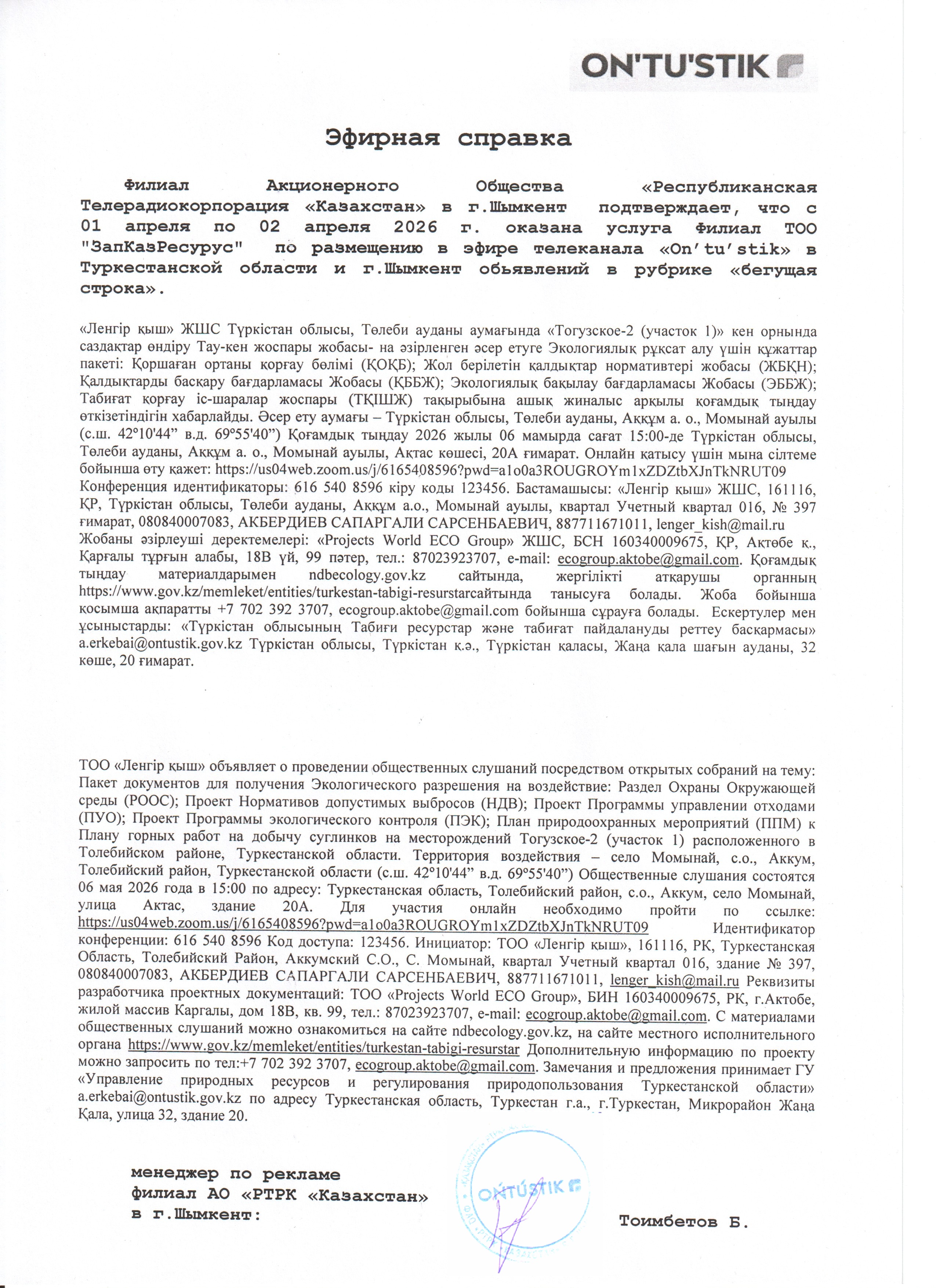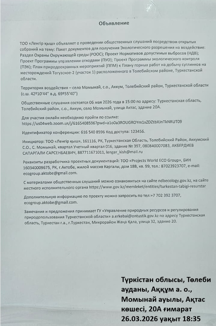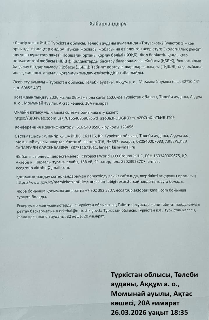 3. Общественные слушания организованны: Управление природных ресурсов и регулирования природопользования Туркестанской области, a.erkebai@ontustik.gov.kz,