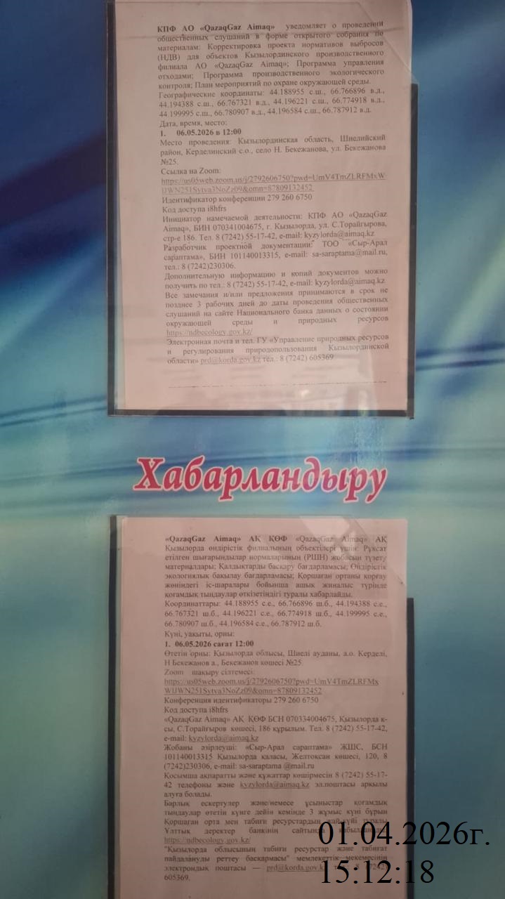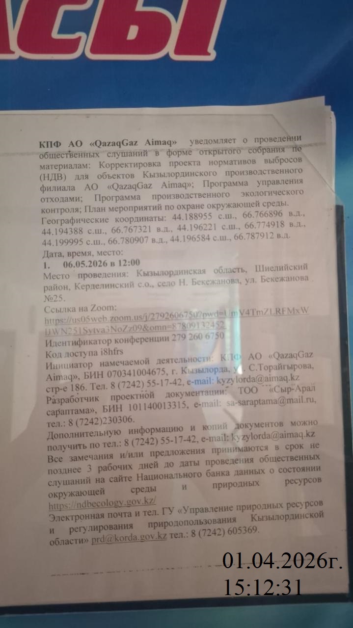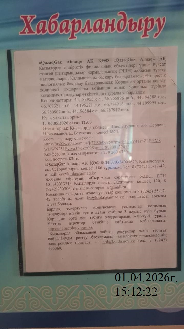 3. Общественные слушания организованны: Управление природных ресурсов и регулирования природопользования Кызылординской области, prd@korda.gov.kz 87242605362, 605369,