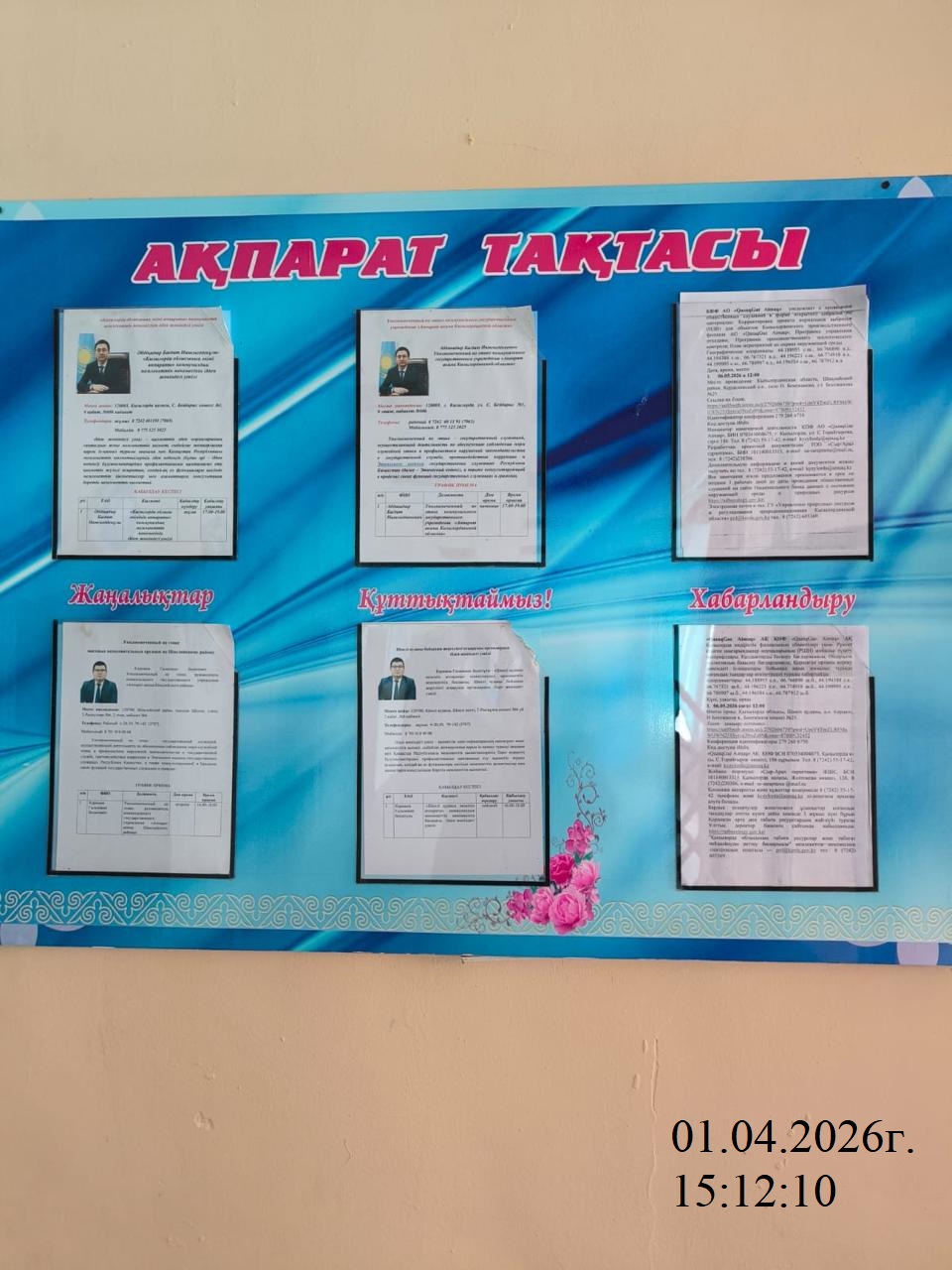 6.3. расположение мест, специально предназначенных для Размещения печатных объявлений (доски объявлений): Доска объявлений аппарата акима села Н.Бекжанова
