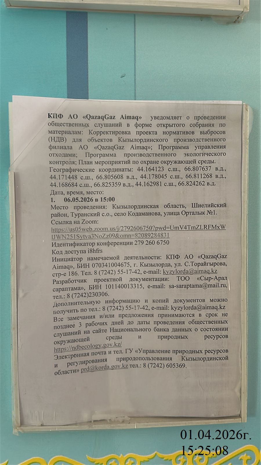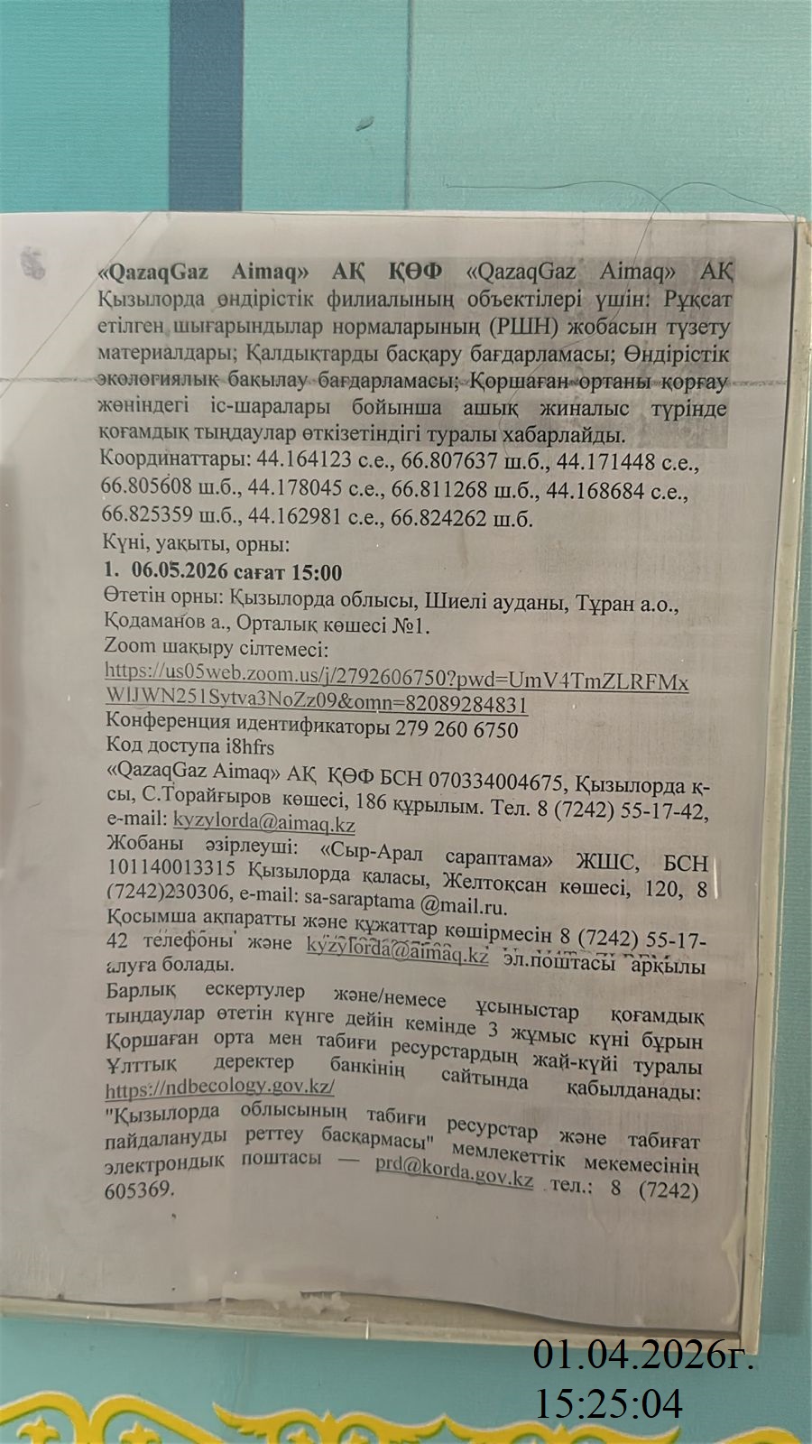 3. Общественные слушания организованны: Управление природных ресурсов и регулирования природопользования Кызылординской области, prd@korda.gov.kz 87242605362, 605369,