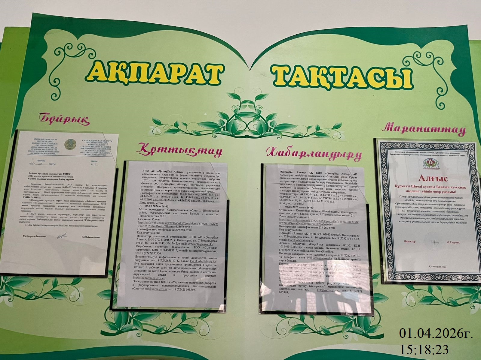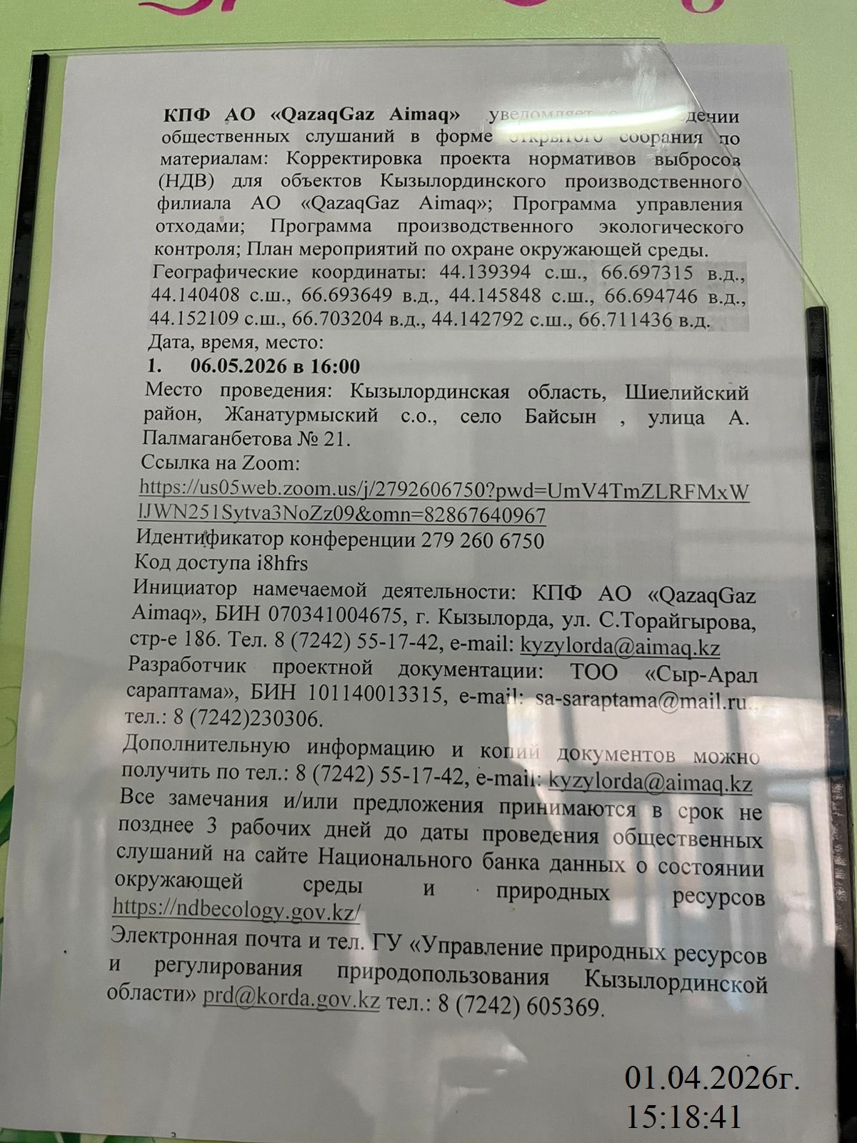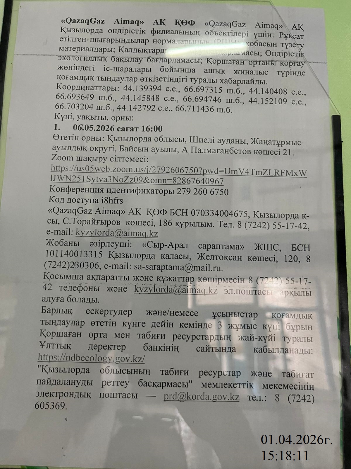 3. Общественные слушания организованны: Управление природных ресурсов и регулирования природопользования Кызылординской области, prd@korda.gov.kz 87242605362, 605369,