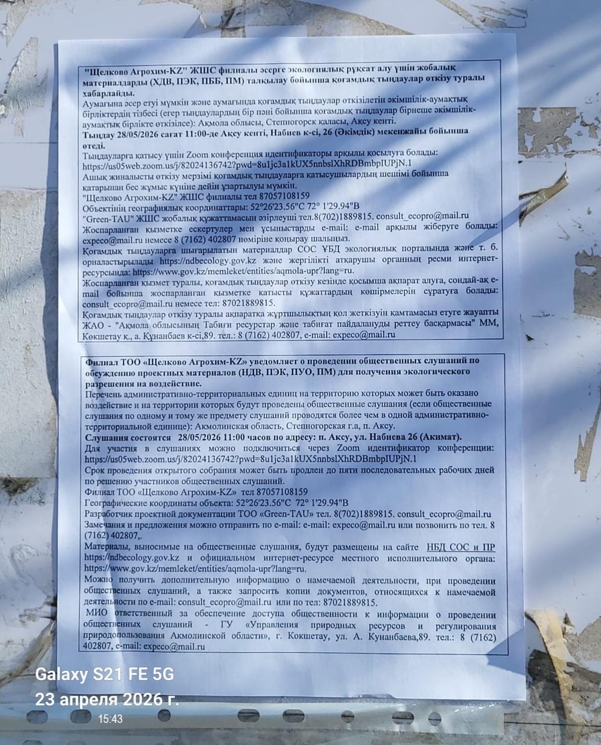 4. Повестка дня общественных слушаний: Филиал ТОО «Щелково Агрохим-KZ» является действующим предприятием (ранее до 2025 года предприятие называлось ТОО «Прогресс-СельхозХим»). Основным направлением деятельности является производство химических средств для защиты растений. Вид деятельности согласно раздела 1 приложения 1 Экологического кодекса, пункт 5. Химическая промышленность и подпункта 5.1.4 пестицидов и биоцидов Основное производство представлено двумя участками производства препаратов: 1. участок производства пестицидов №1 «Фенизан, ВР (360 г/л, дикамба + 22,2 г/л хлорсульфурон)», «Титул Дуо, ккр (200 г/л, пропиконазол + 200 г/л, тебуконазол)»; «Зенит, ккр» (950 г/л 2-ЭГЭ 2,4Д-кислоты). 2. участок производства пестицидов №2 «Овсюген Экстра, КЭ» (140 г/л, феноксапроп-п-этил + 35 г/л, фенклоразол-этил (антидот))»; «Овсюген Супер, КЭ» (140 г/л, феноксапроп-п-этил + 47 г/л, антидота)» «Спрут Экстра, вр» (540 г/л глифосата кислоты)». Наработка препаратов осуществляется поочередно. Линия наработки гербицида «Фенизан, вр»: • мощность производства - 50 тонн/год; • производительность участка - 10м3/сутки; Линия наработки гербицида «Титул Дуо, ккр»: • мощность производства - 450 тонн/год; • производительность участка - 10м3/сутки; Линия наработки гербицида «Зенит, ккр»: • мощность производства - 900 тонн/год; • производительность участка - 10 м3/ сутки; Линия наработки гербицида «Овсюген Экстра, кэ» и «Овсюген Супер, кэ»: • мощность производства - 700 тонн/год; • производительность участка - 12м3/сутки; Линия наработки гербицида «Спрут Экстра, вр»: • мощность производства - 1500 тонн/год; • производительность участка - 12м3/сутки Вспомогательное производство: Сварочный пост №1; Мех. мастерская; Склад сырья (автопогрузчик).
