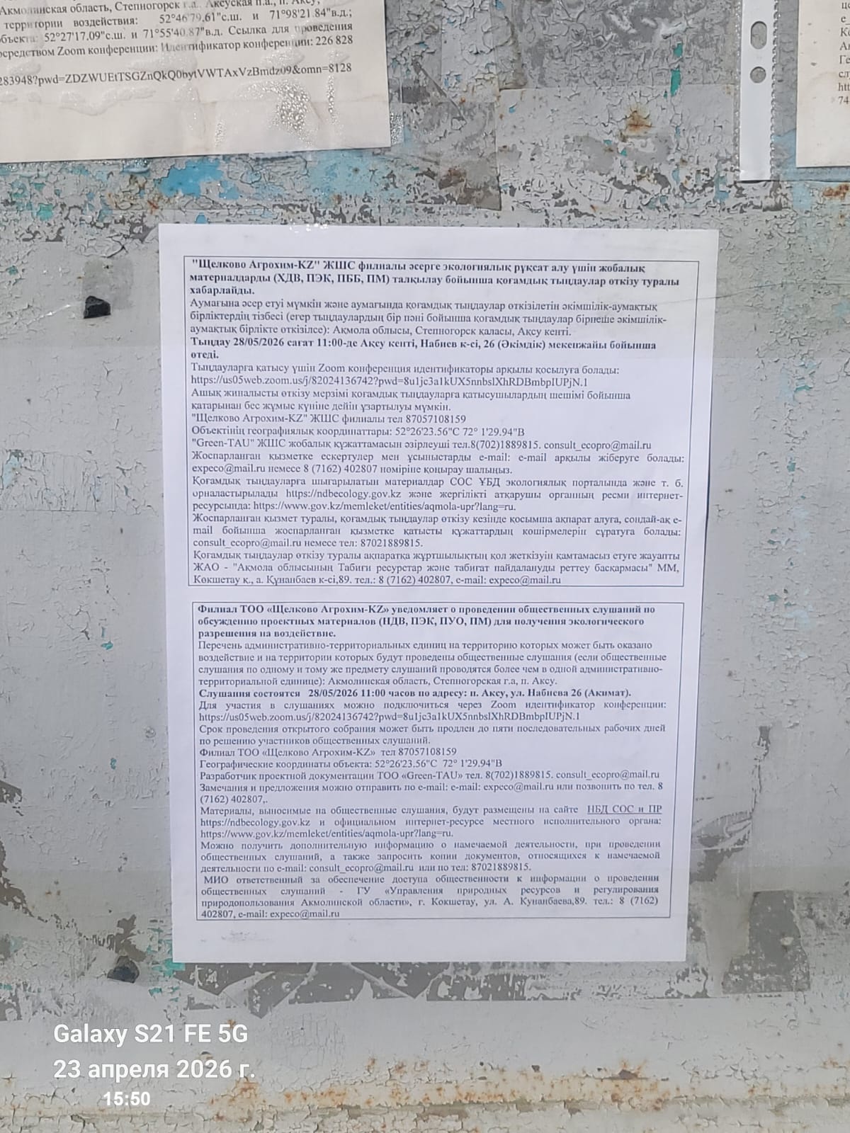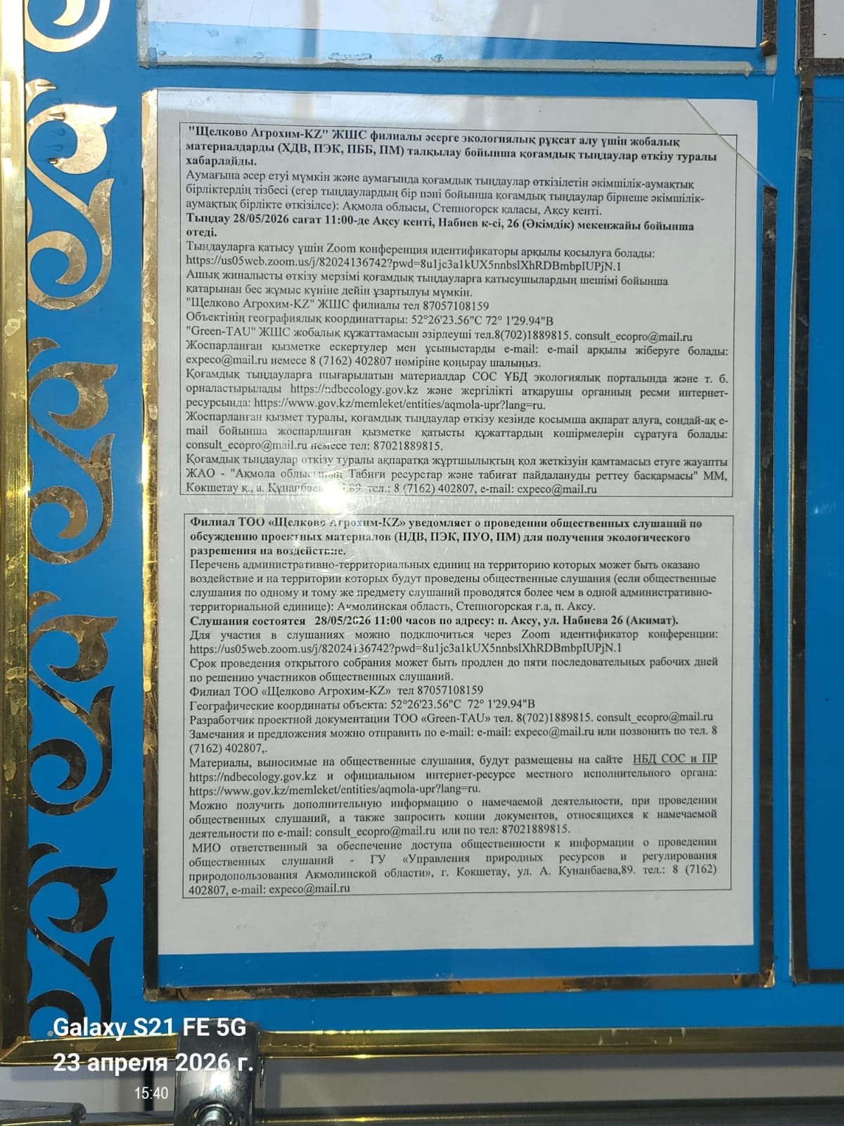 3. Общественные слушания организованны: Управление природных ресурсов и регулирования природопользования Акмолинской области, expeco@mail.ru,