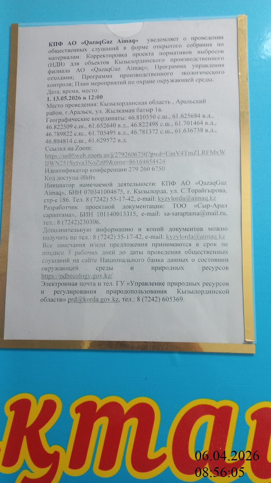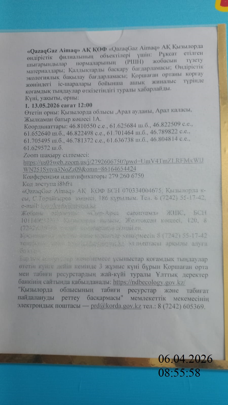3. Общественные слушания организованны: Управление природных ресурсов и регулирования природопользования Кызылординской области, prd@korda.gov.kz 87242605362, 605369,