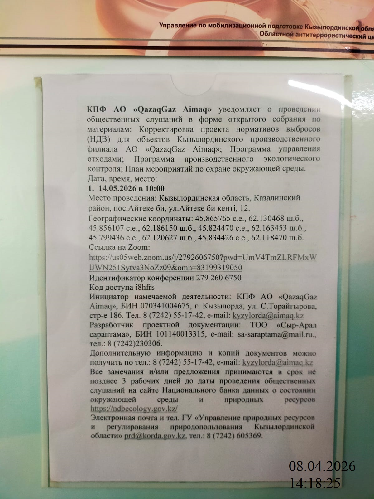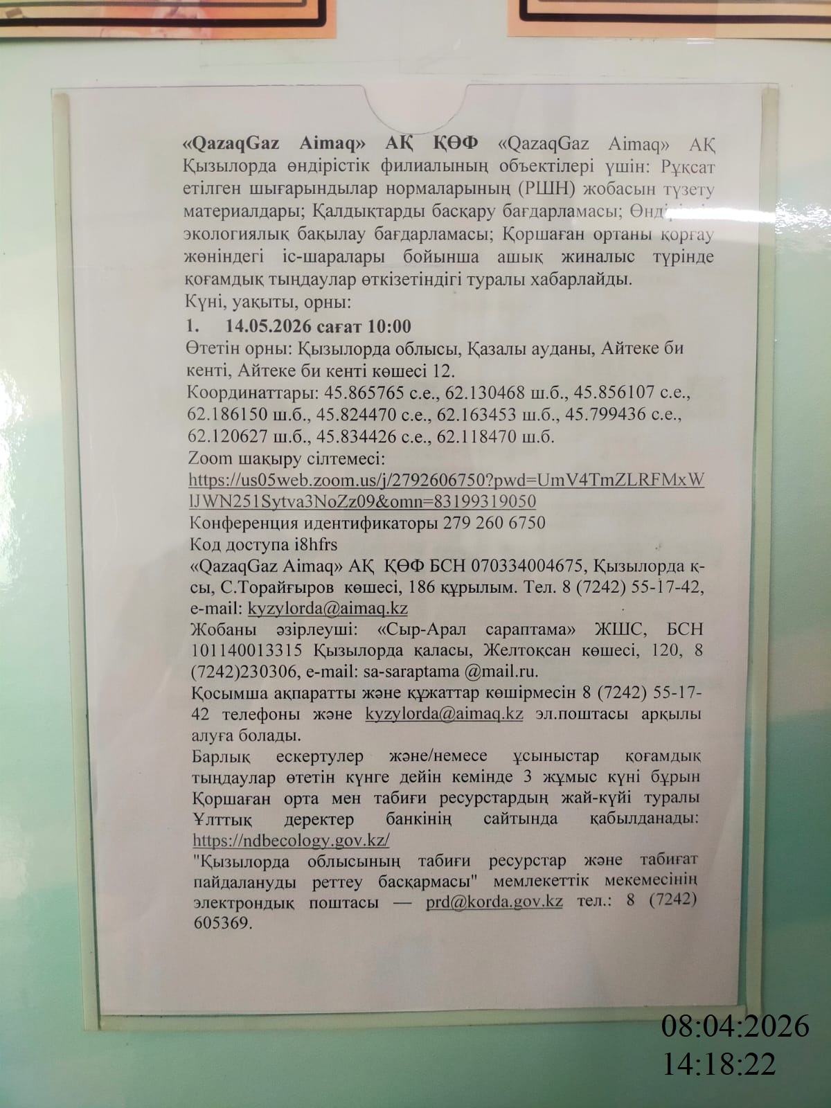3. Общественные слушания организованны: Управление природных ресурсов и регулирования природопользования Кызылординской области, prd@korda.gov.kz 87242605362, 605369,