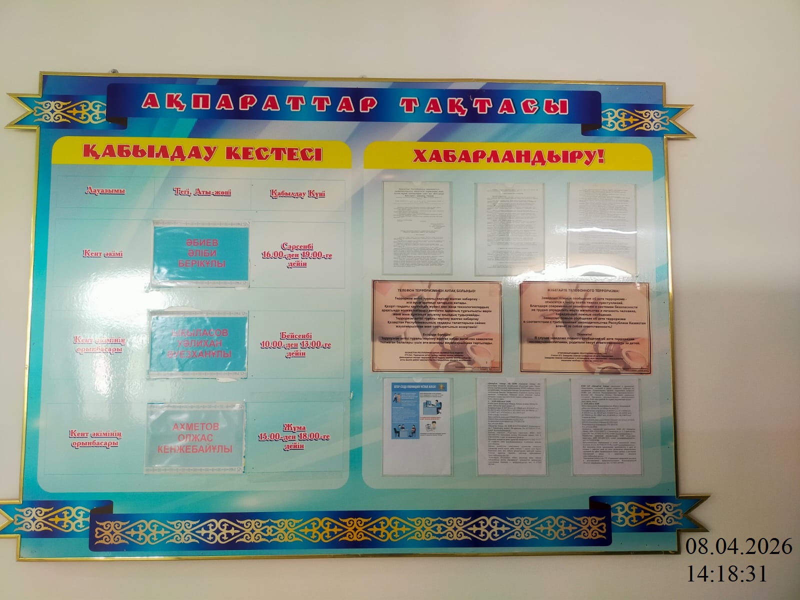 6.3. расположение мест, специально предназначенных для Размещения печатных объявлений (доски объявлений): Доска объявлений аппарата акима п.Айтеке би