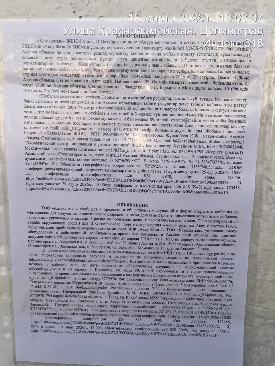 1.2. Место проведения: Акмолинская область, Степногорск Г.А., Заводская п.а., п.Заводской, ул. Бауыржан Момышулы, 15 (здание Акимата, 2 этаж). Ссылка для проведения слушаний в онлайн формате, посредством Zoom конференции: 2) Дата и время: 13 март 2026г., 15:00ч. Идентификатор конференции: 226 828 3948; Код доступа: 123456, https://us06web.zoom.us/j/2268283948?pwd=ZDZWUEtTSGZnQkQ0bytVWTAxVzBmdz09&omn=85630876510.