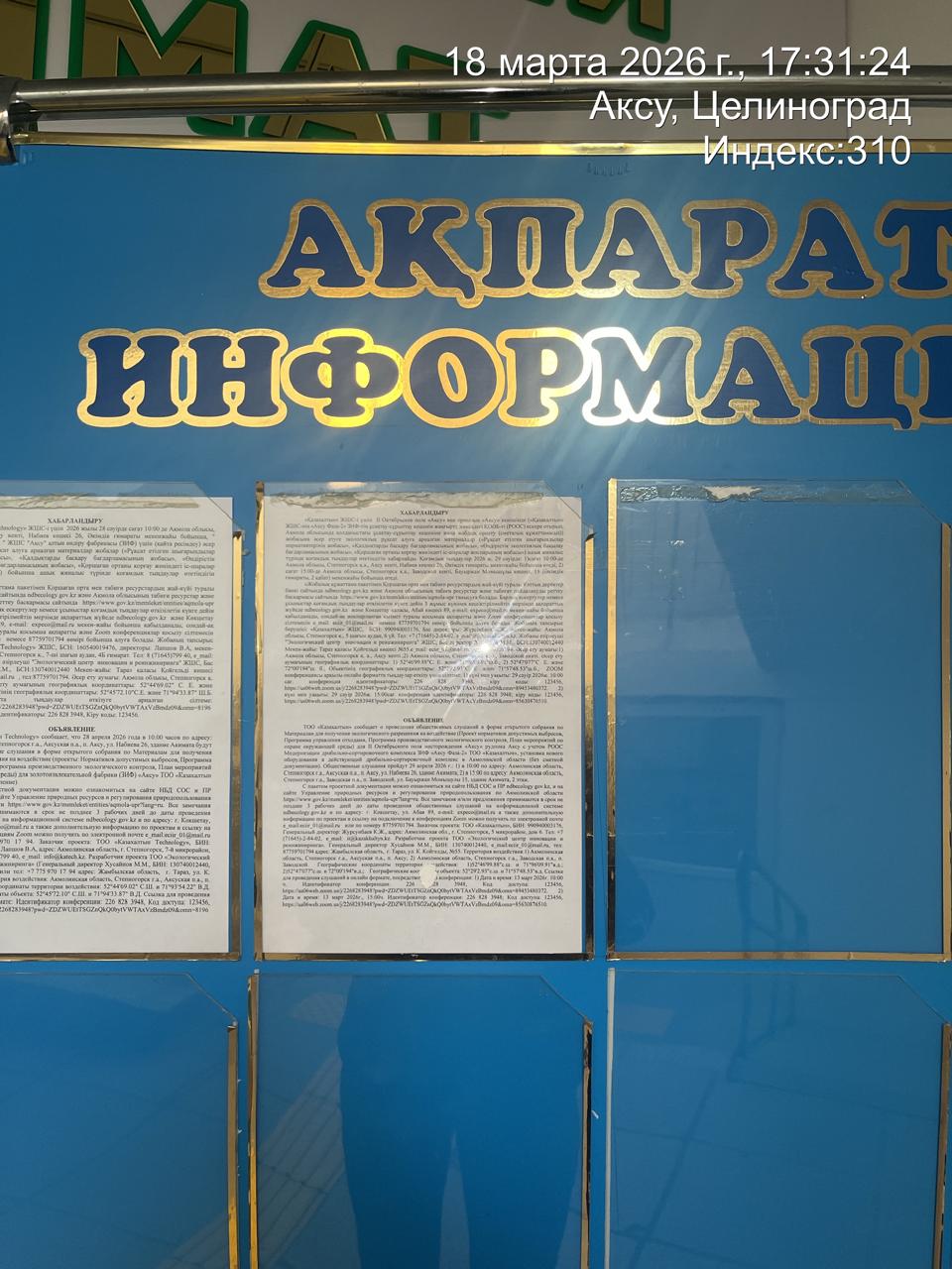 6.3. расположение мест, специально предназначенных для Размещения печатных объявлений (доски объявлений): Акмолинская область, Степногорск Г.А., Заводская п.а., п.Заводской, ул.Бауыржан Момышулы, 15 (здание Акимата)