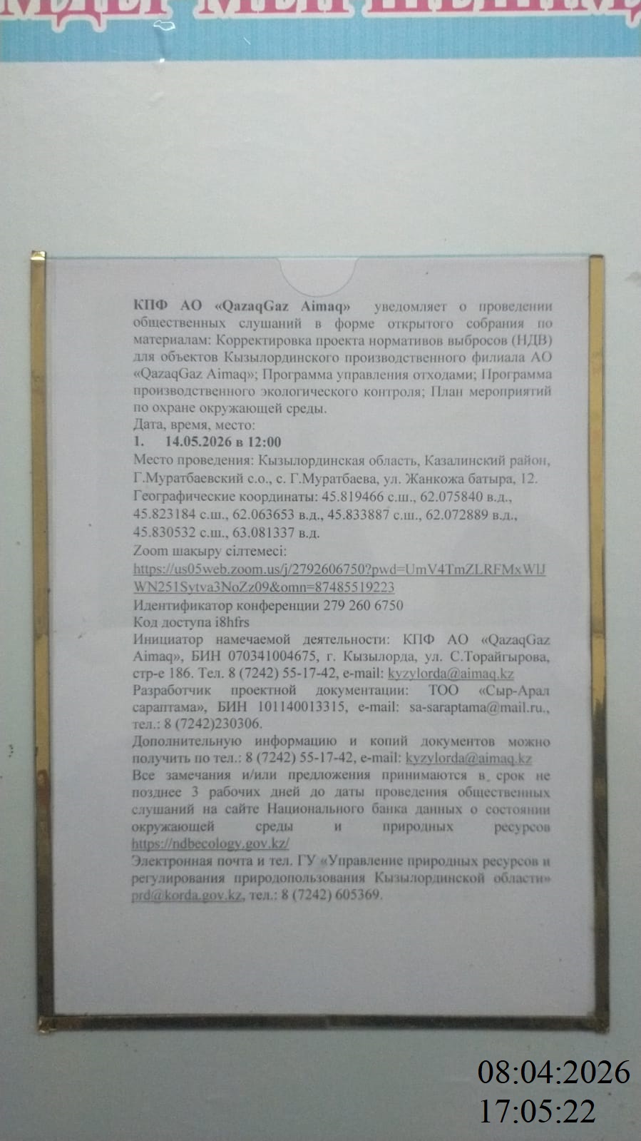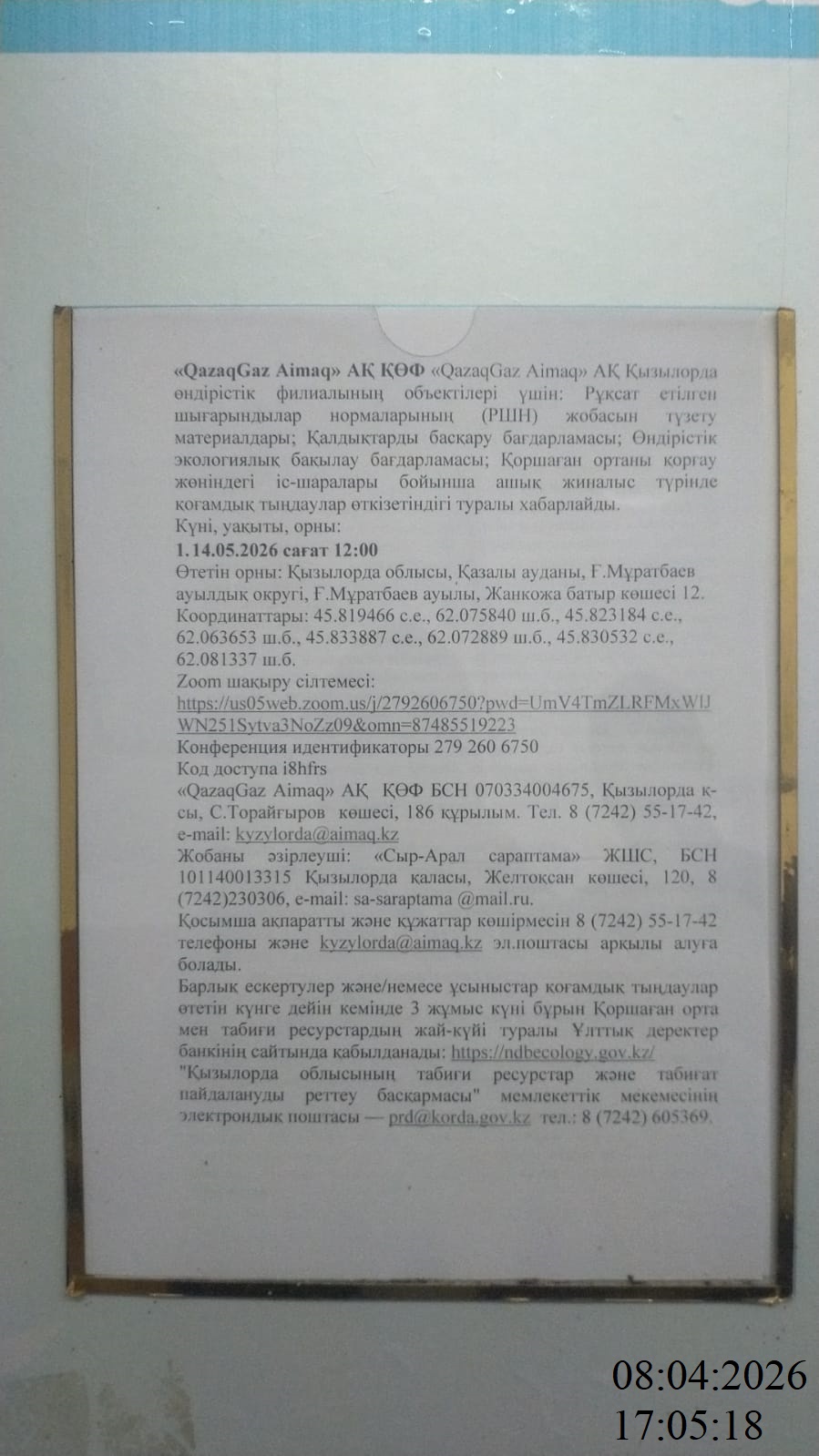 3. Общественные слушания организованны: Управление природных ресурсов и регулирования природопользования Кызылординской области, prd@korda.gov.kz 87242605362, 605369,
