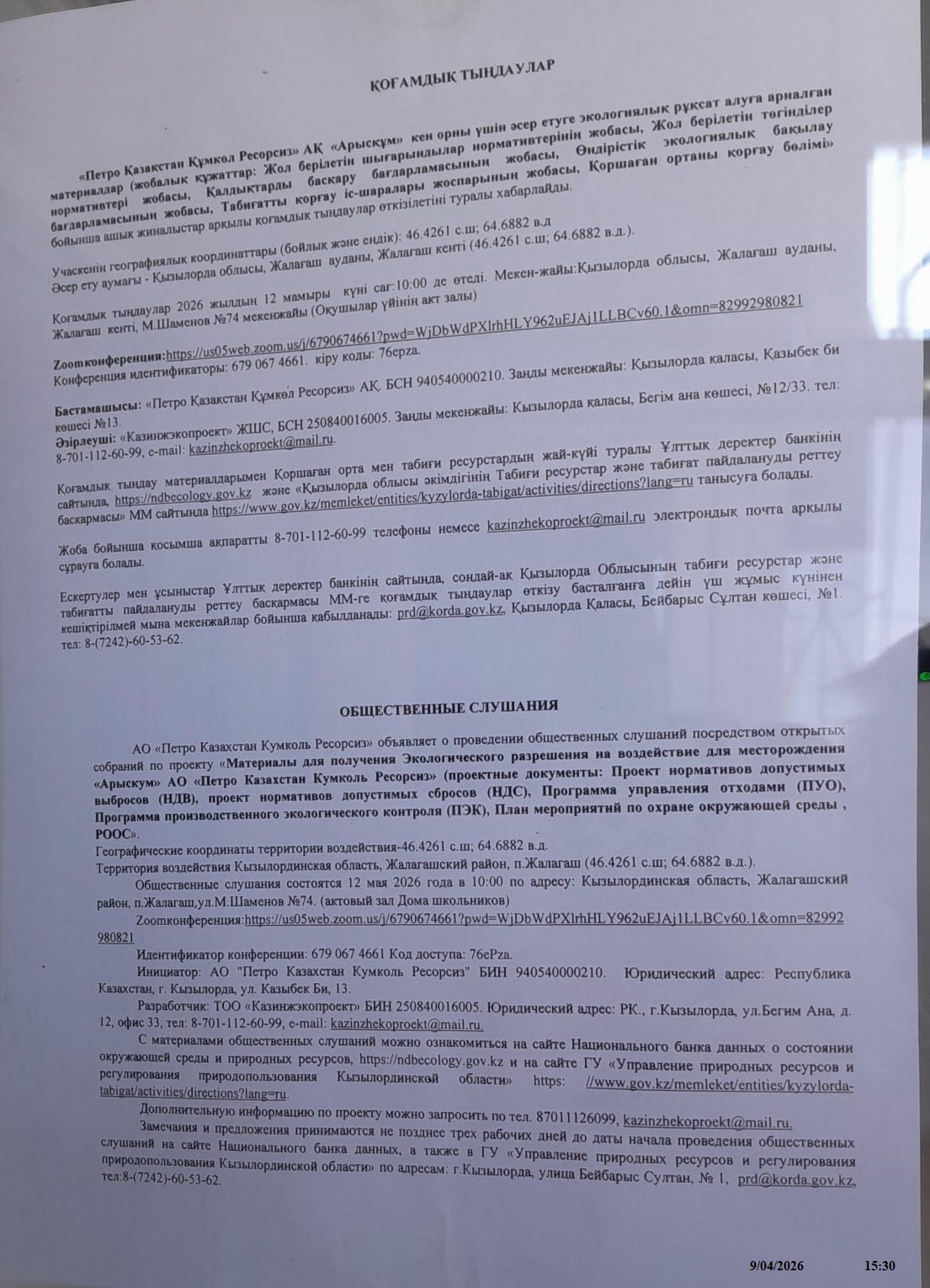 3. Общественные слушания организованны: Управление природных ресурсов и регулирования природопользования Кызылординской области, prd@korda.gov.kz 87242605362, 605369,