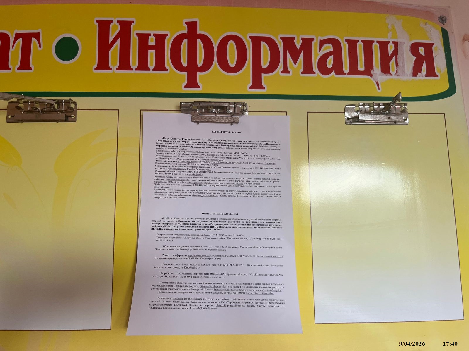 3. Общественные слушания организованны: Главный специалист УПР и ПР область Ұлытау, ulytau.obl_priroda@mail.ru,