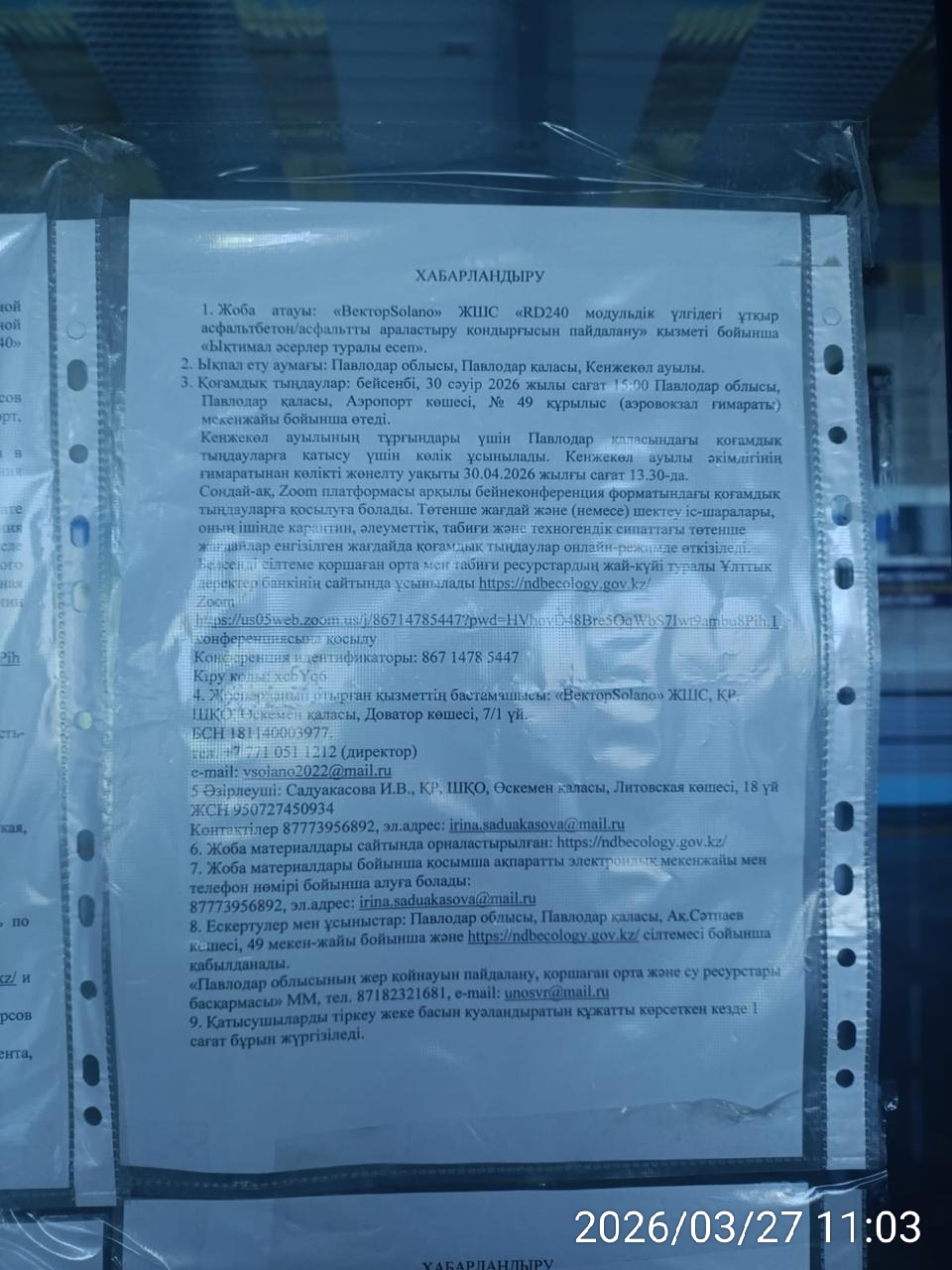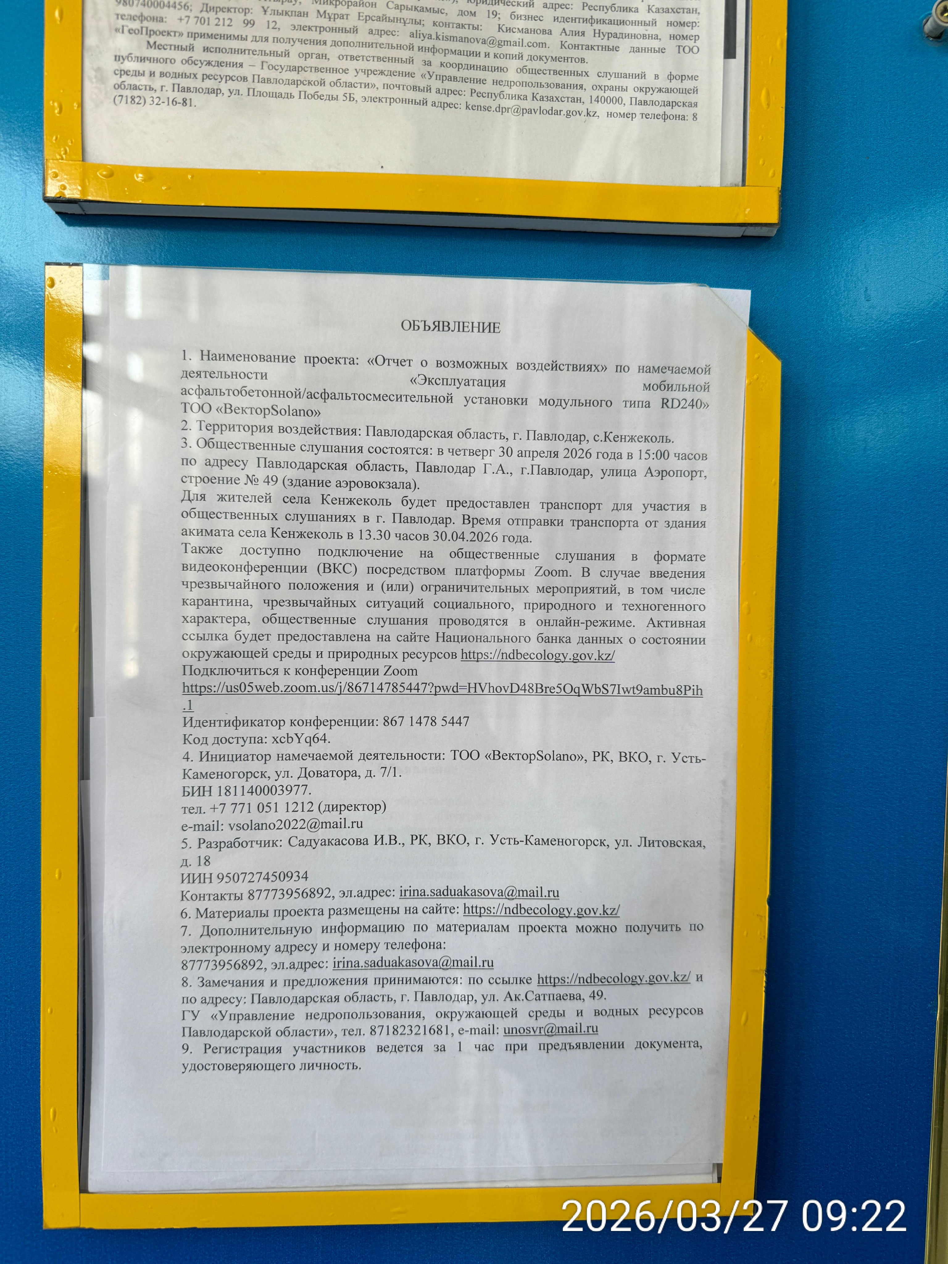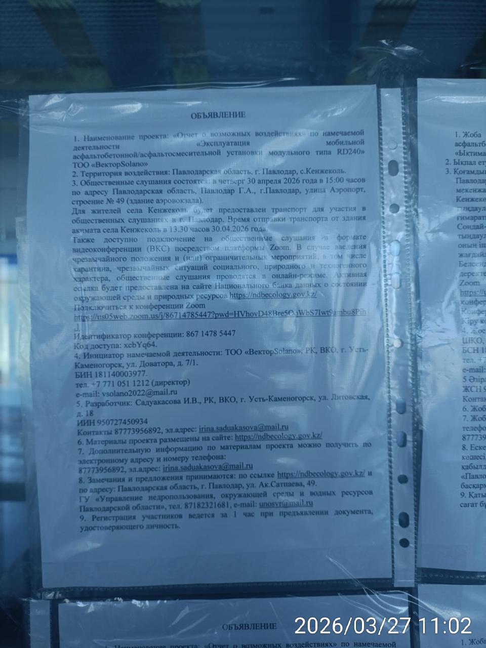 1.2. Место проведения: Павлодарская область, Павлодар Г.А., г.Павлодар, улица Аэропорт, строение № 49 (здание аэровокзала). Для жителей села Кенжеколь будет предоставлен транспорт для участия в общественных слушаниях в г. Павлодар. Время отправки транспорта от здания акимата села Кенжеколь в 13.30 часов 30.04.2026 года.
